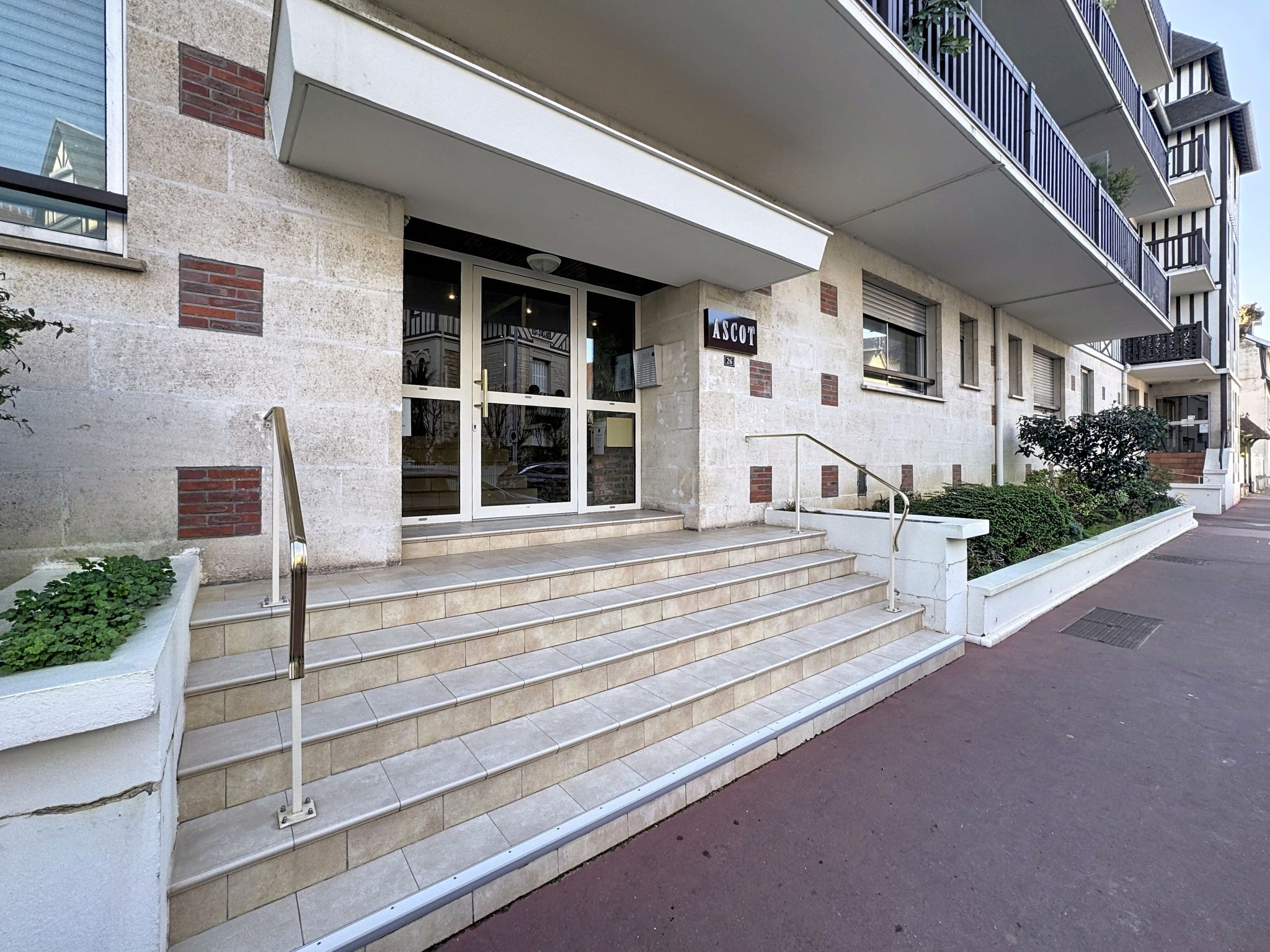 Deauville: Residence "Ascot", 4 storeys, terraced. In the resort, 350 m from the centre, in a quiet position, 1.4 km from the sea, 1.4 km from the beach, east facing position. In the complex: lift. (6 steps). Shop 350 m, supermarket 280 m, restaurant 100 m, bakery 60 m, 4 minute walk to the centre, bus stop "Gare routière" 500 m, railway station "Deauville-Trouville" 500 m, sandy beach "les planches de Deauville" 1.4 km, indoor swimming pool 1.1 km, thermal baths "thalasso de Deauville" 1.1 km. Golf course (18 hole) 3.7 km. Nearby attractions: casino de Deauville 1 km, hippodrome Deauville La Touques 1.2 km, Honfleur village normand 16 km, Mémorial de Caen 54 km, Arromanches plage du débarquement 80 km. The keys‘ handover takes place by the agency in Deauville.
