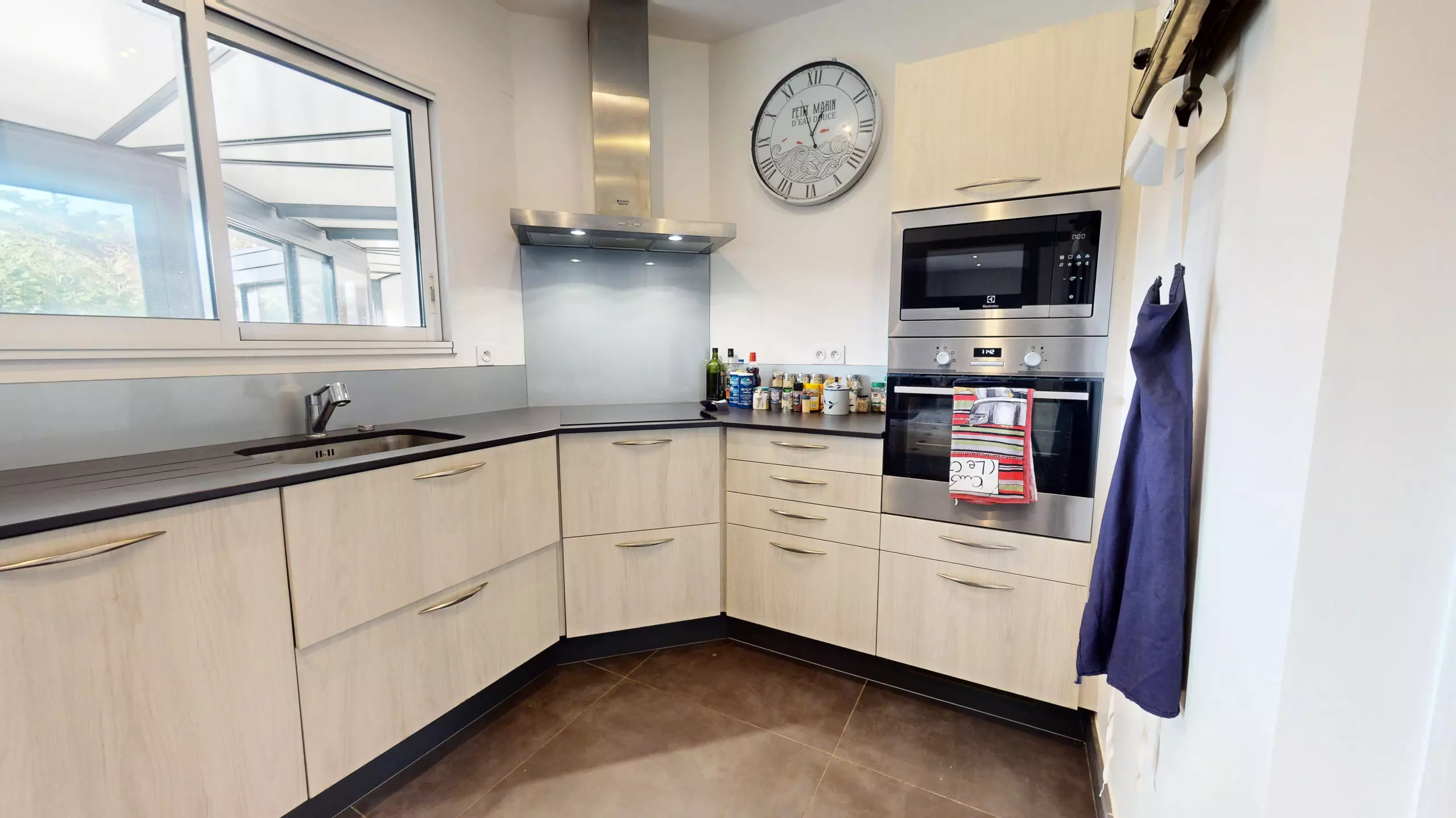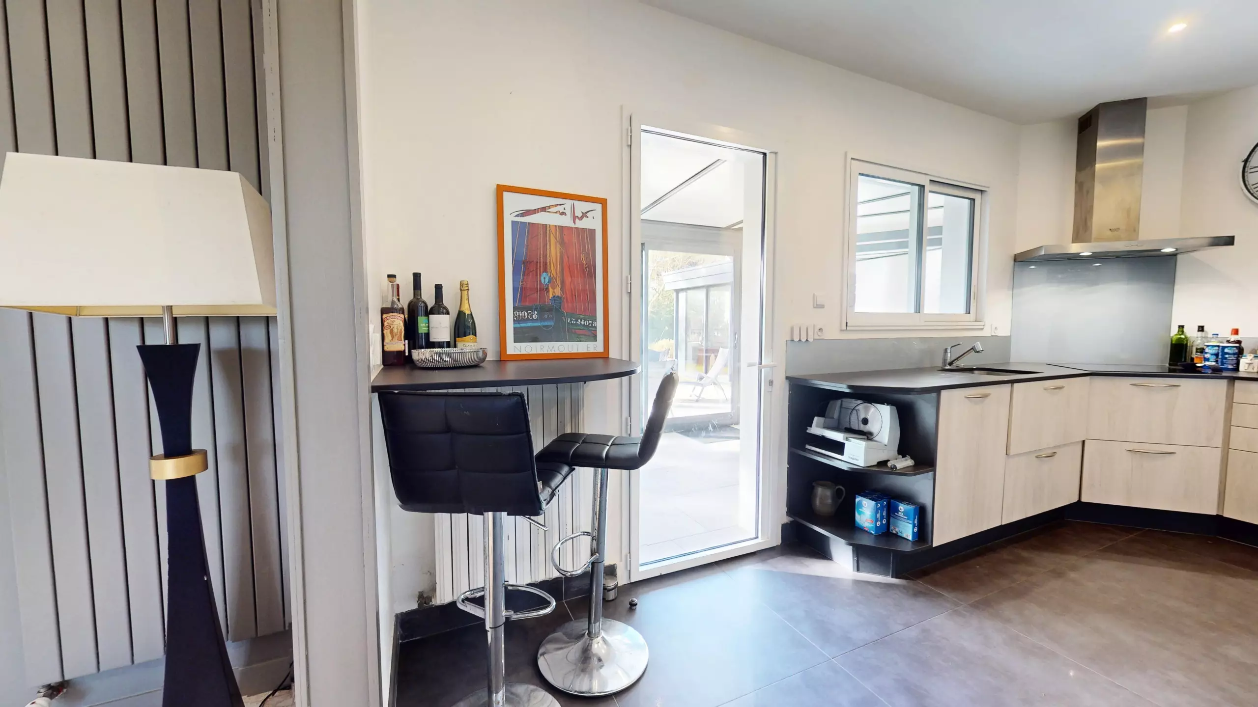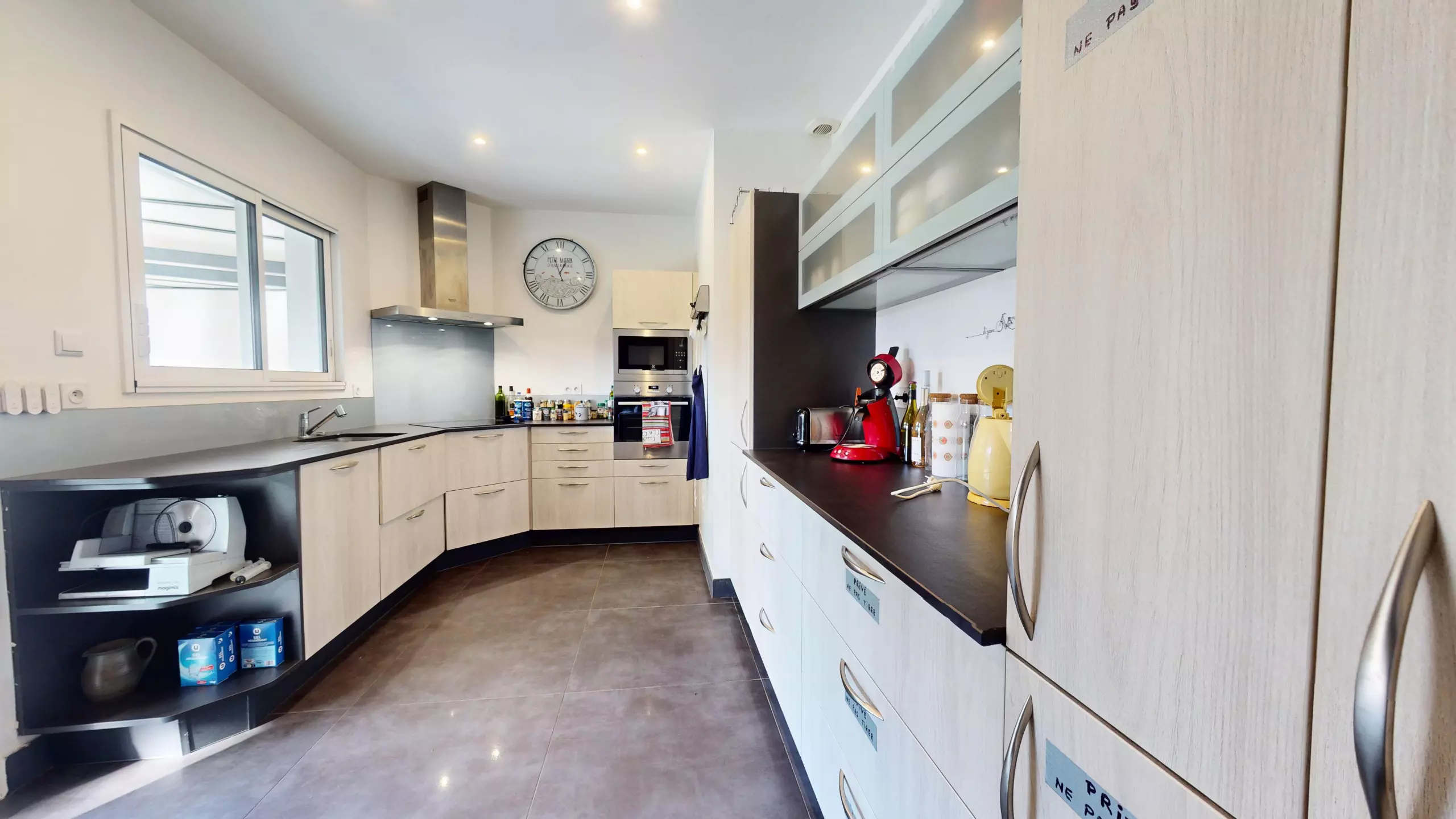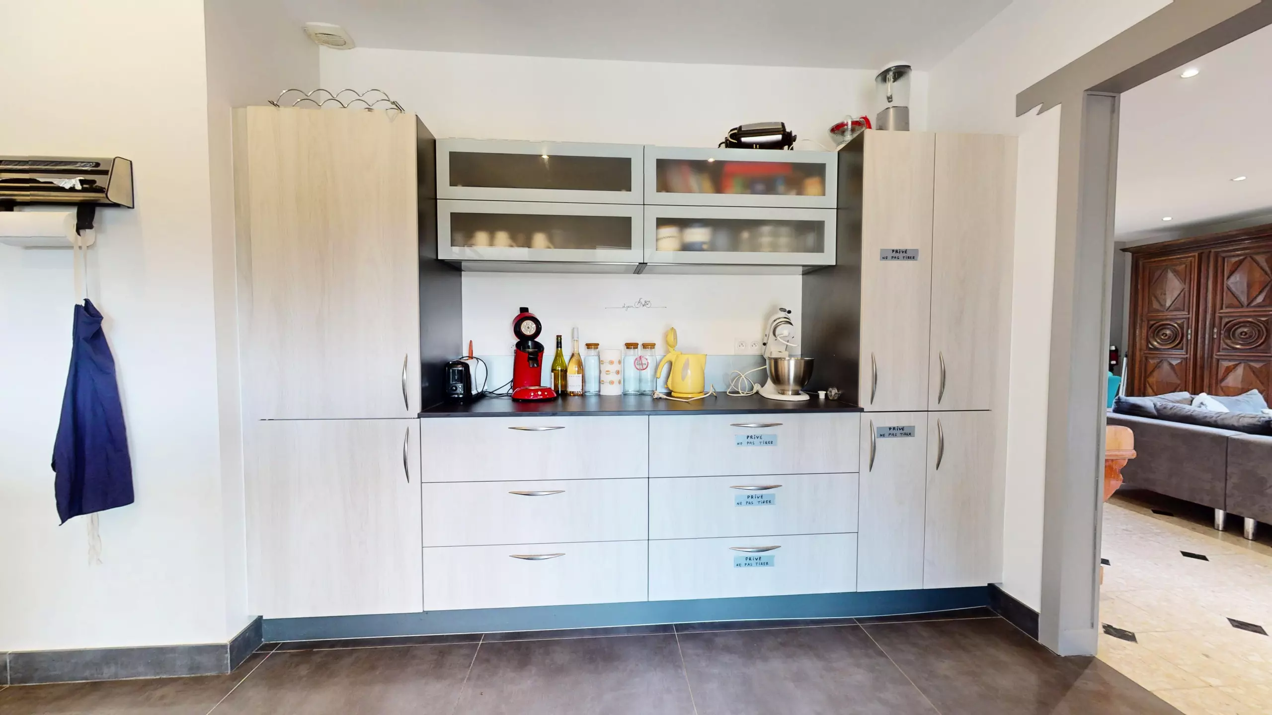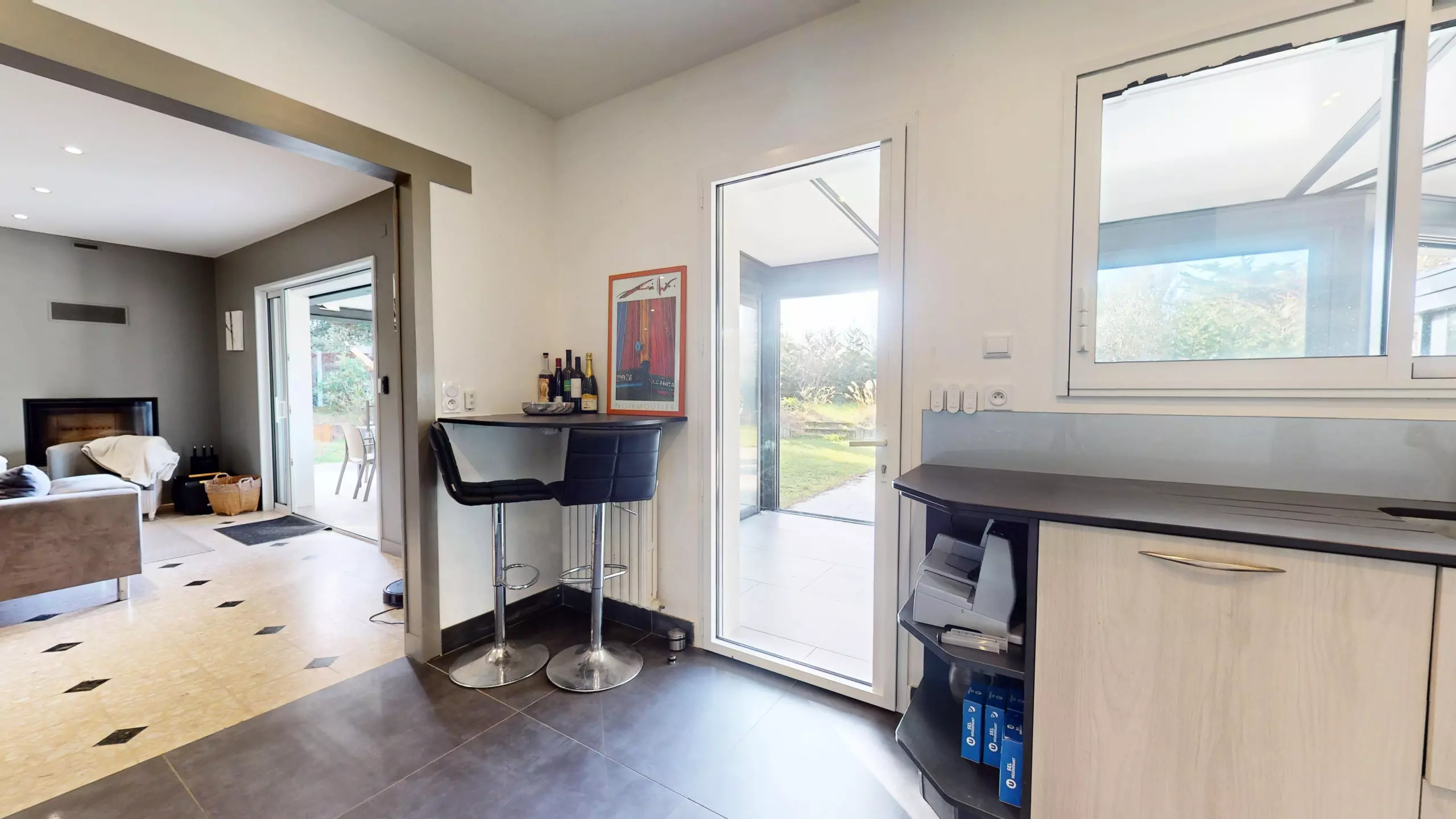 The villa has a very large, modern and fully equipped open kitchen with induction hobs, plenty of storage and a mini-bar area, ideal for cooking and sharing convivial moments.