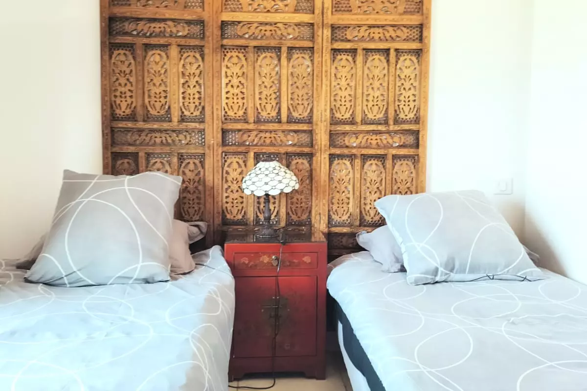 The accommodation includes a bedroom with a double bed of 160x190 and a second bedroom equipped with two single beds of 90x190.