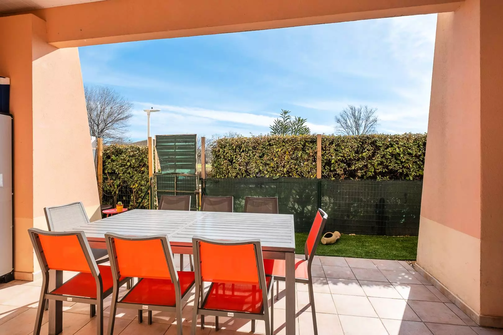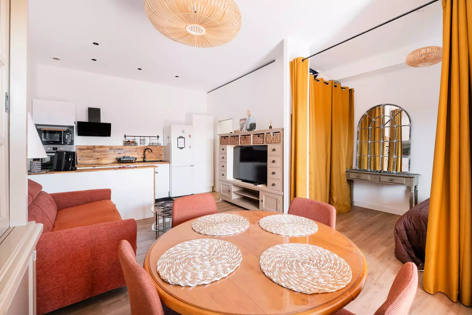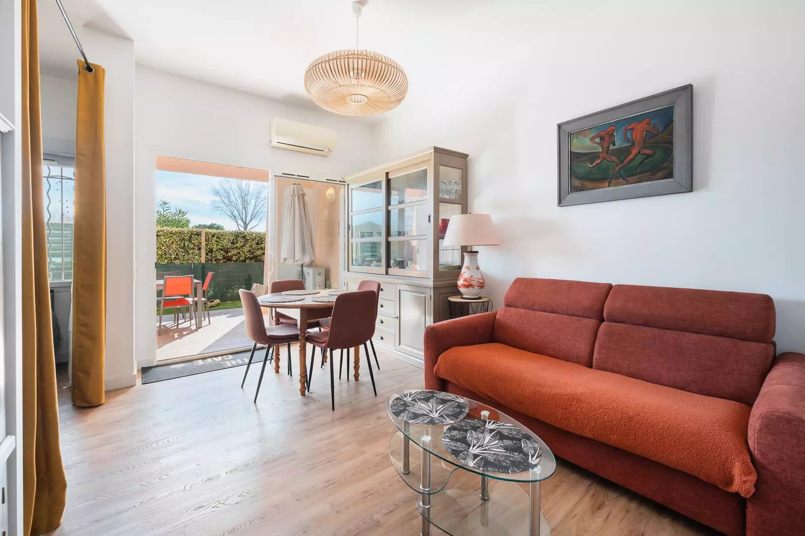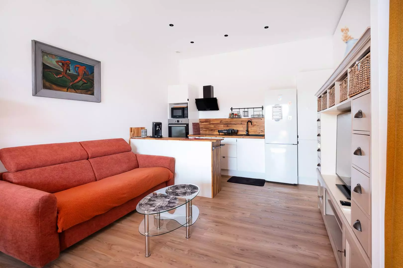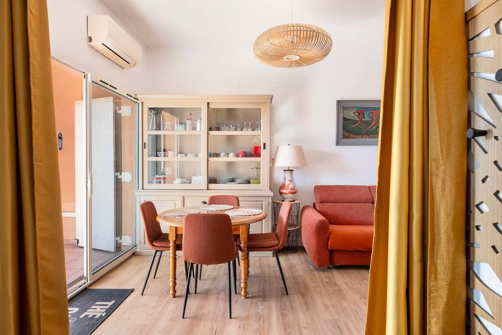 The separate bedroom, divided by a curtain, has a 140cm double bed and a window opening onto the 25m² terrace. The bathroom has a washing machine and a toilet. The apartment is furnished and equipped to accommodate up to 4 people.