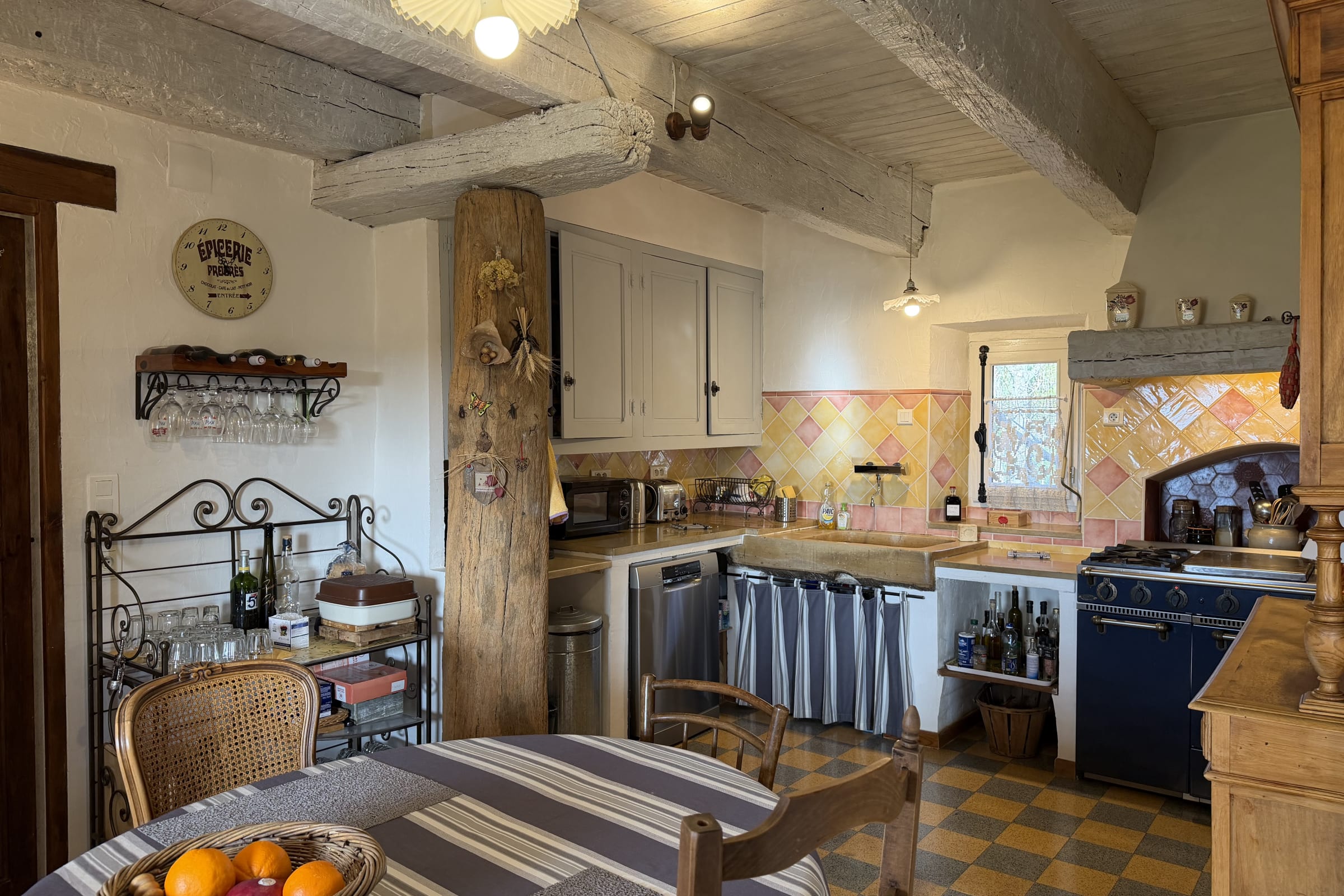 The space features a beautiful stone sink, adding an authentic touch to the room. A Godin gas stove with oven, complemented by an induction hob on top and an extractor hood, allows you to cook with ease.