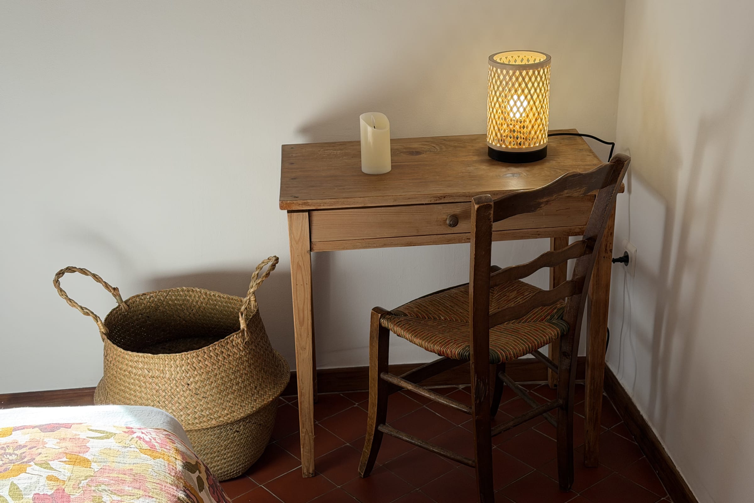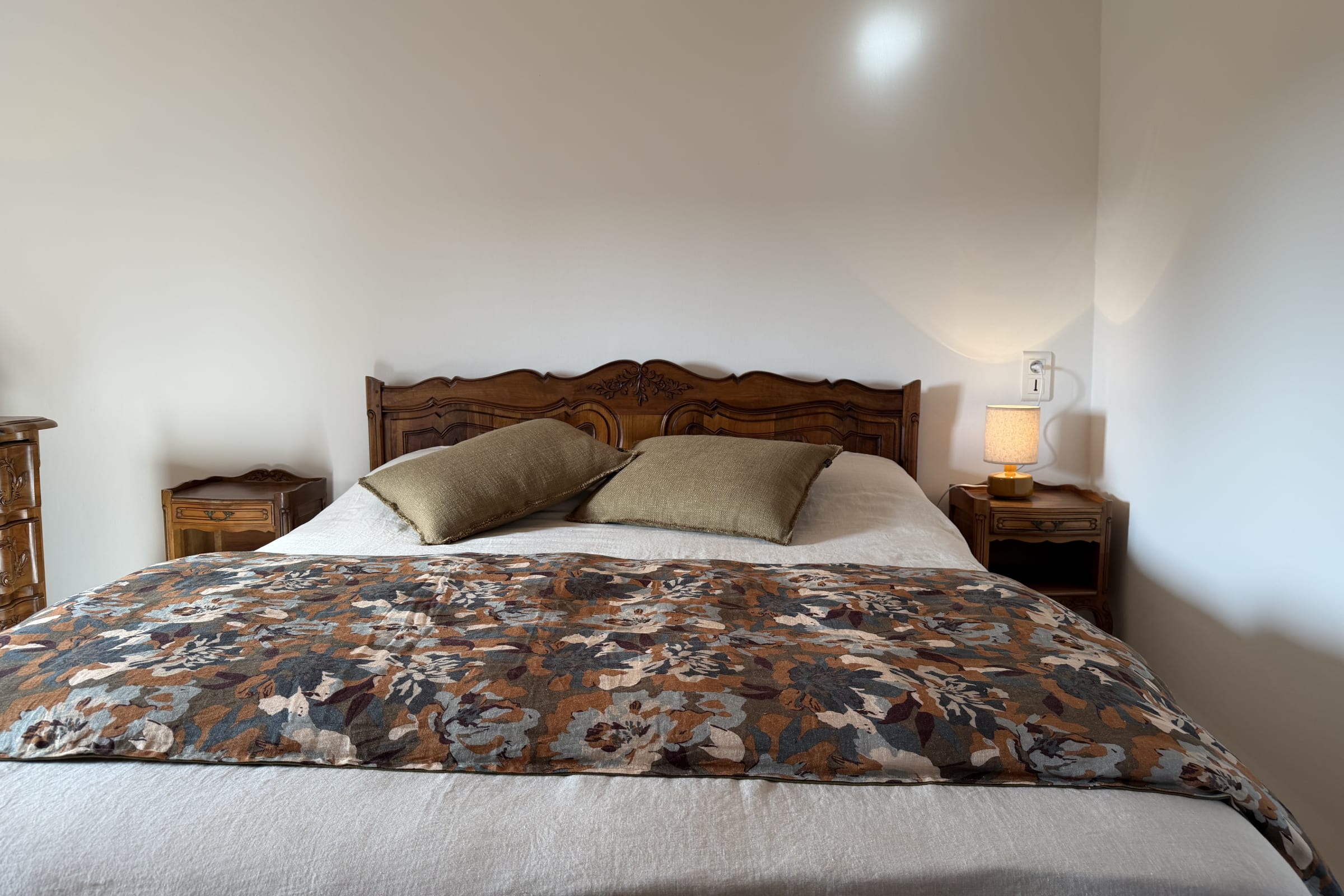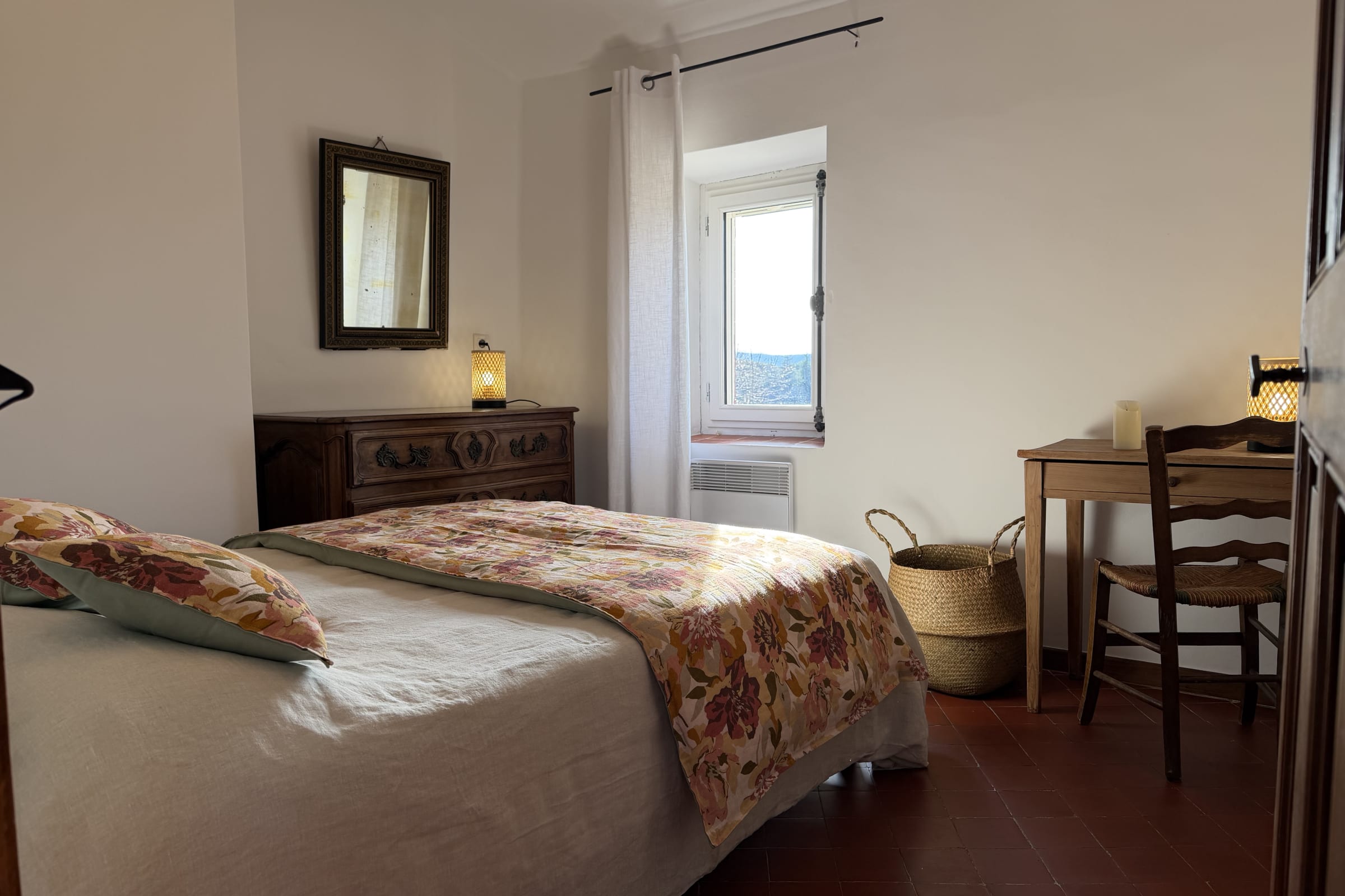The room includes a beautiful walnut chest of drawers offering practical storage for personal belongings. A desk is also available, perfect for working or writing in peace.