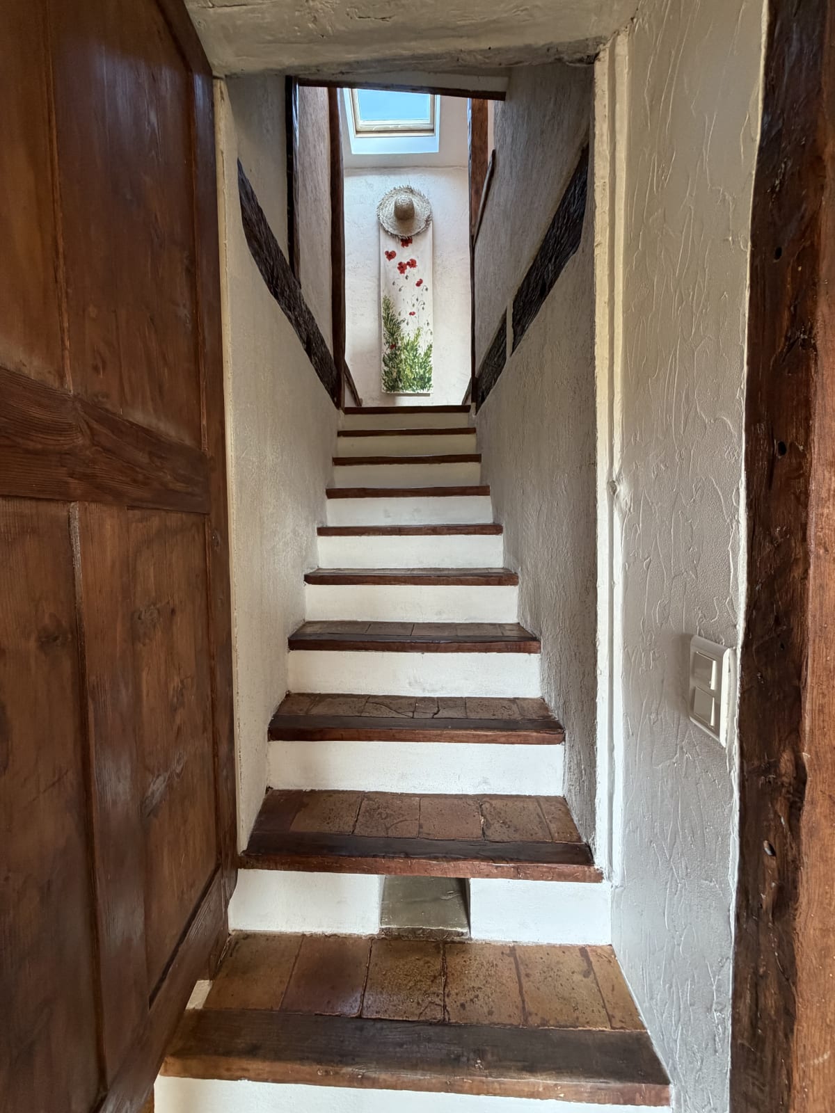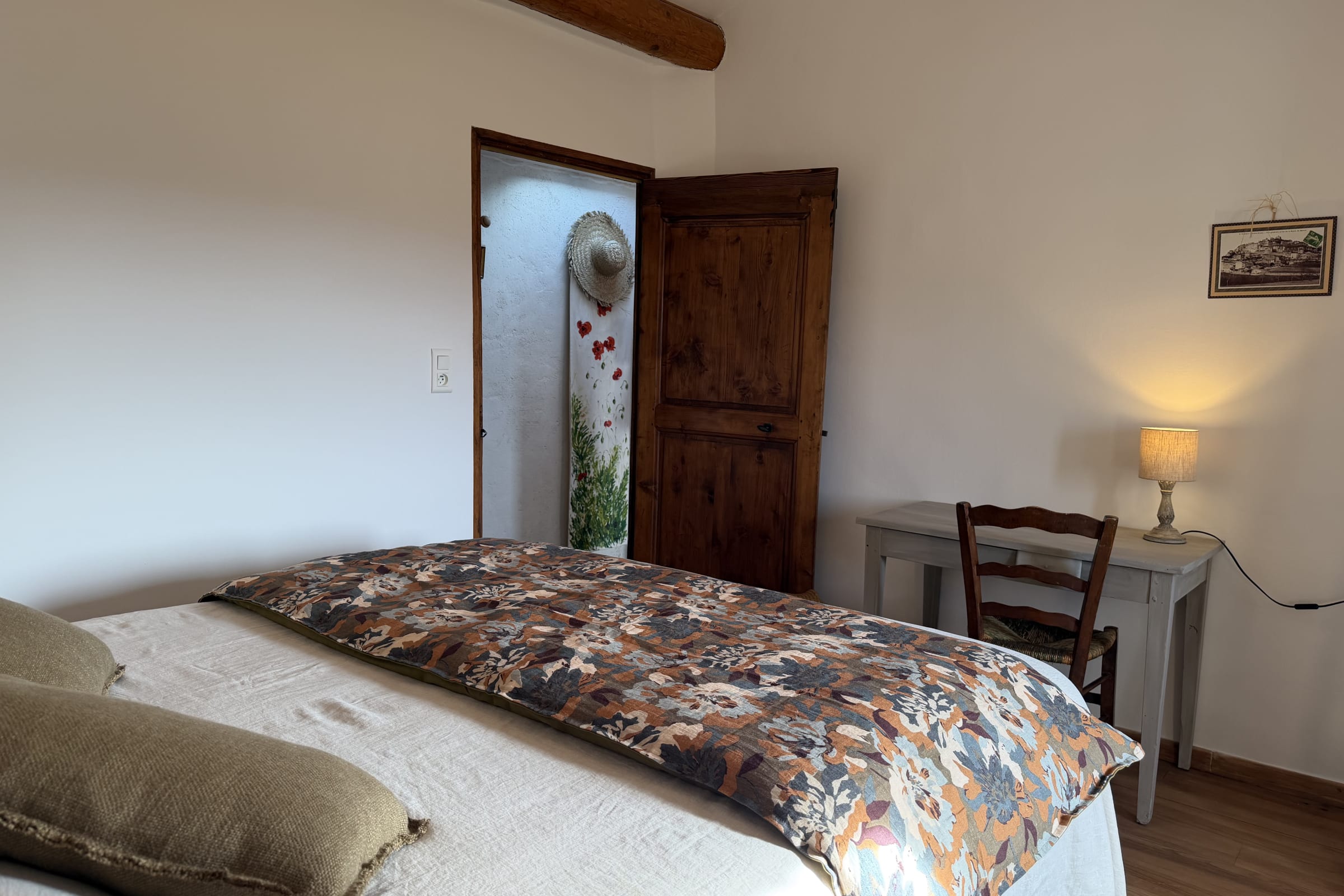Upstairs, the corridor leading to the bedrooms and bathroom is tastefully decorated. A walnut bedside table adds an authentic and elegant touch to this space.