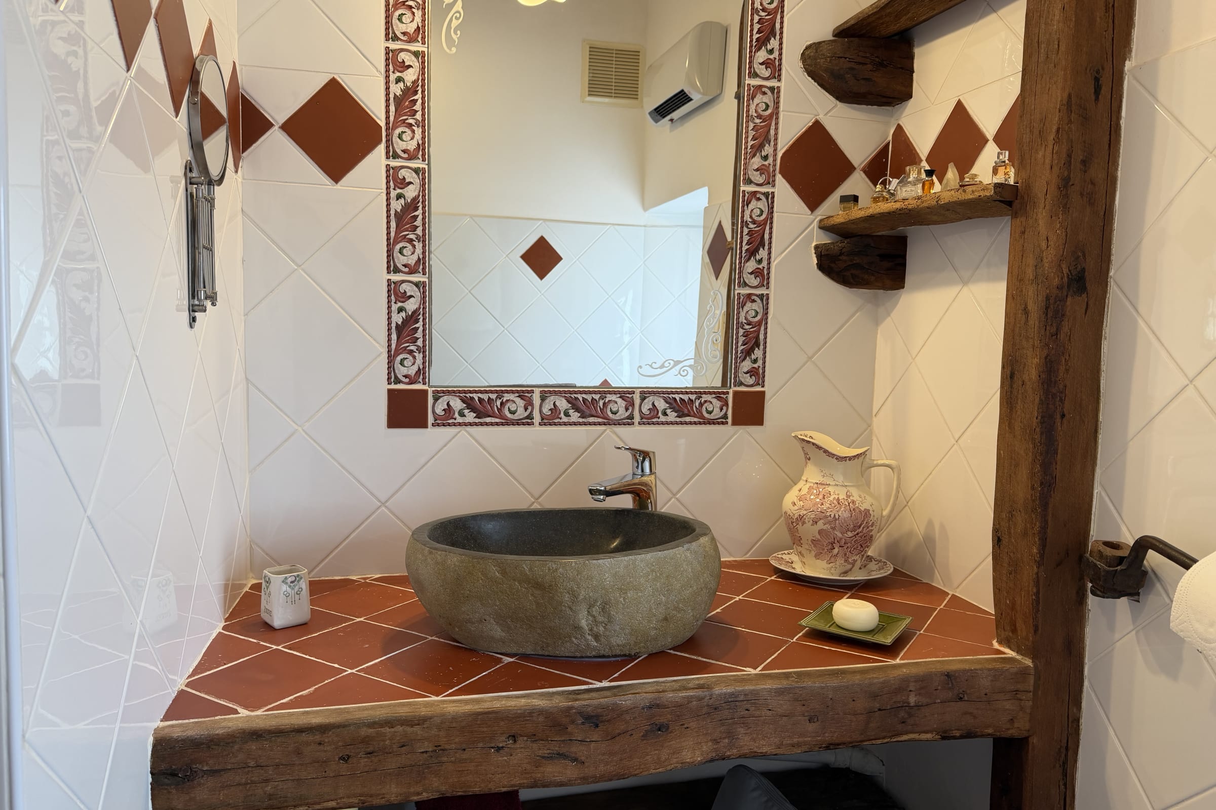 🚿 The shower room, located next to the bedroom, combines charm and authenticity. It features a comfortable shower, a beautiful stone sink, and a toilet, adding a natural and elegant touch to the space.