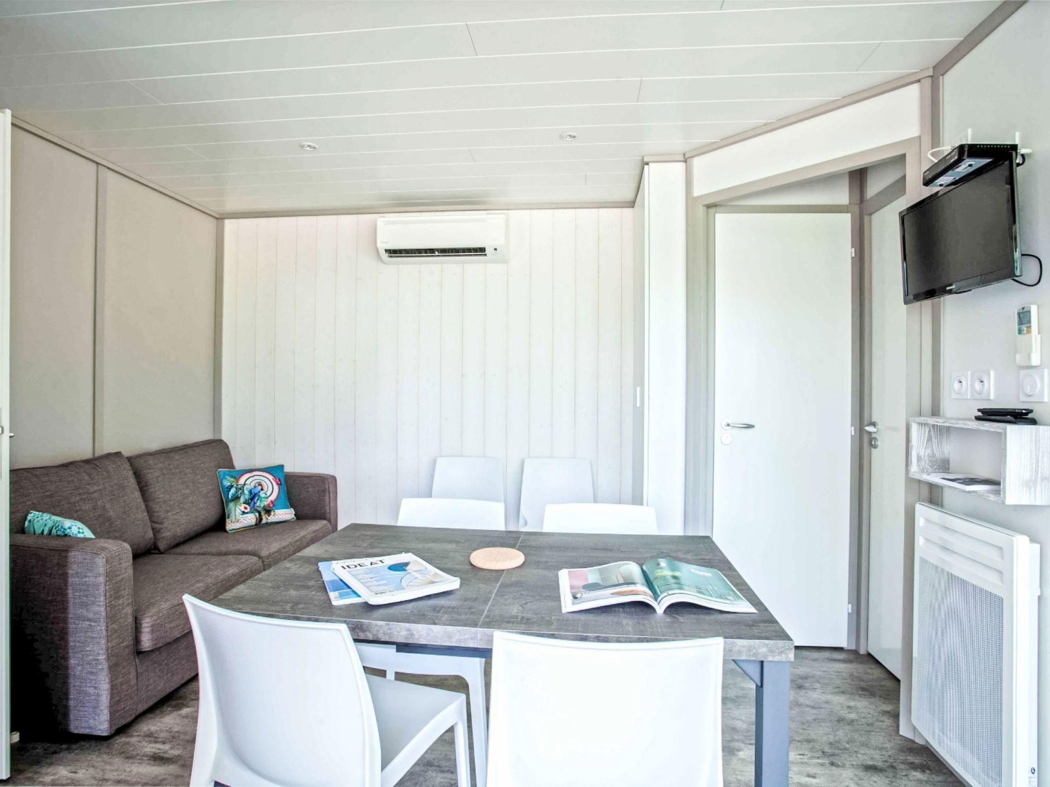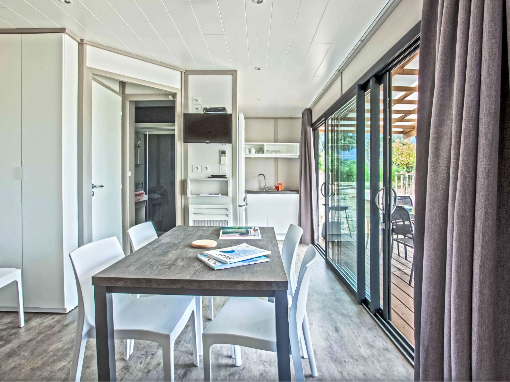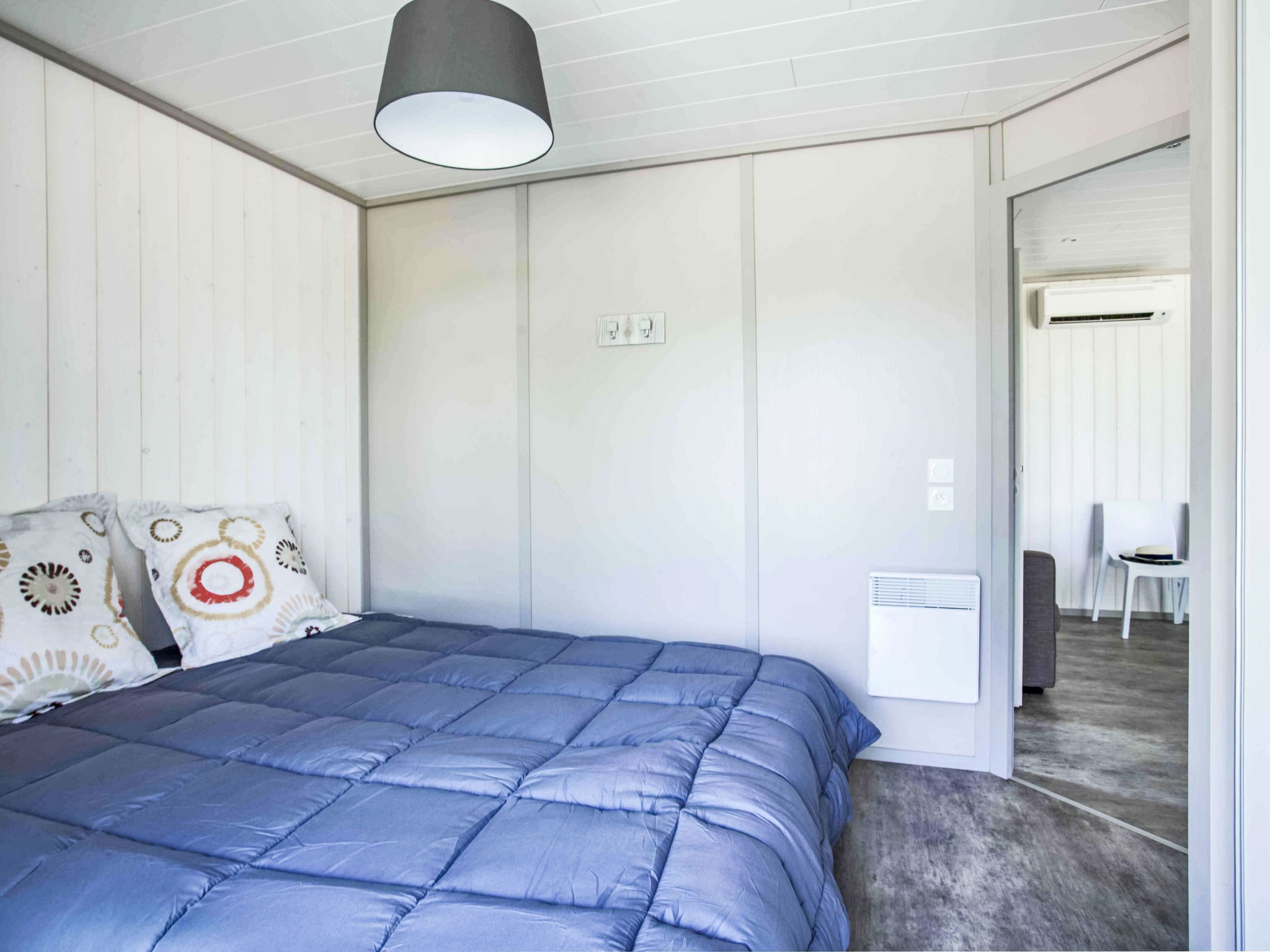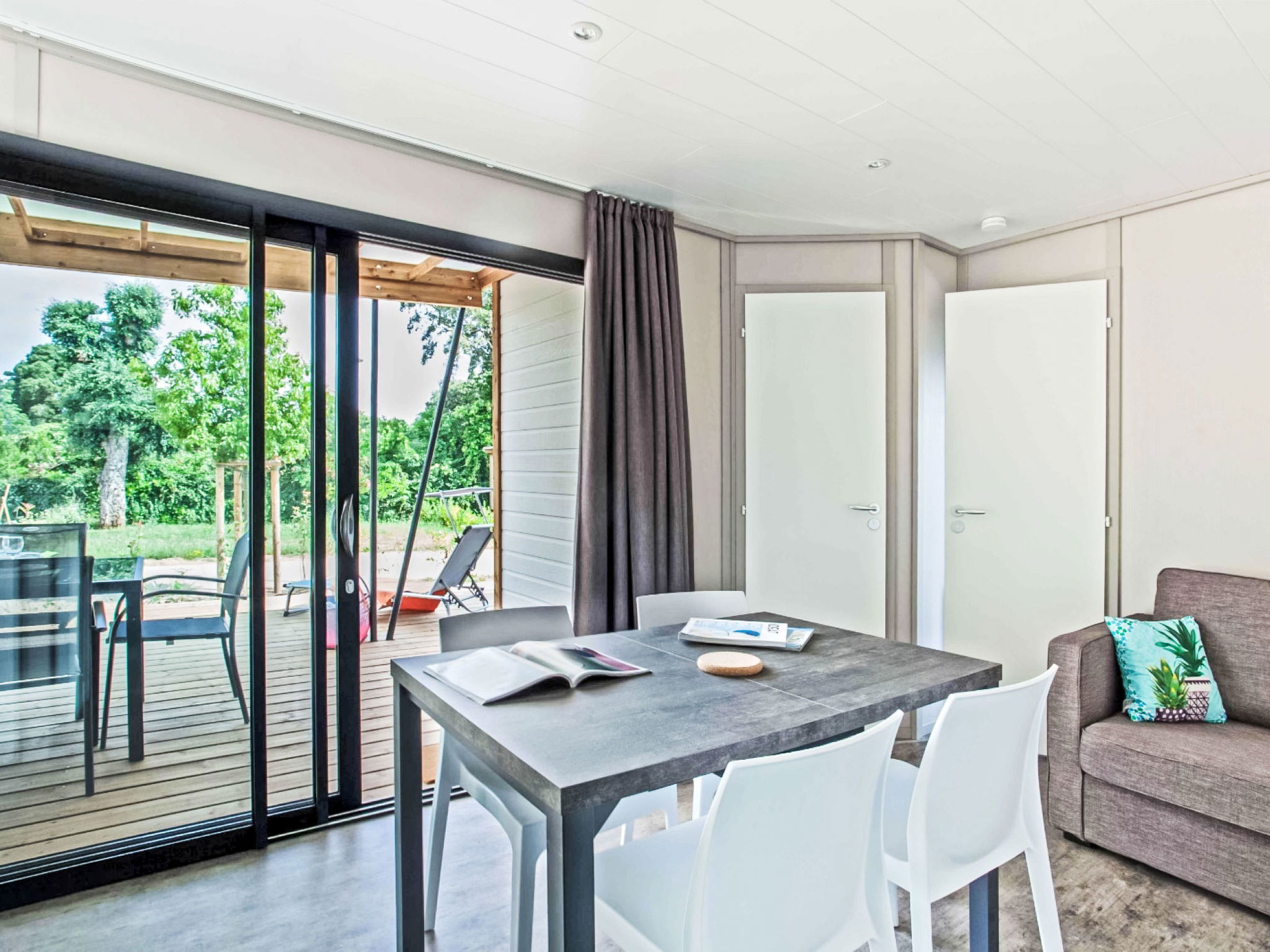 "Lodge Natura 4p", 3-room chalet 37 m2. Comfortable furnishings: living/dining room with dining table and TV (flat screen), air conditioning. Exit to the terrace. 1 room with 1 french bed (160 cm, length 200 cm). 1 room with 2 beds (90 cm, length 190 cm). Kitchenette (oven, dishwasher, 3 induction hot plates, toaster, kettle, microwave, electric coffee machine). Shower, sep. WC. Electric heating. Terrace partly roofed, small garden. Terrace furniture, barbecue (portable). Facilities: children's high chair, baby cot (extra), hair dryer. Internet (WiFi, free). Parking (fenced). Please note: non-smokers only. Smoke alarm. Offer by a commercial proprietor according to Art. 155, IV, CGI