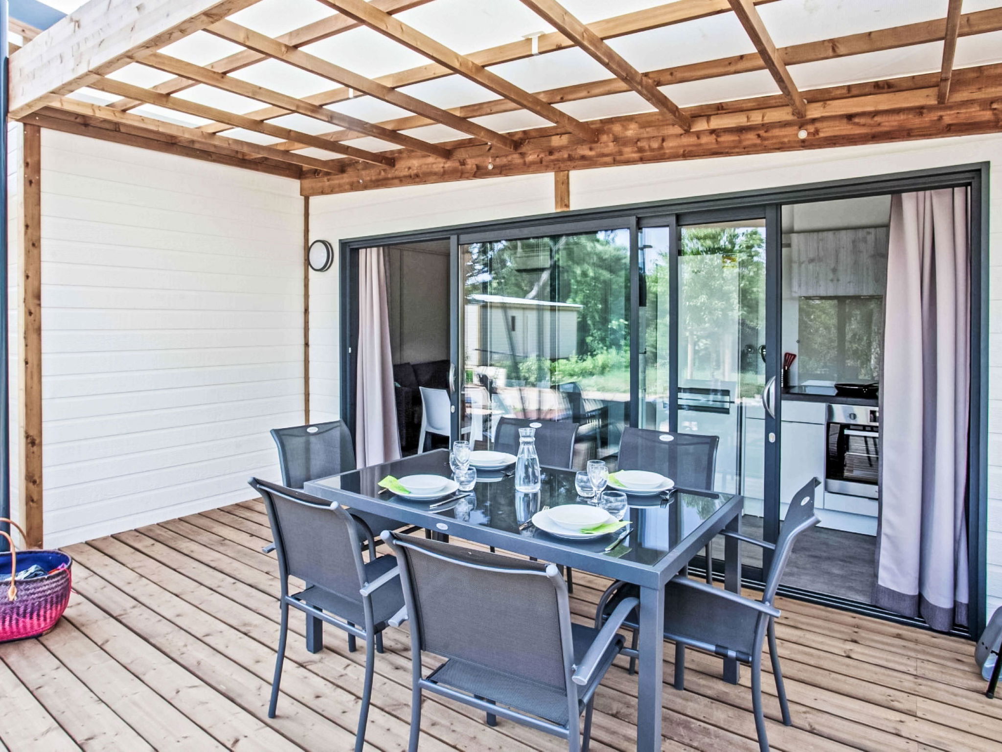 "Lodge Premium 5p", 3-room chalet 40 m2. Comfortable furnishings: living/dining room with dining table and TV (flat screen), air conditioning. Exit to the terrace. 1 room with 1 french bed (160 cm, length 200 cm). 1 room with 1 bed (90 cm, length 190 cm), 1 x 2 bunk beds (90 cm, length 190 cm). Kitchenette (oven, dishwasher, 3 induction hot plates, toaster, kettle, microwave, electric coffee machine). Shower, sep. WC. Electric heating. Terrace partly roofed, small garden. Terrace furniture, barbecue (portable). Facilities: hair dryer. Parking (fenced). Please note: non-smokers only. Smoke alarm. Offer by a commercial proprietor according to Art. 155, IV, CGI