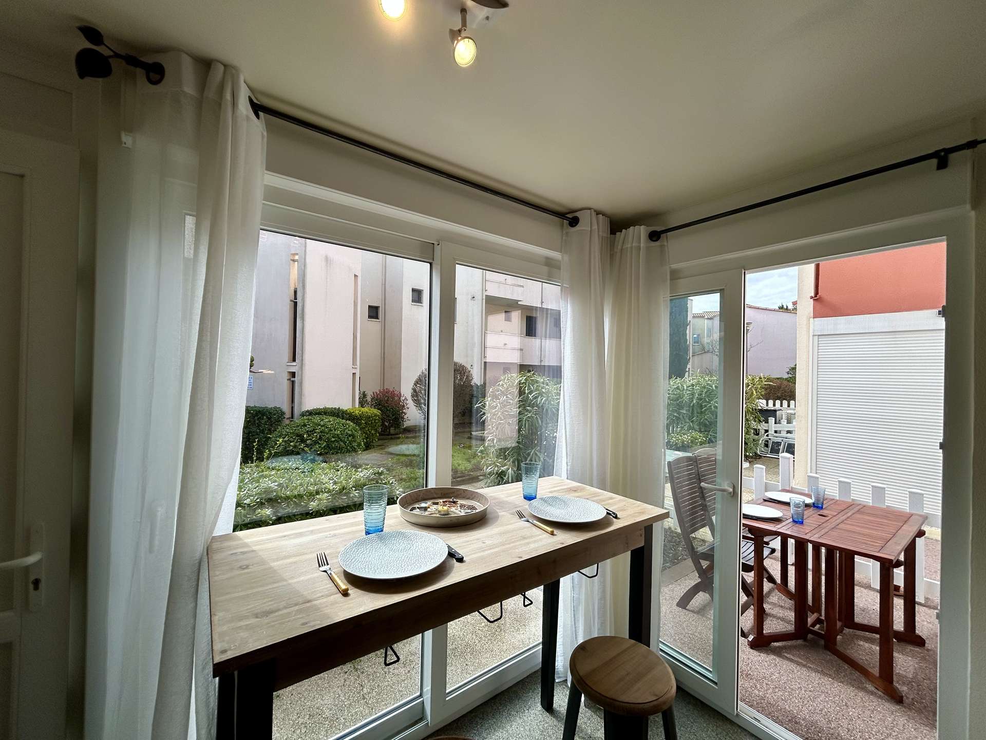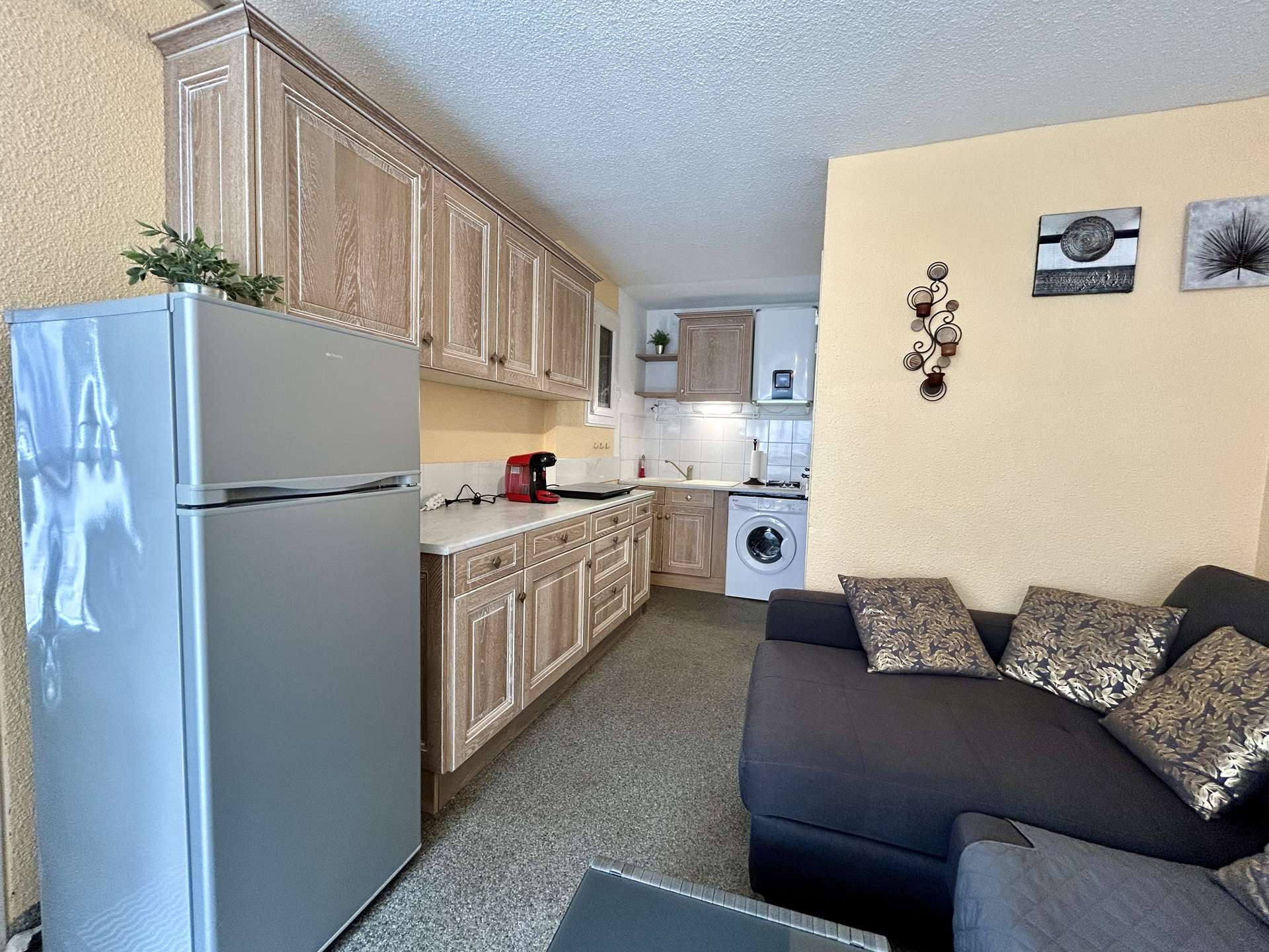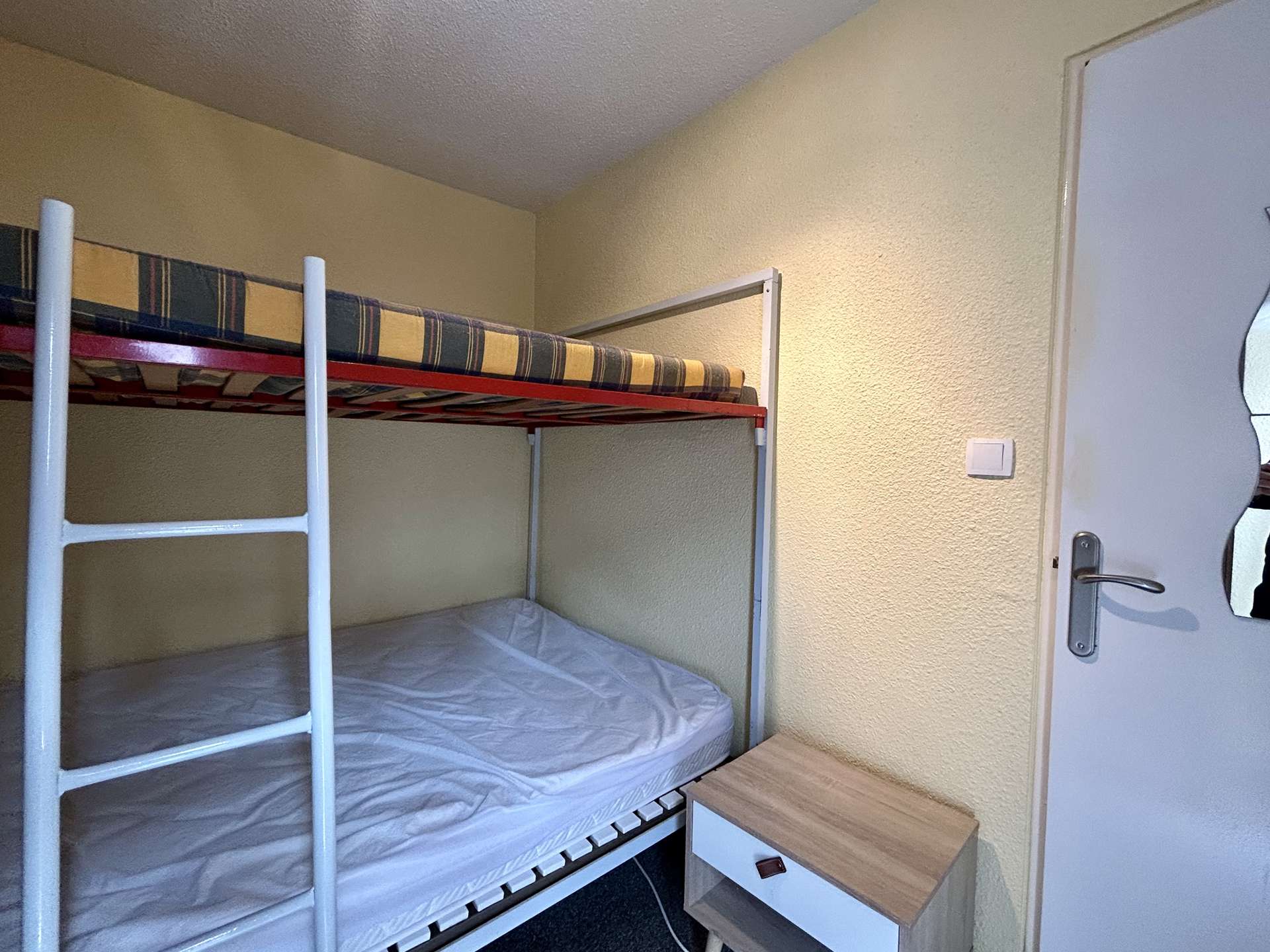 Cette location d’appartement, située en rez-de-jardin, vous offre un séjour ouvert sur la cuisine avec canapé et télévision, une chambre avec des lits superposés dont un lit double, une cuisine équipée, une salle d’eau ainsi qu’un WC indépendant.