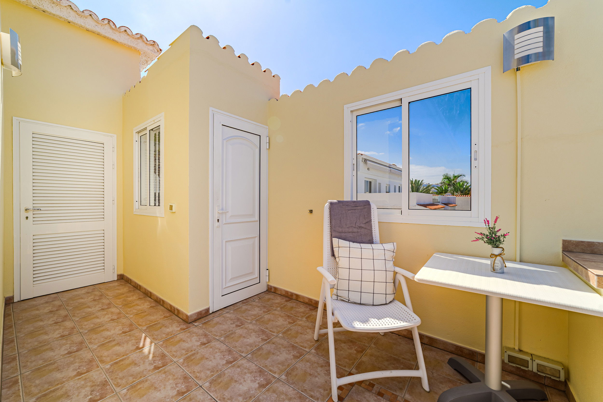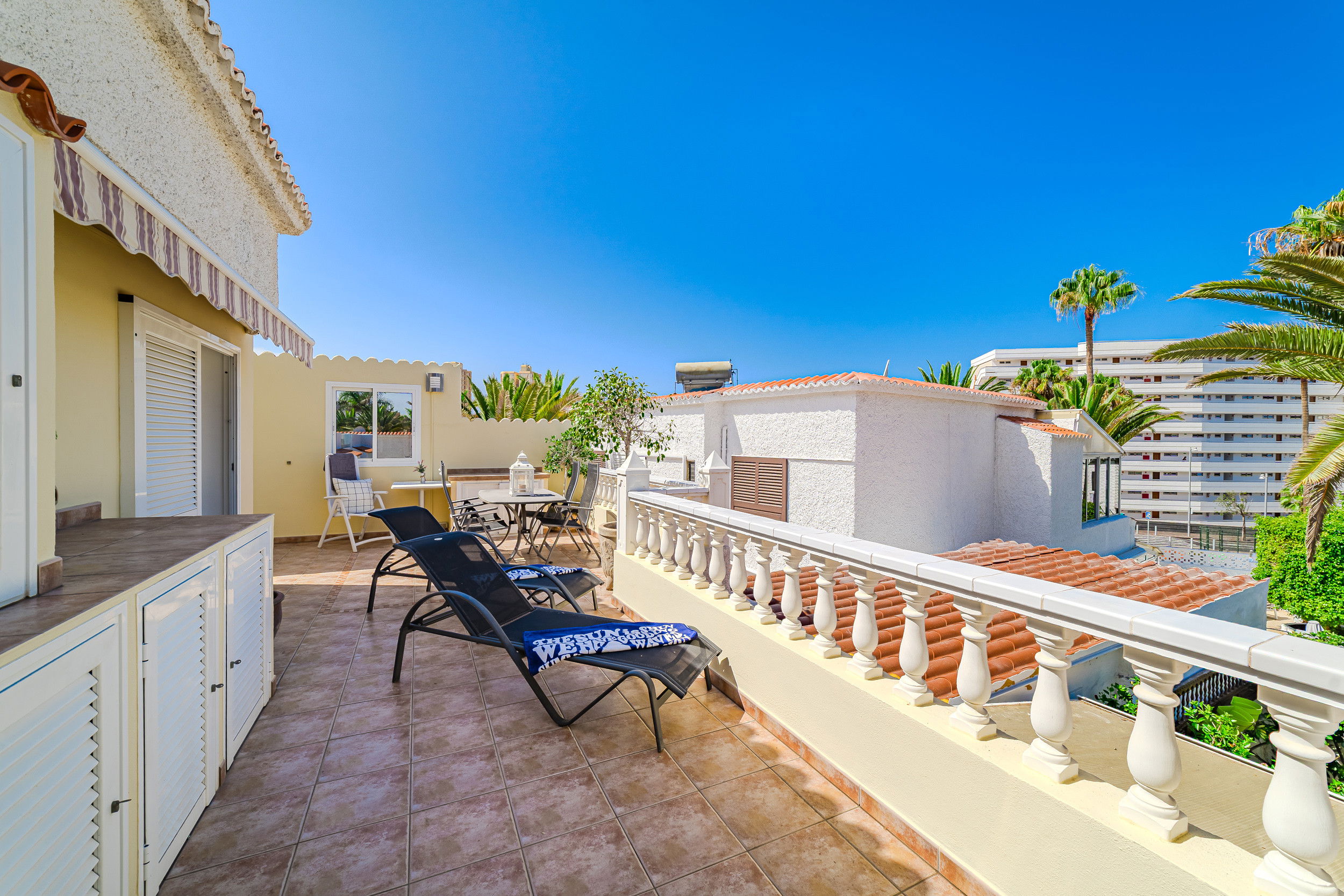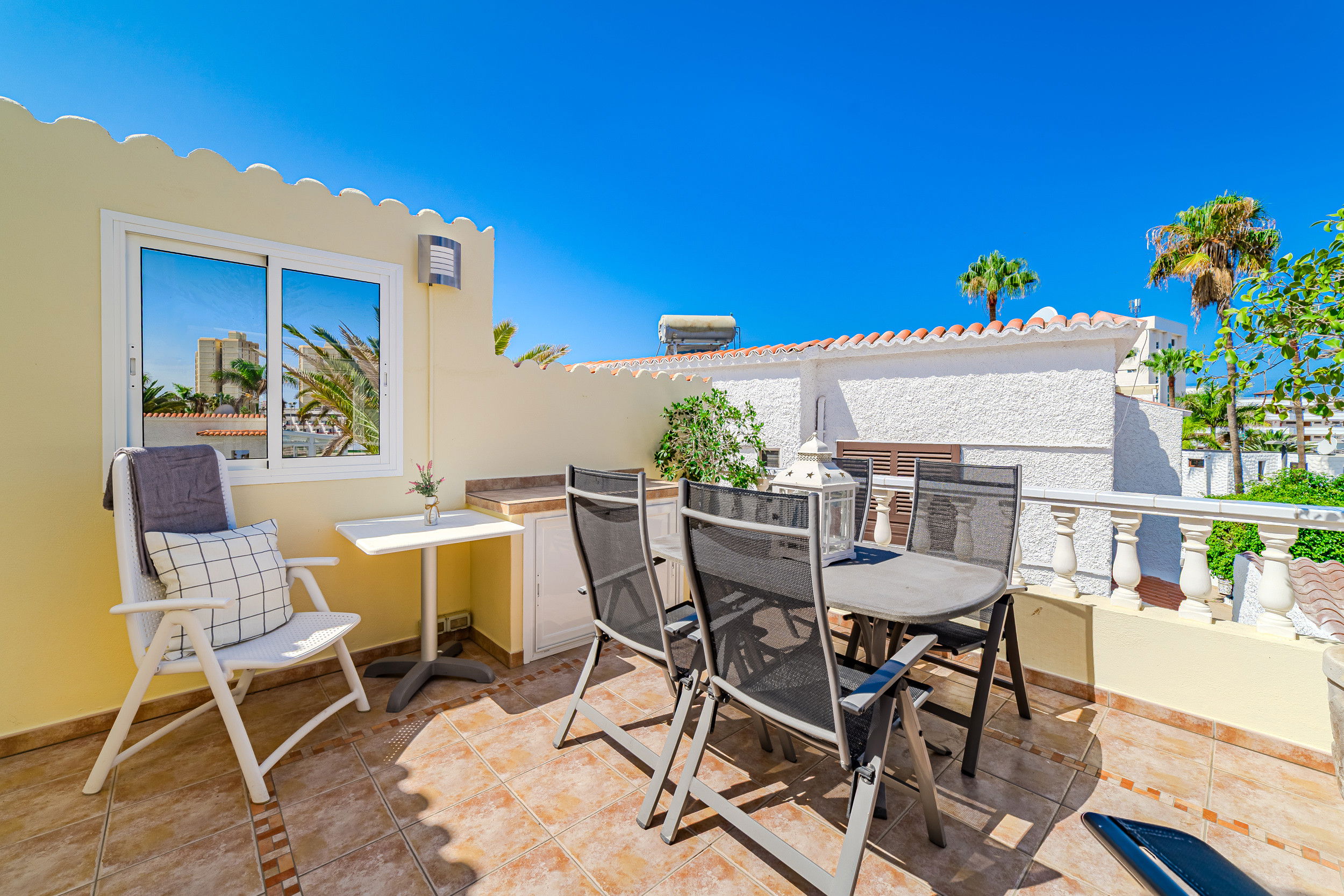 Welcome to a newly renovated apartment that leaves nothing to be desired. Just 200 metres from Tenerife's most beautiful beach promenade, you will find stylishly furnished accommodation in a well-maintained and quiet complex – ideal for those seeking comfort, tranquillity and proximity to the sea. The apartment has three bedrooms – two with comfortable double beds and one with a cosy sofa bed. In addition, there is a large sofa bed for two more people in the living area. The modern bathroom is as high-quality as it is functional. A special highlight is the light-filled conservatory, which houses the dining area – perfect for convivial evenings or relaxed breakfasts. If you want to do a little work while on holiday, you will find a practical desk in the living area. The spacious terrace with sea views is ideal for sunbathing and relaxing. The heated communal pool – new this year – rounds off the offer and ensures year-round bathing pleasure. Here you are just a few steps away from restaurants, cafés, shopping facilities and, of course, the Atlantic Ocean. Whether as a family, couple or digital nomad, this apartment is the perfect starting point for unforgettable days in Tenerife.