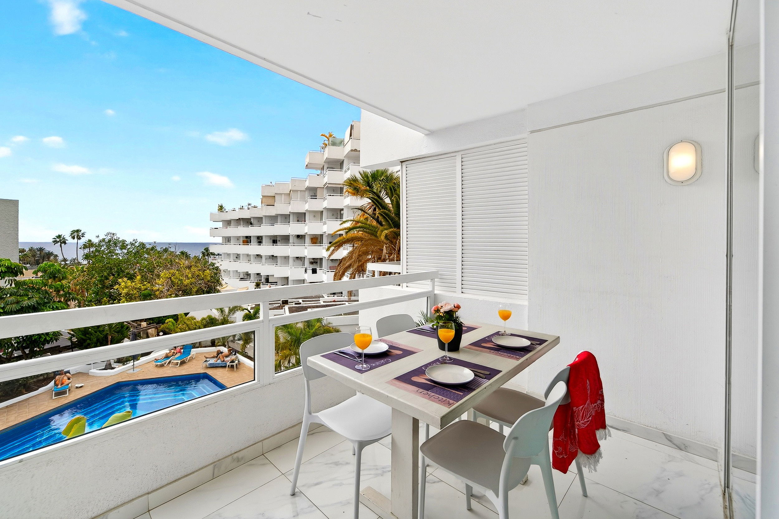 Enjoy your holiday in this stylishly furnished apartment with breathtaking sea views directly from the private terrace. The Ponderosa complex boasts a prime location in the heart of Playa de las Americas, just a few minutes' walk from the best beaches, restaurants and shopping facilities.