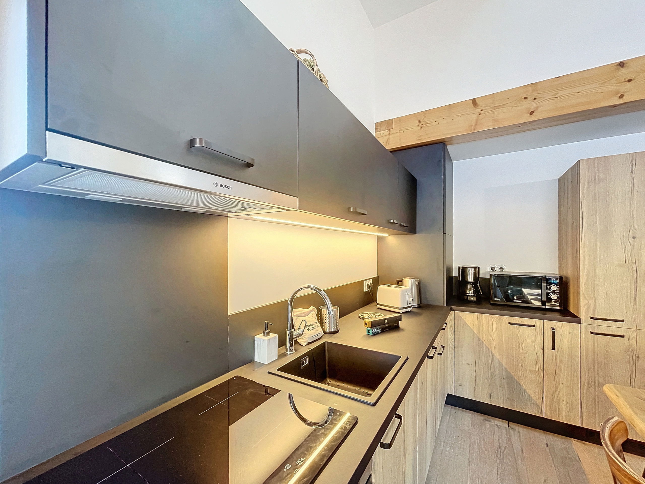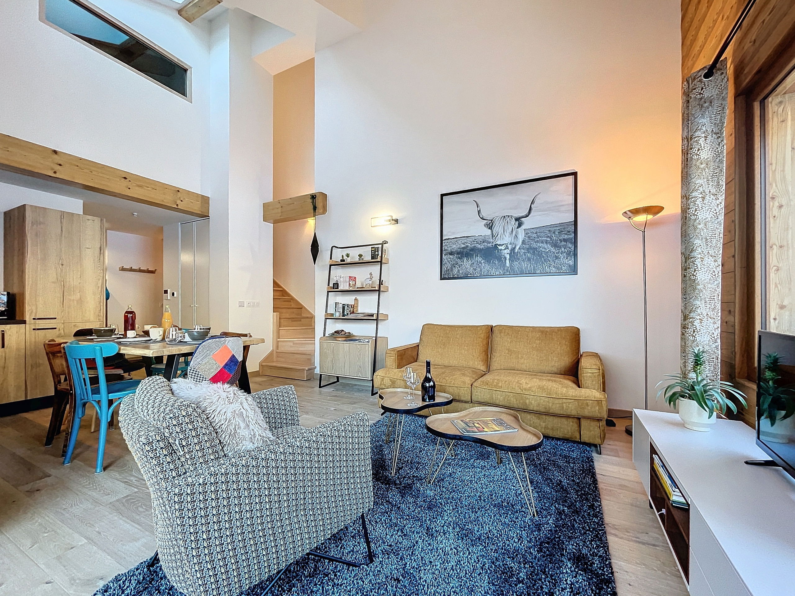 Its warm and friendly living room opens onto a fully equipped modern kitchen, perfect for preparing delicious meals after a day of adventure.