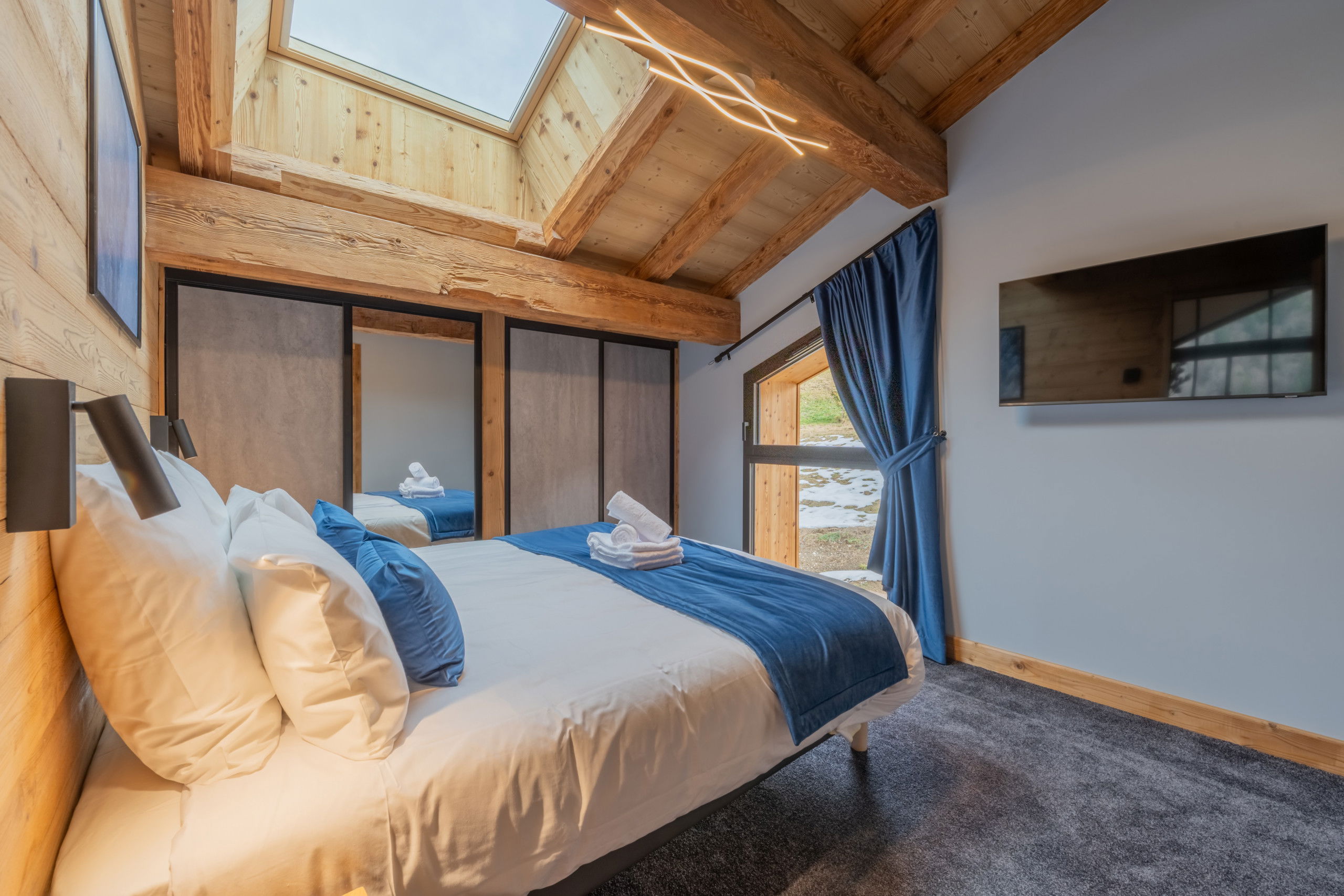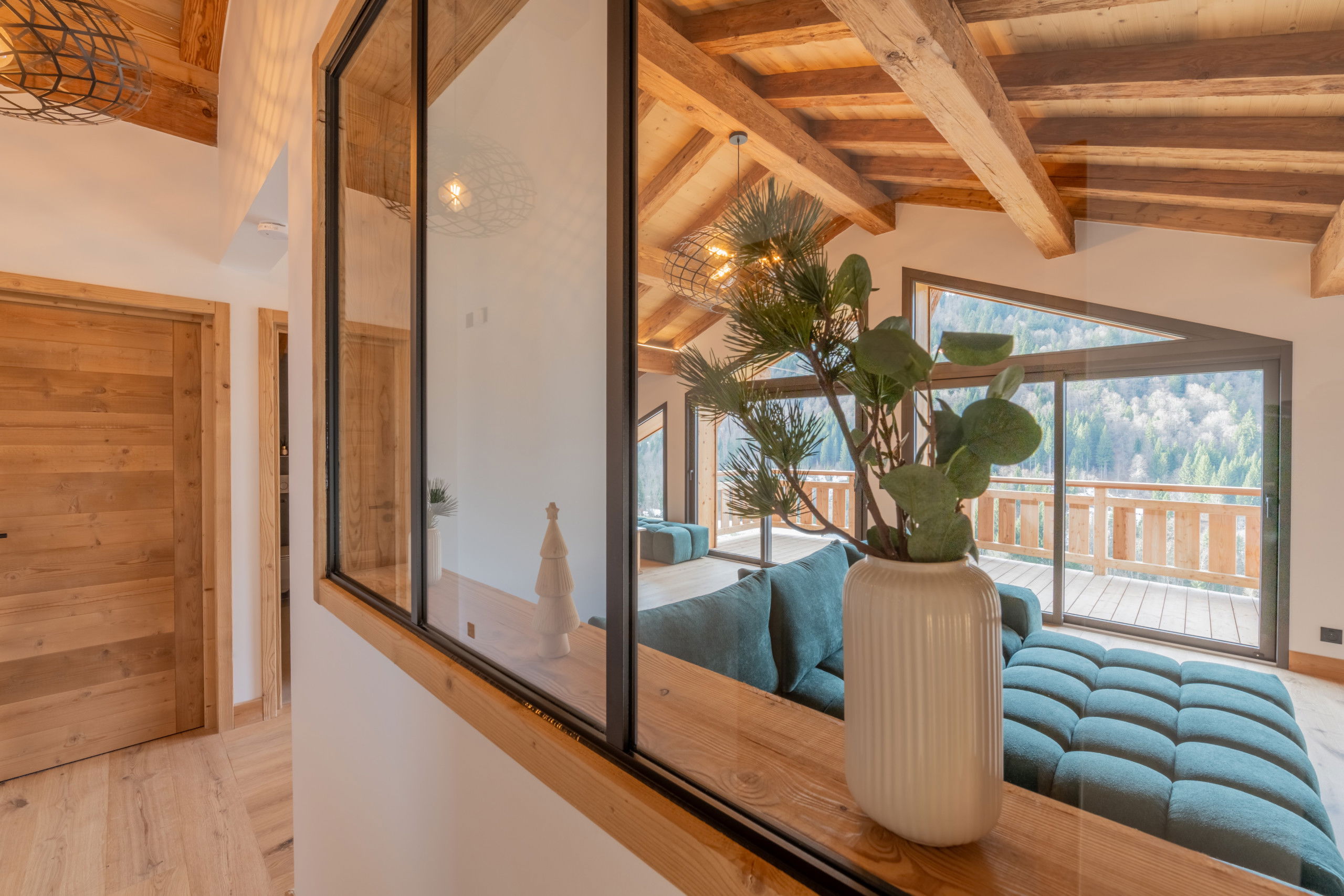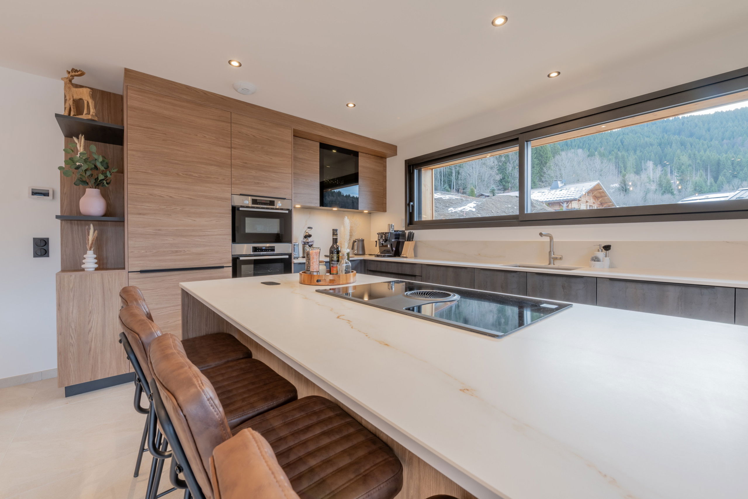 The main living space consists of a fully equipped open kitchen, a dining area and two living rooms, promoting moments of relaxation and conviviality after a day outdoors. The large living room located on the top floor is equipped with a fireplace, bringing a warm atmosphere during the winter season. The large openings ensure beautiful brightness and a natural connection with the outside.