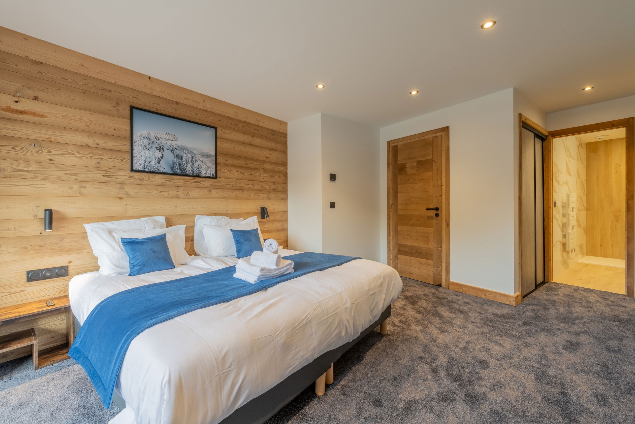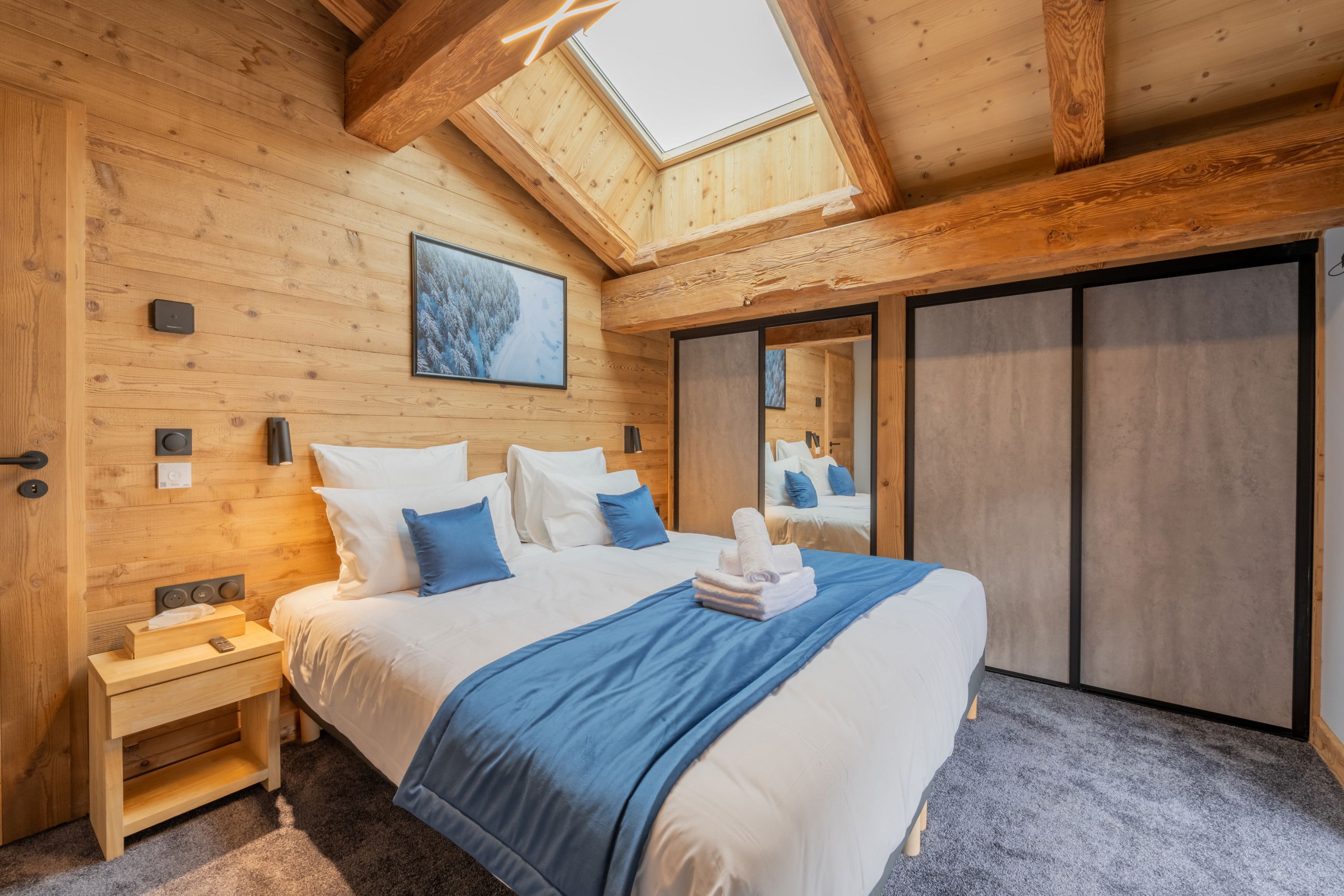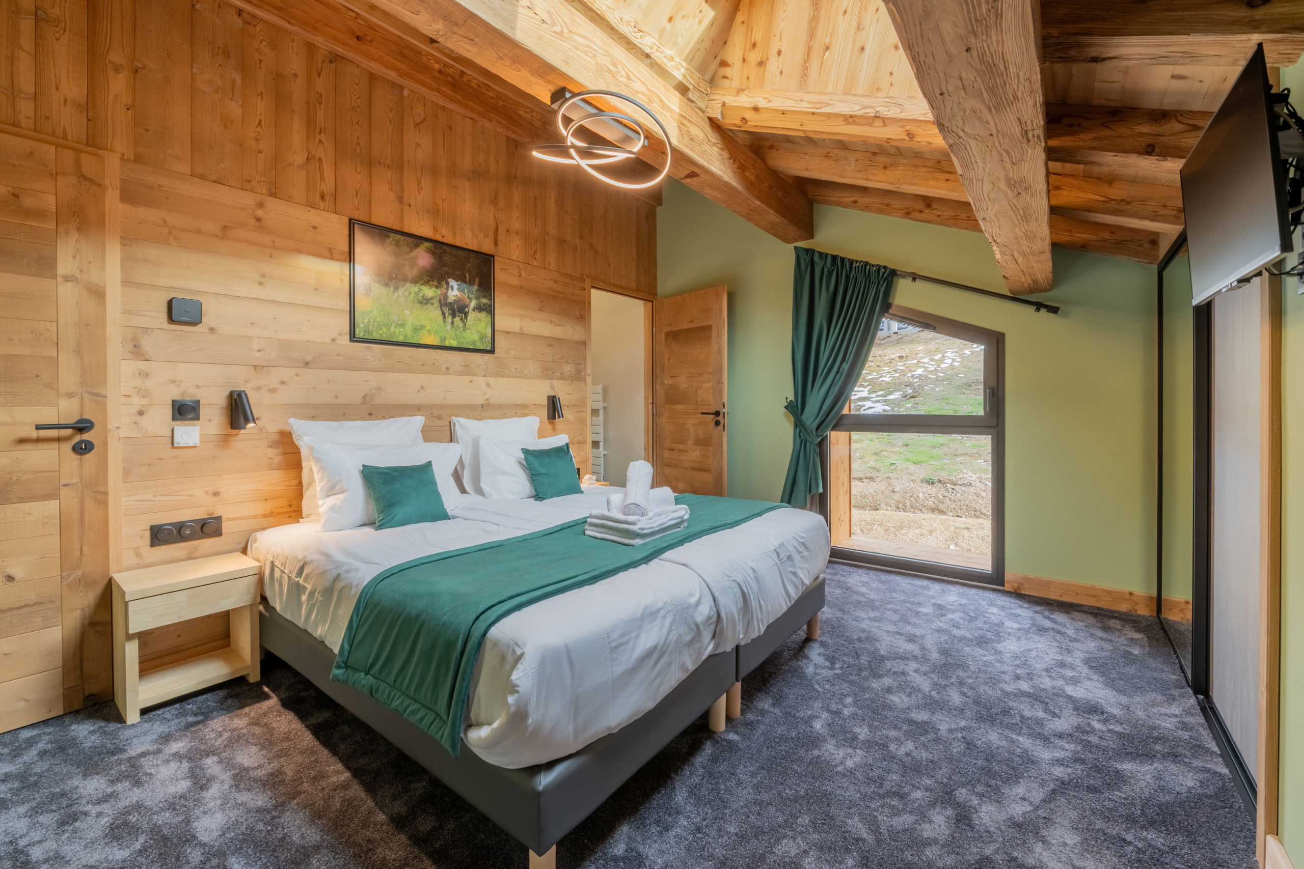 The main living space consists of a fully equipped open kitchen, a dining area and two living rooms, promoting moments of relaxation and conviviality after a day outdoors. The large living room located on the top floor is equipped with a fireplace, bringing a warm atmosphere during the winter season. The large openings ensure beautiful brightness and a natural connection with the outside.
