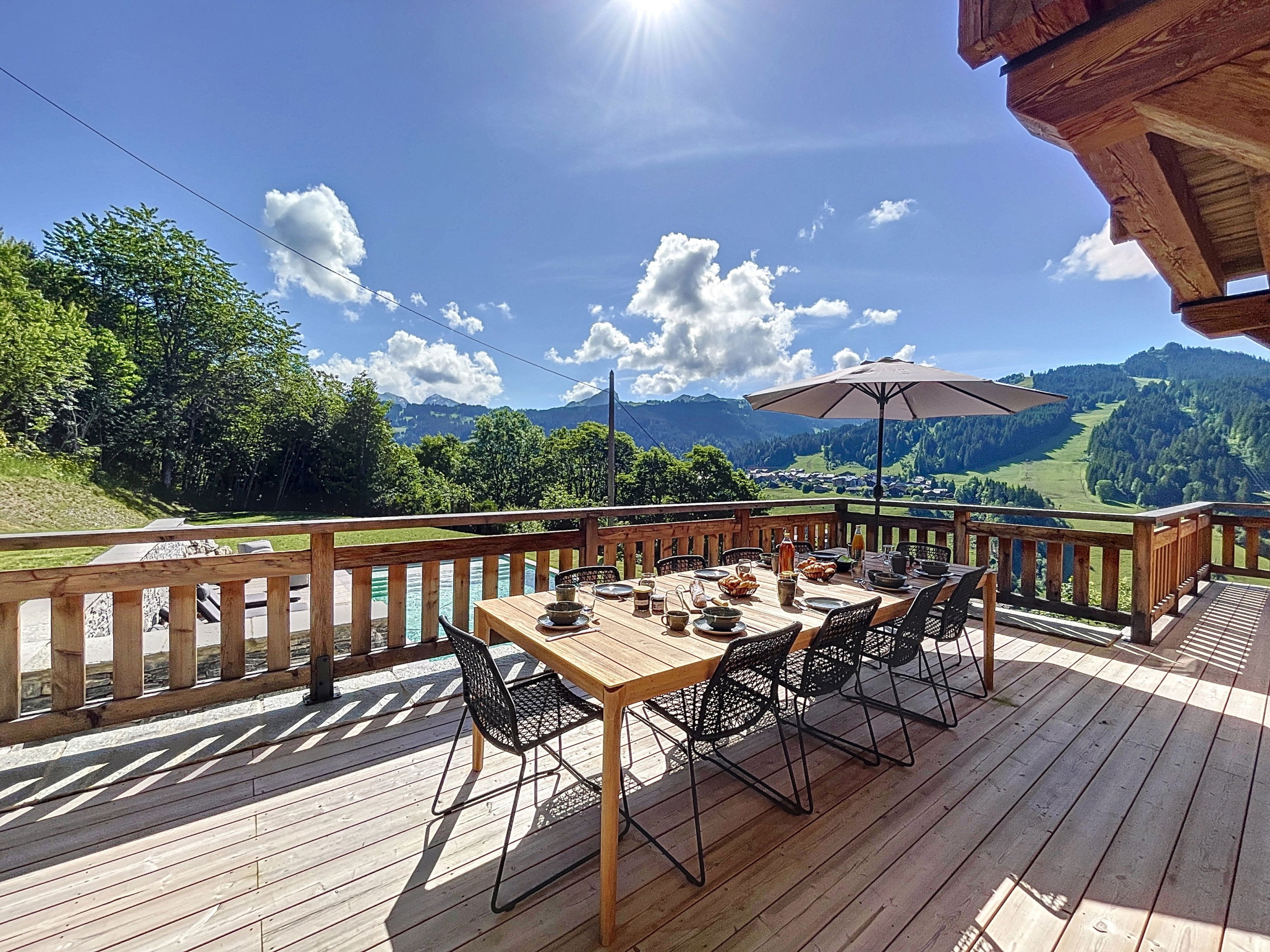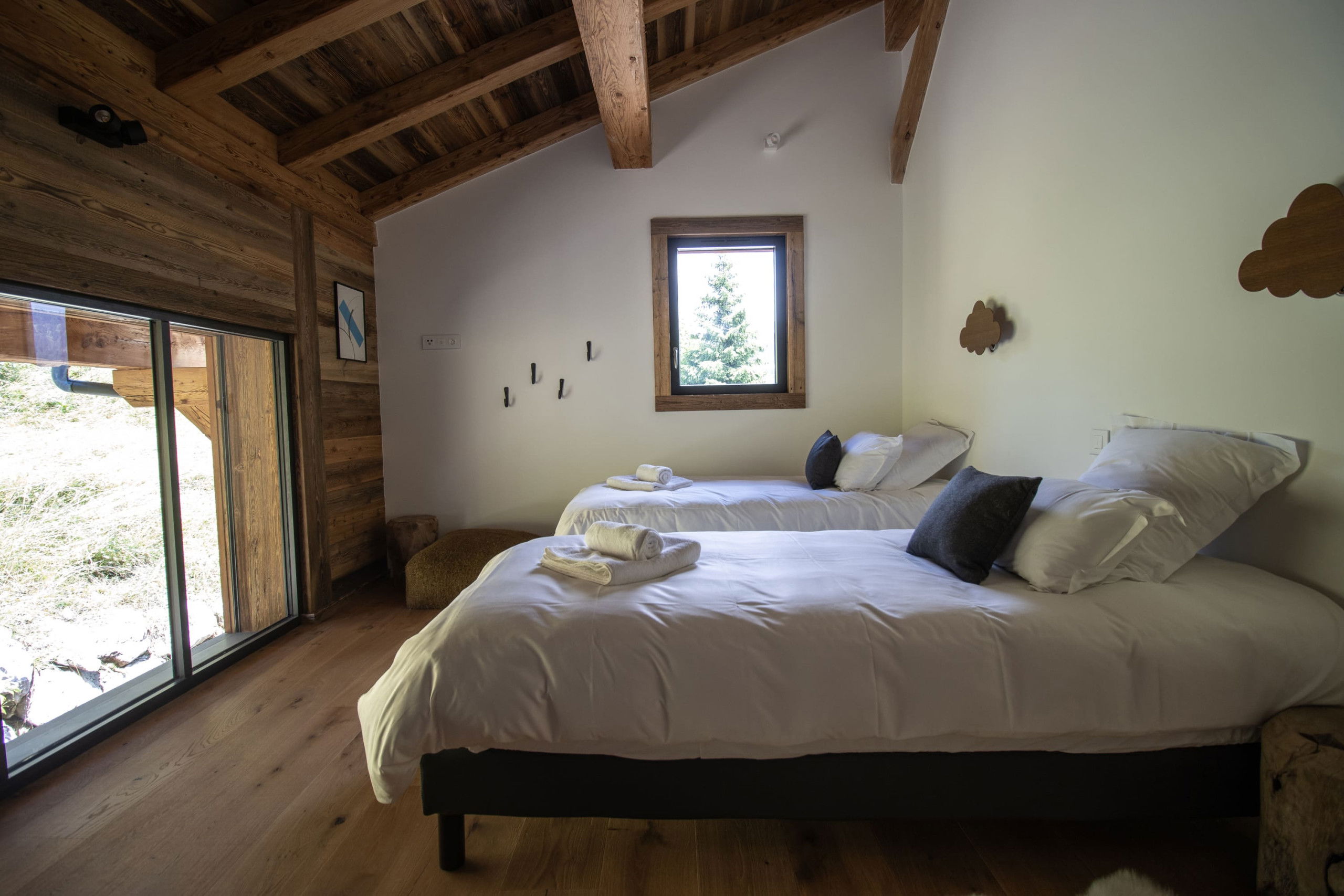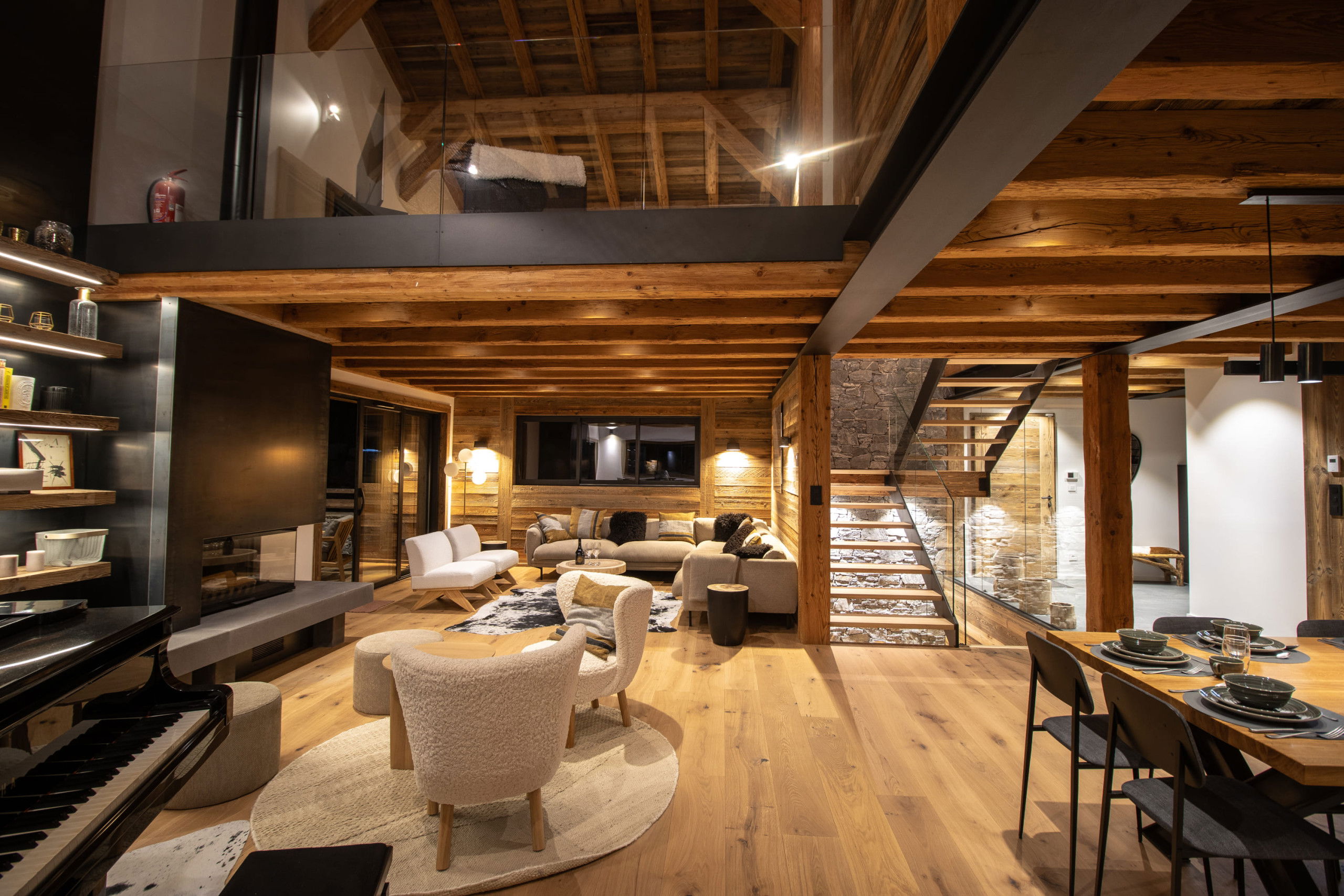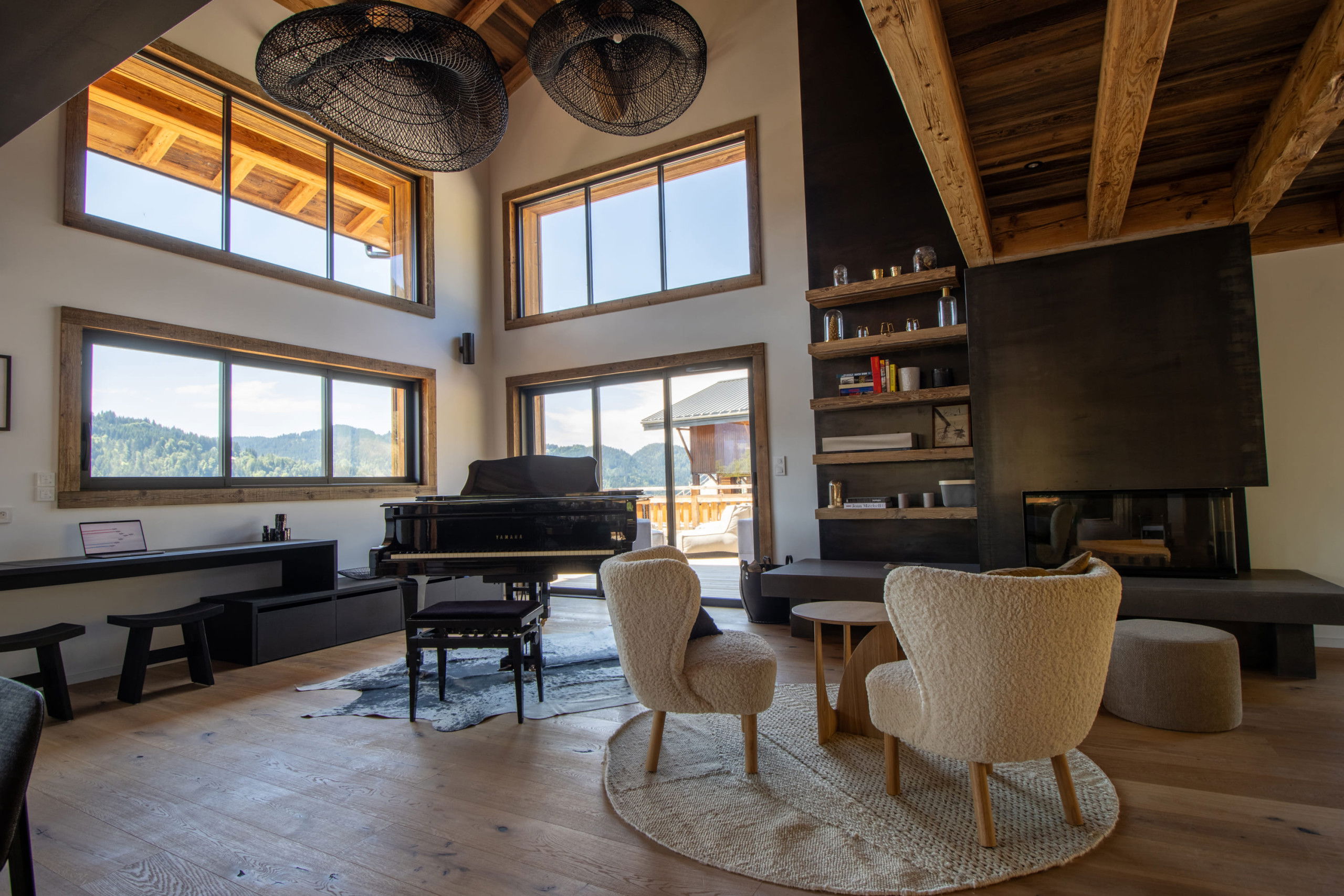The spacious interior features a large living room bathed in light, opening onto a welcoming dining room and a cosy sitting room with a fireplace and grand piano, inviting you to share and relax. You'll also enjoy two large terraces running around the edge of the chalet, with uninterrupted views of the Les Gets slopes.