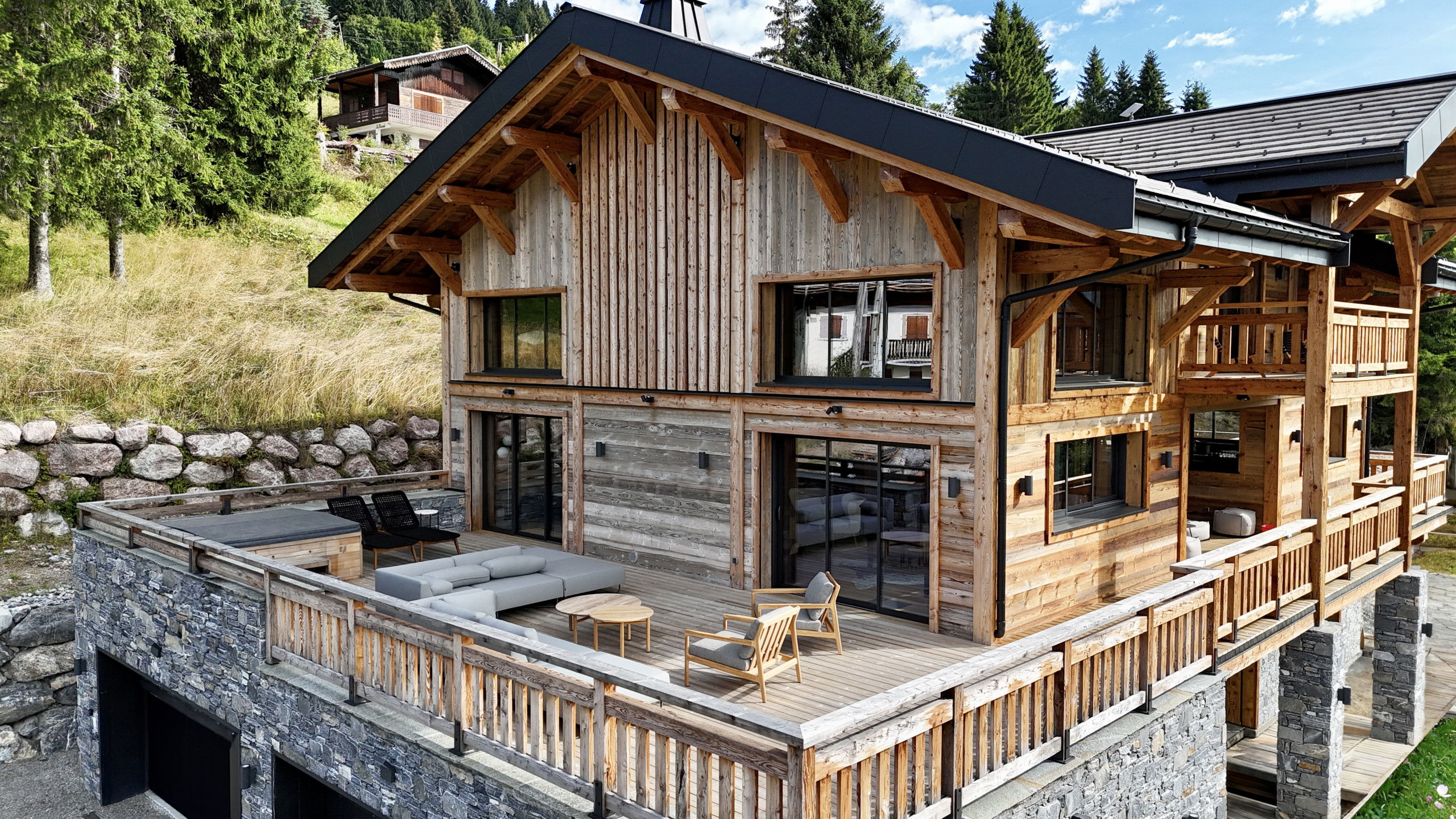 For moments of pure happiness with family or friends, this chalet has a full range of amenities, including a sauna, a hammam, an outdoor jacuzzi for up to 6 people, an outdoor swimming pool, a lounge area and a gas barbecue for convivial evenings with family or friends.