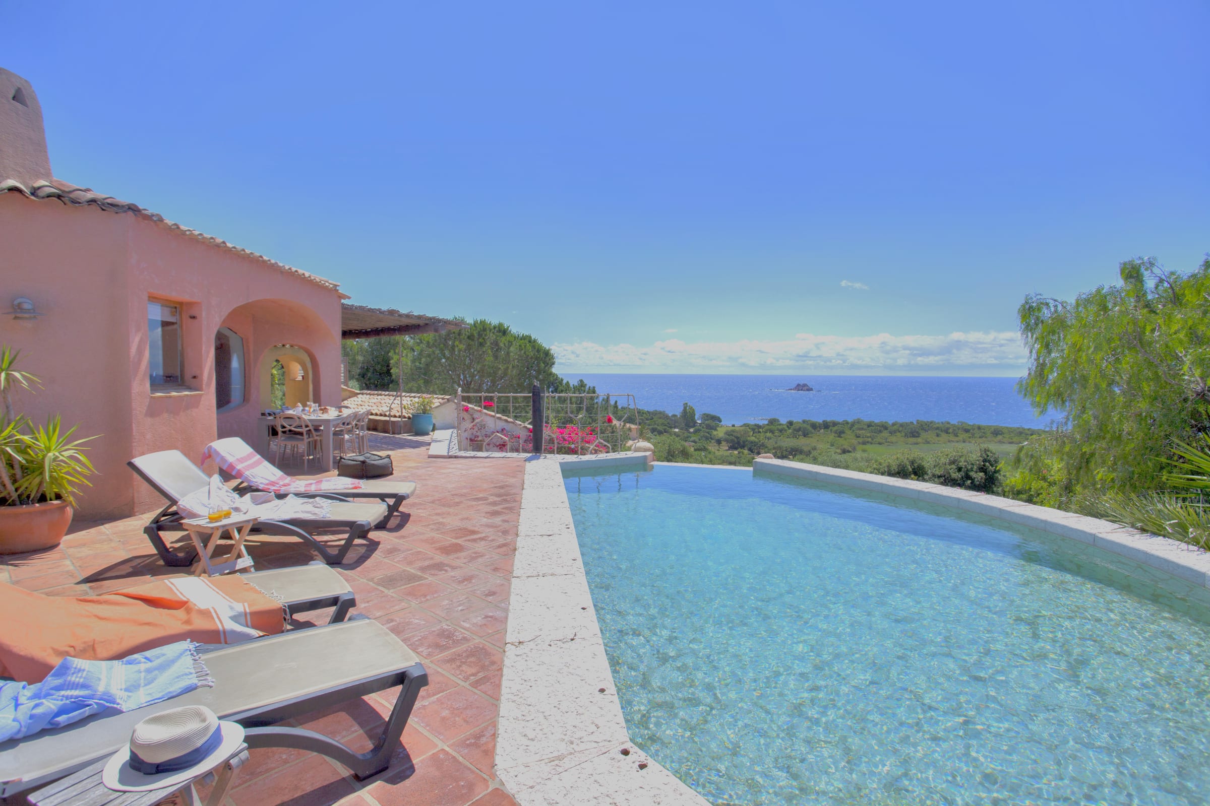 This villa offers a unique setting between sea and nature. On one side, a patio with exotic accents invites you to relax; on the other, a superb terrace with heated infinity pool (8.50 * 4.50) equipped with 8 sun loungers and a shade sail, reveals a panoramic view of the sea, the islets, the bay and, in the distance, Sardinia and the archipelago of La Madalena. The garden, arranged on several levels, creates beautiful spaces for walking and contemplation. A yurt houses a large bedroom, to the delight of children and lovers of escape. A rare place, ideal to live unforgettable moments facing the horizon without opposite. Garden mostly fenced. The swimming pool equipped with an alarm and a net fence.