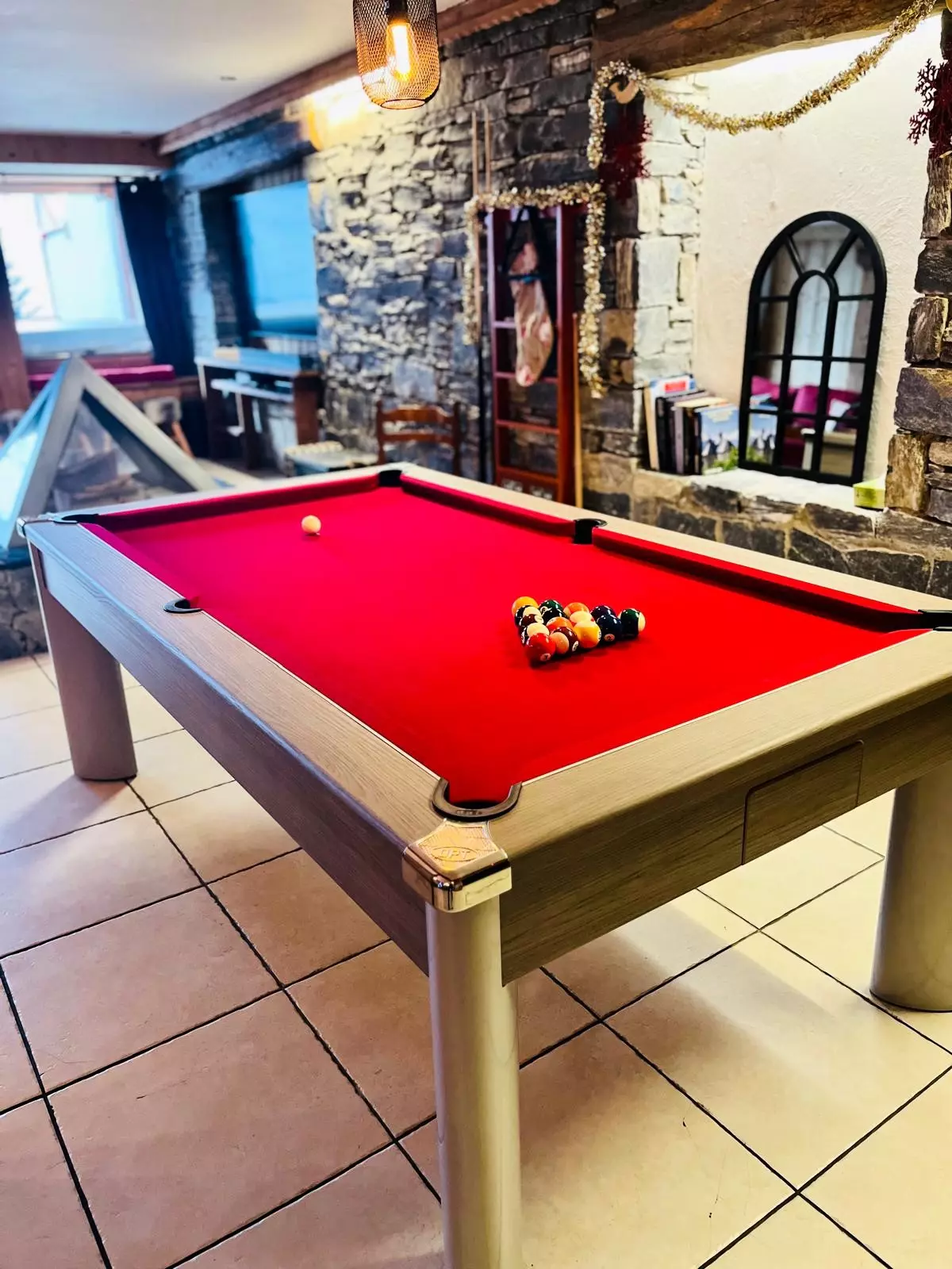 The kitchen opens onto a spacious living room with a wood-burning stove. You will find a pool table, a television, and a bar.