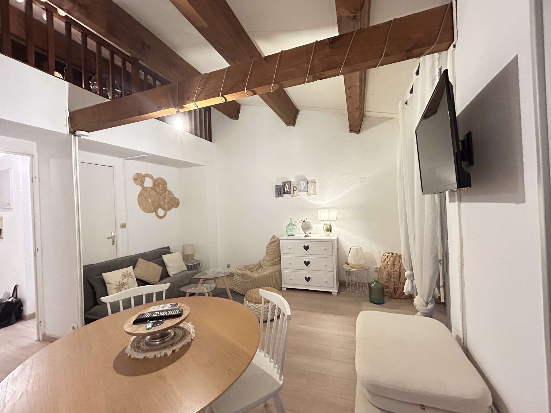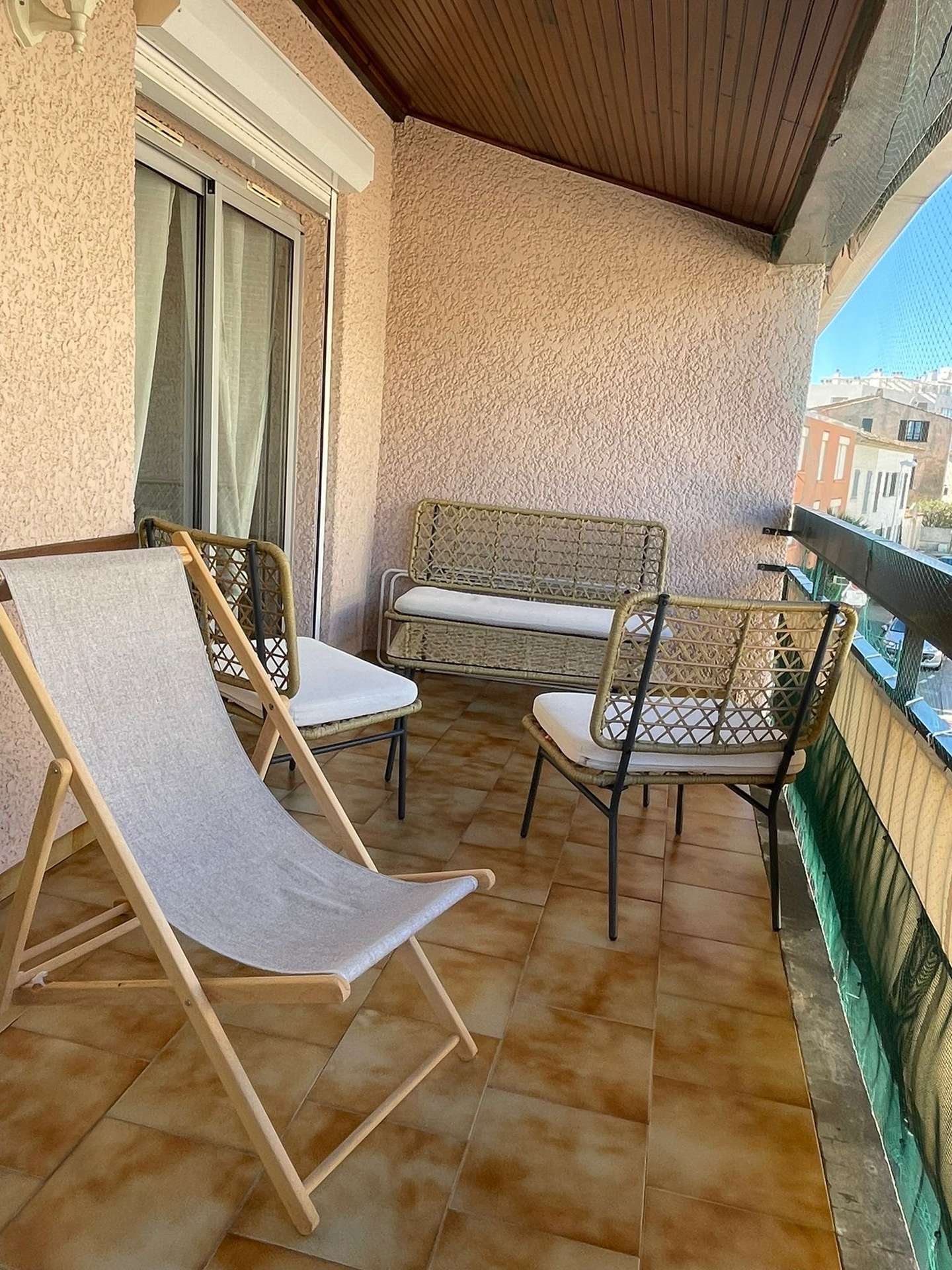 This air-conditioned vacation apartment features an entrance hall, a bright living room with a sofa, a fully equipped kitchen, a mezzanine bedroom with a double bed, a bathroom with toilet, and a charming 11m² terrace with garden furniture and deck chairs, situated on a quiet street with unobstructed views.