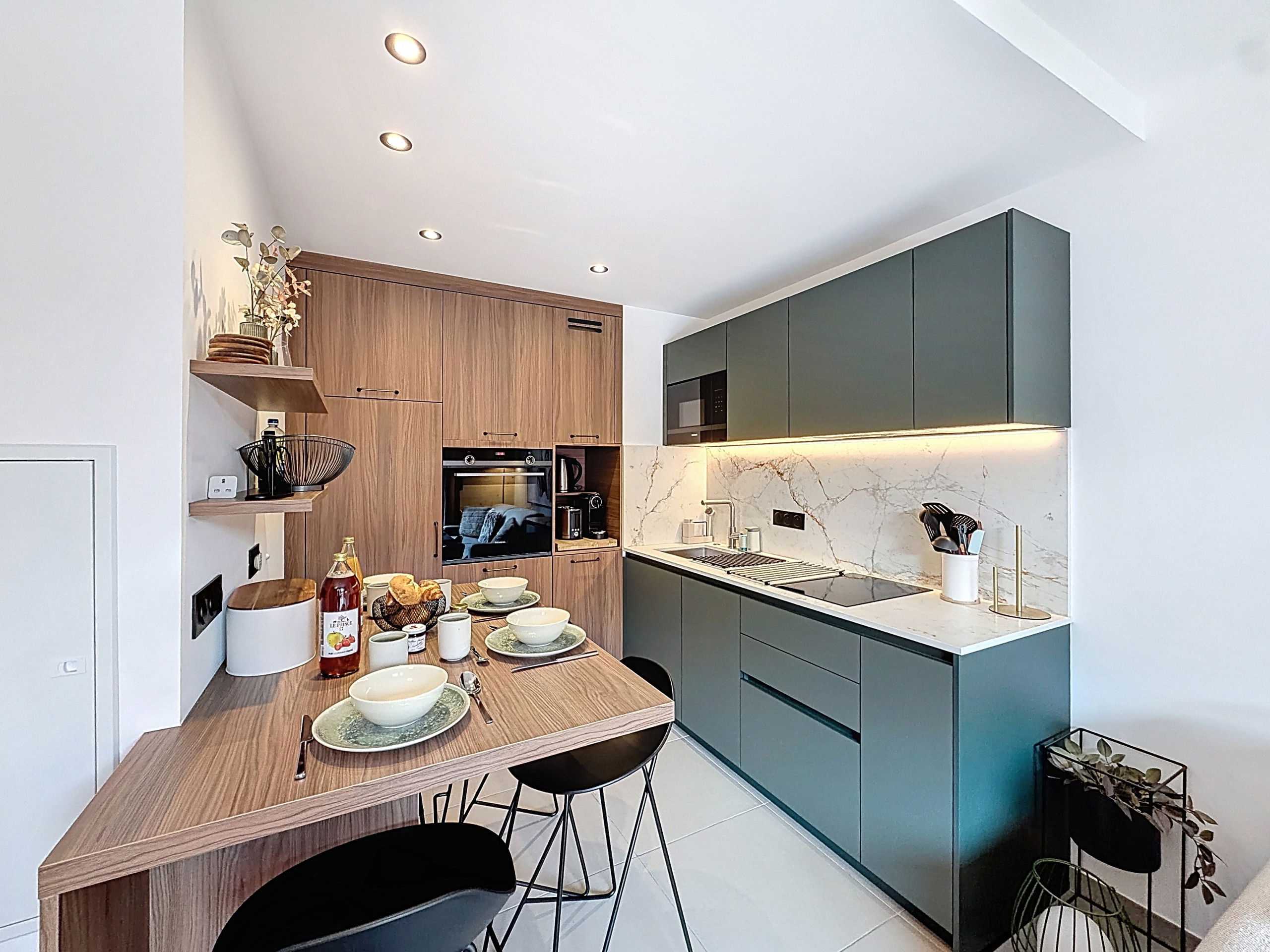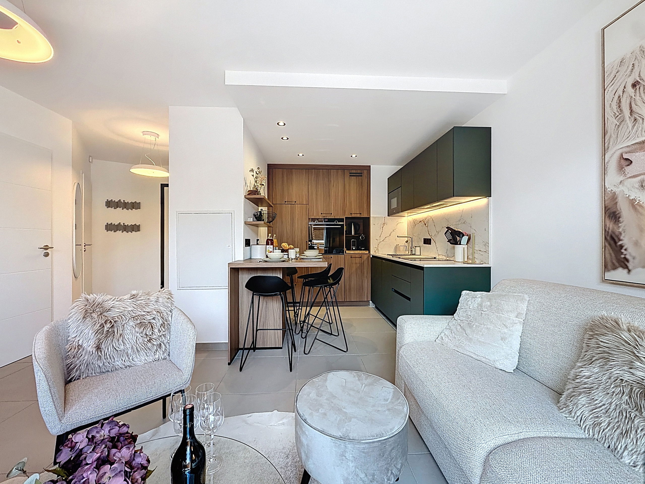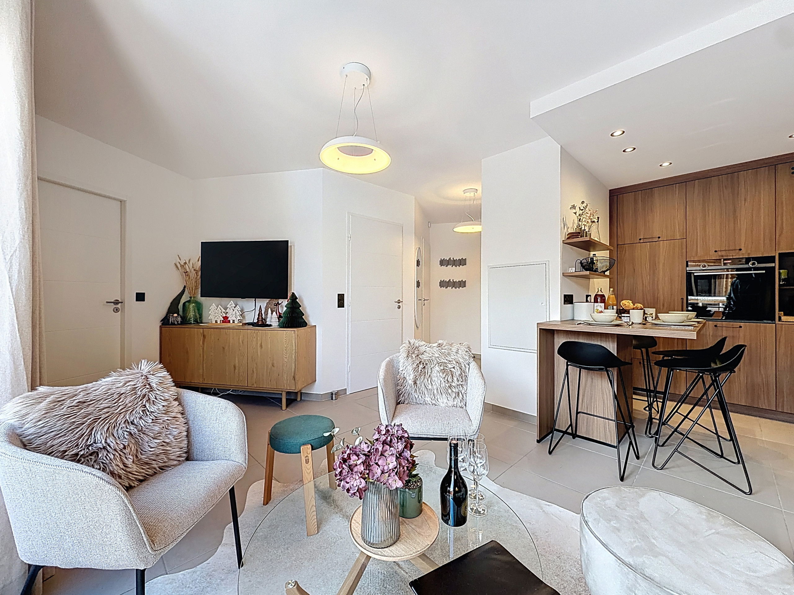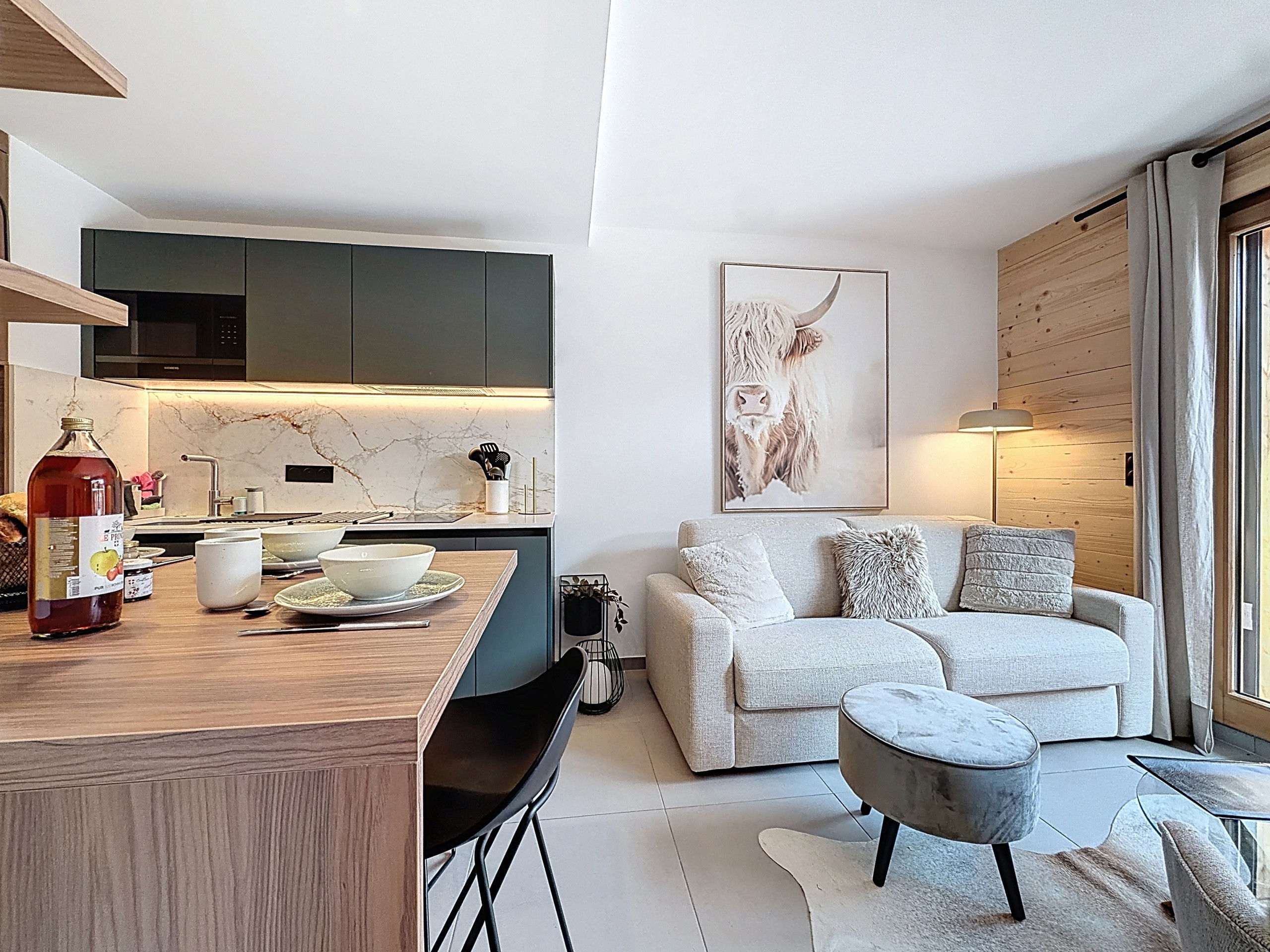 The interior has been carefully designed for your comfort, with a fully equipped kitchen including a refrigerator, oven, dishwasher, Nespresso coffee machine and all the necessary utensils for cooking. You will also find the washing machine and dryer in the kitchen. The living area is bright and welcoming, perfect for relaxing after a day of activities.