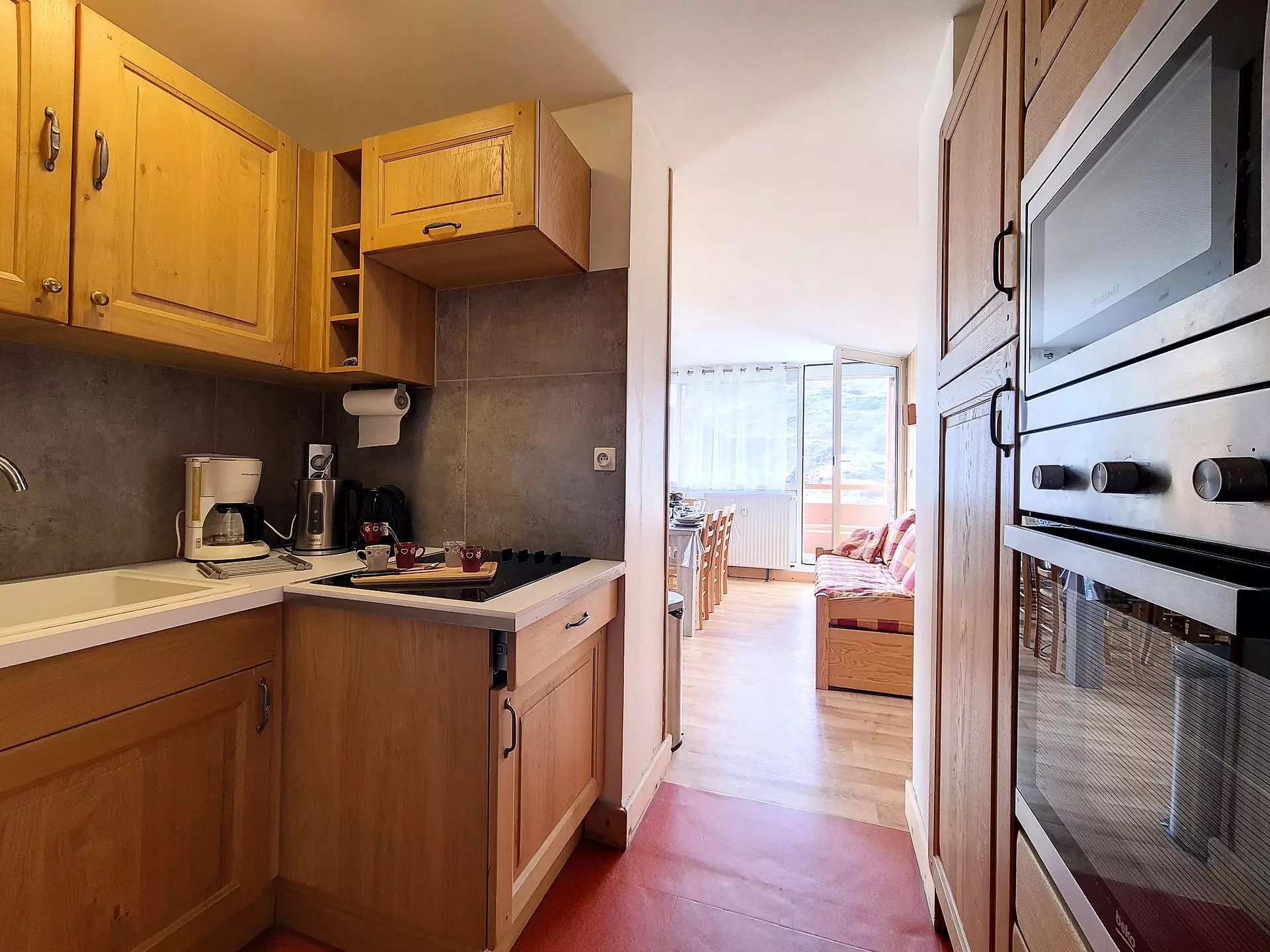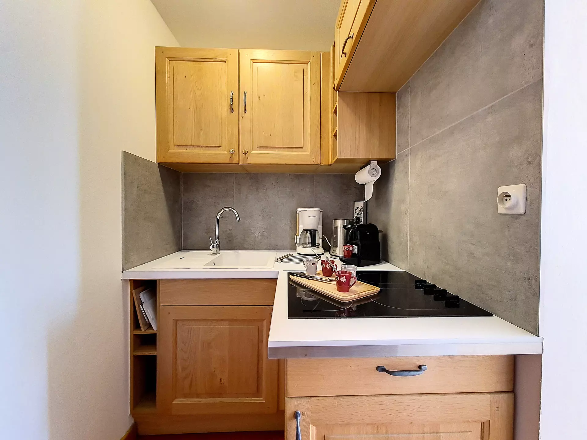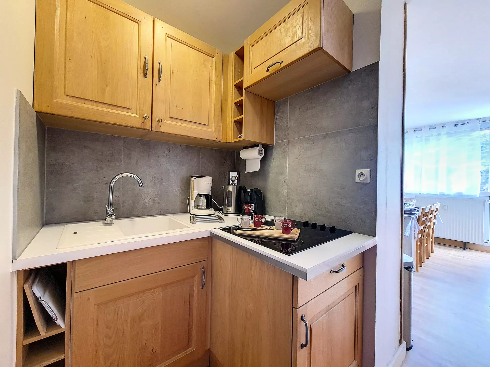 Fitted kitchen with 4 ceramic hobs, refrigerator, oven, microwave, dishwasher, toaster, kettle and coffee maker