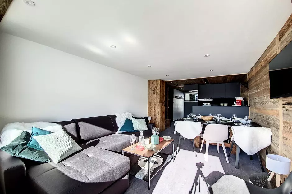 Living area equipped with a flat screen TV and a 2-person sofa bed