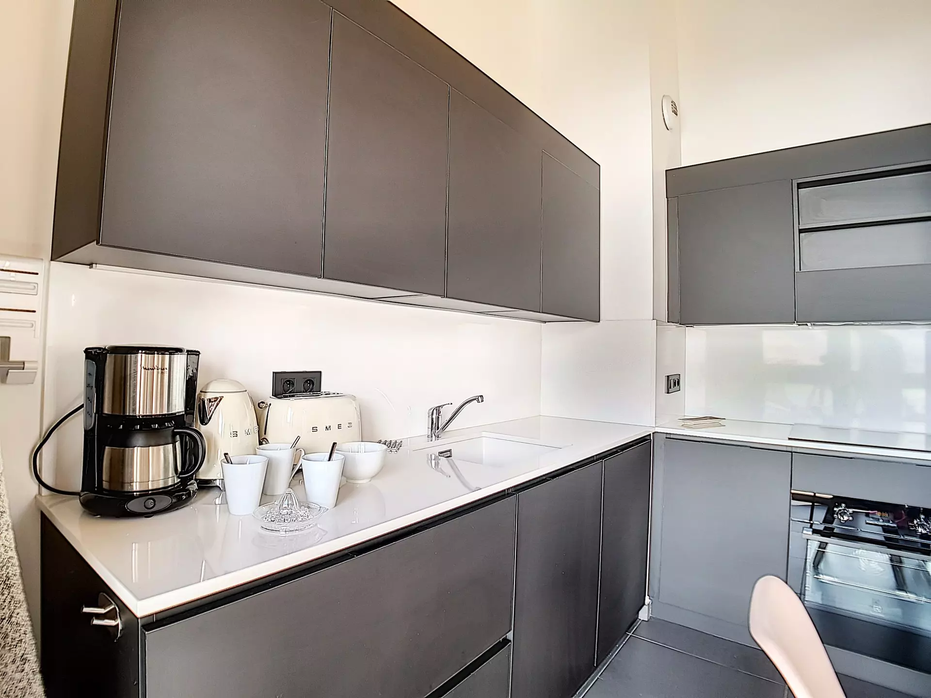 Open kitchen leading to a pleasant living room and equipped with an induction hob, refrigerator with freezer compartment, dishwasher, oven, electric kettle, toaster, Nespresso coffee machine.
