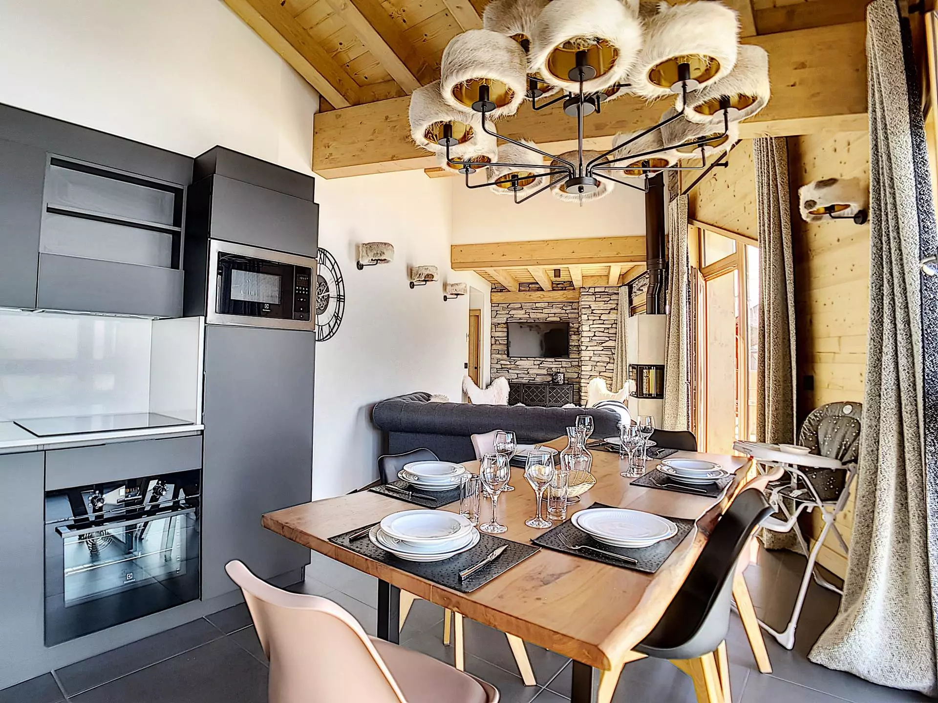 Living room equipped with a sofa bed (140 cm sleeping area), a large 4K LCD TV and a wood-burning stove