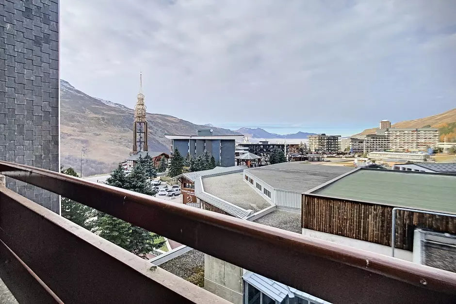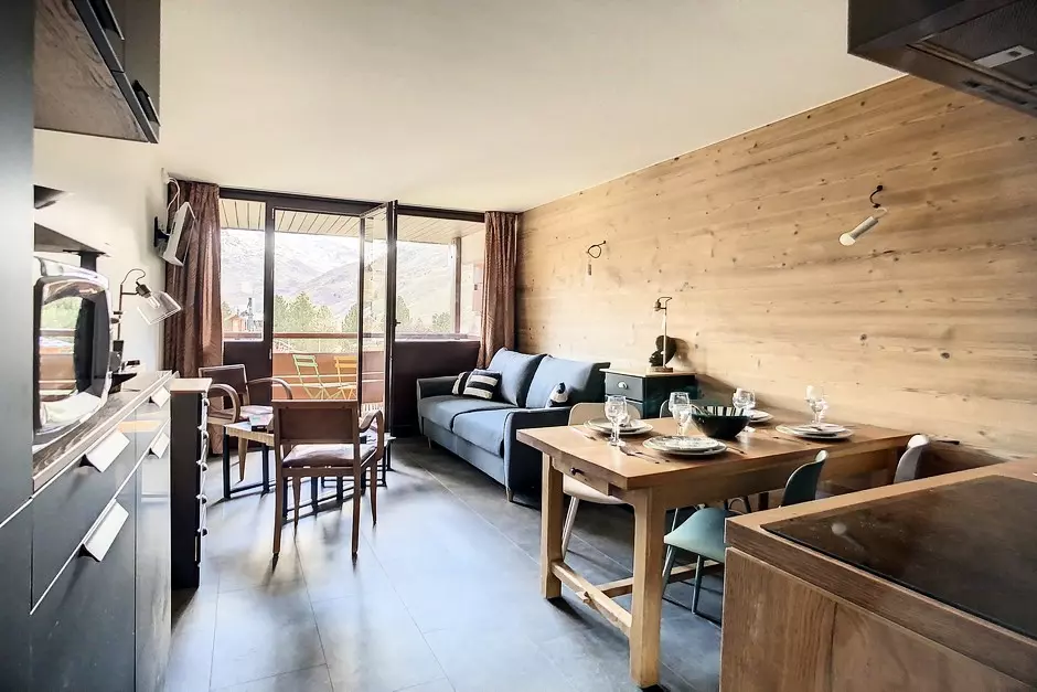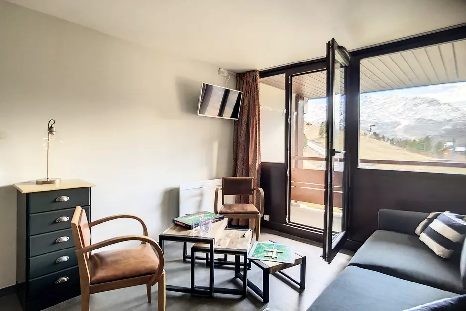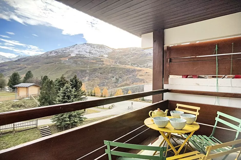 It has a south-facing balcony (slope view) off the living room and a north-facing balcony off the bedroom (resort view).