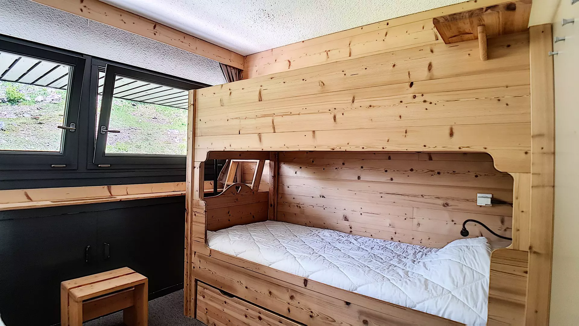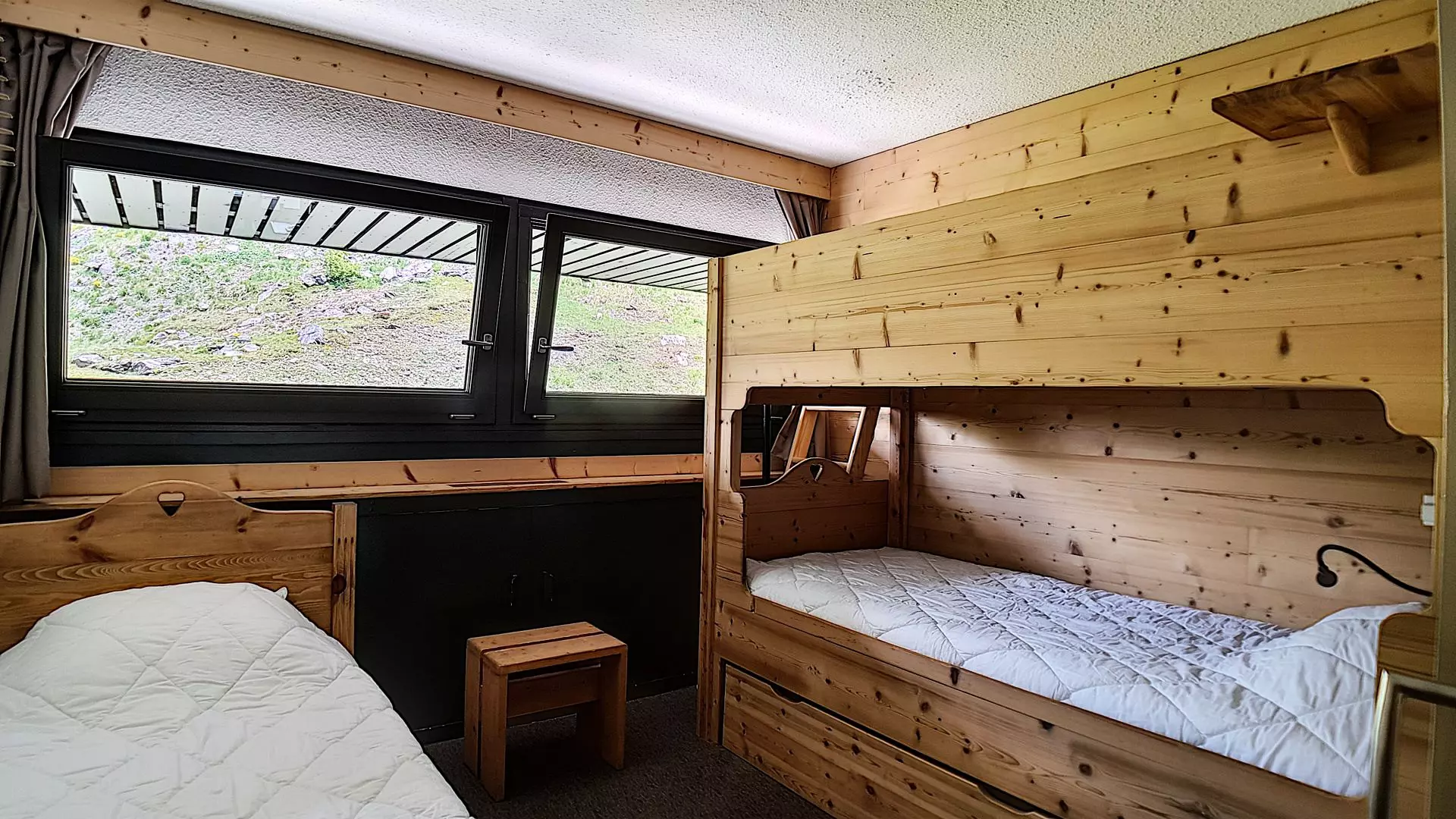 Bedroom 1: 2 single bunk beds + 1 single pull-out bed + 1 single bed. The upper bunk is not suitable for children under 6 years old.