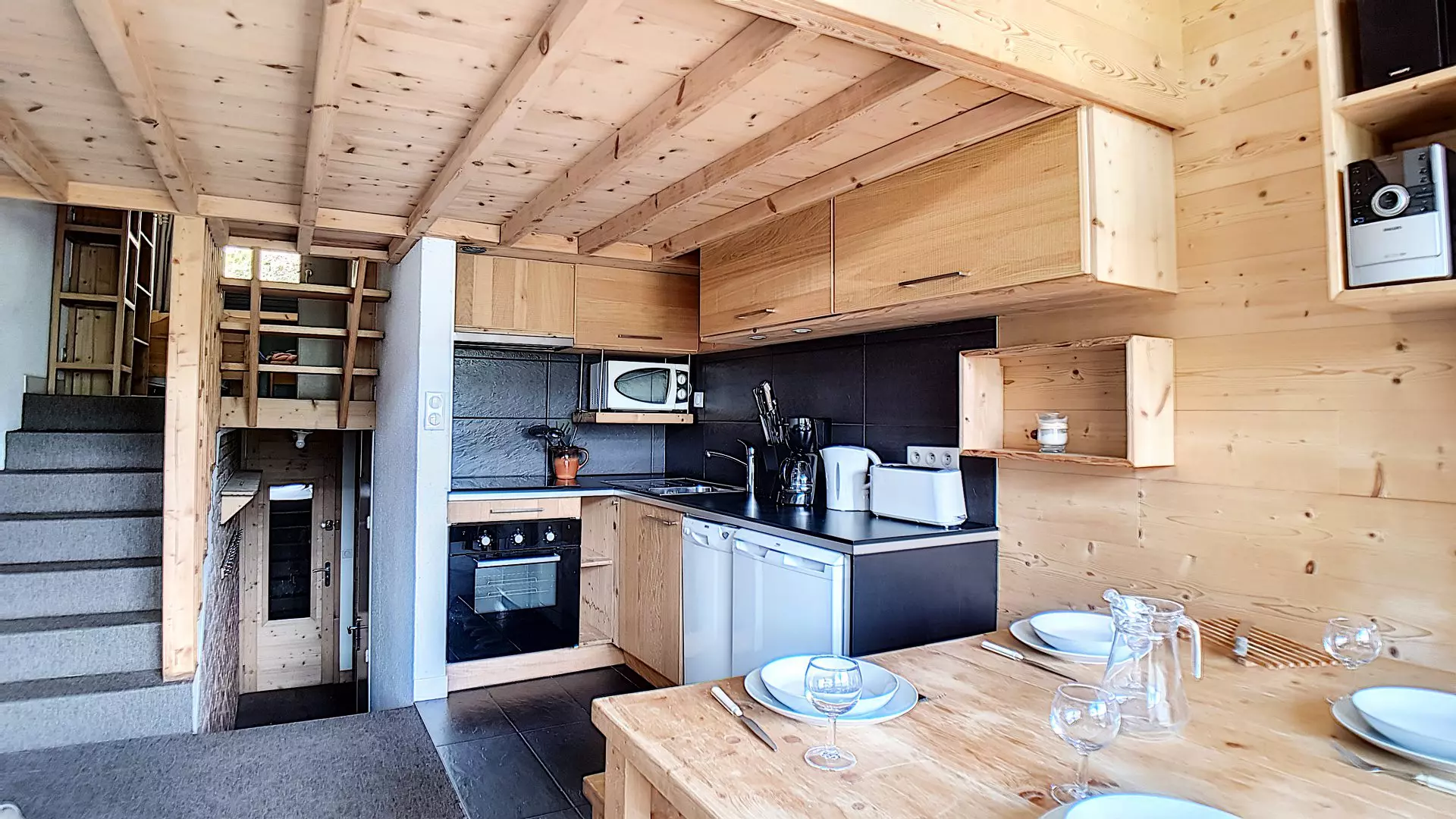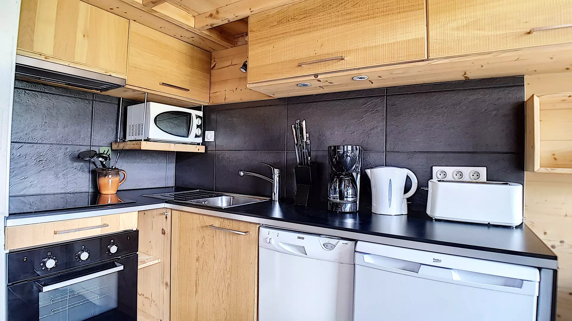 Kitchen equipped with 2 electric hobs, a refrigerator, a traditional oven and a microwave, dishwasher, coffee maker, toaster and kettle.
