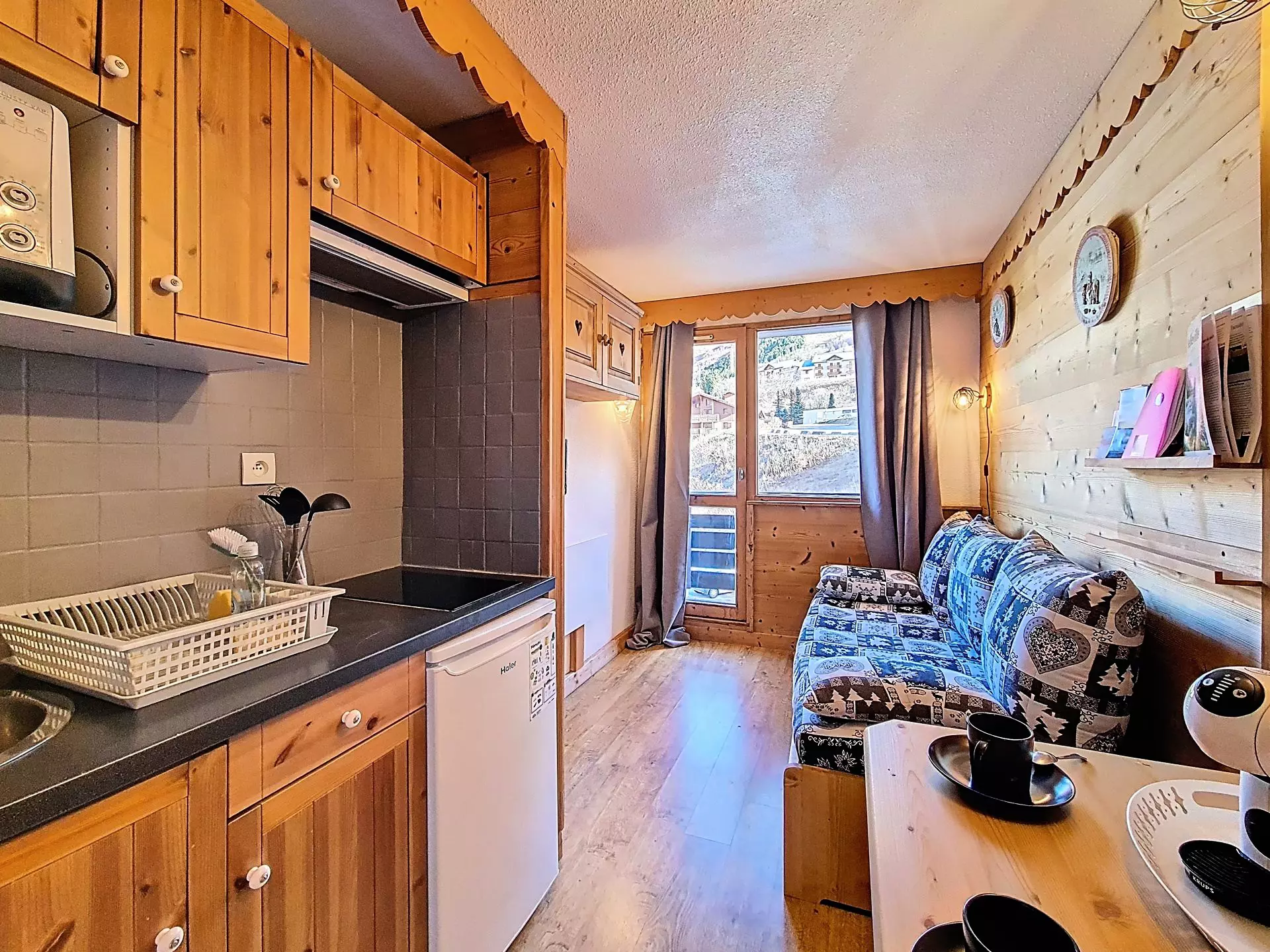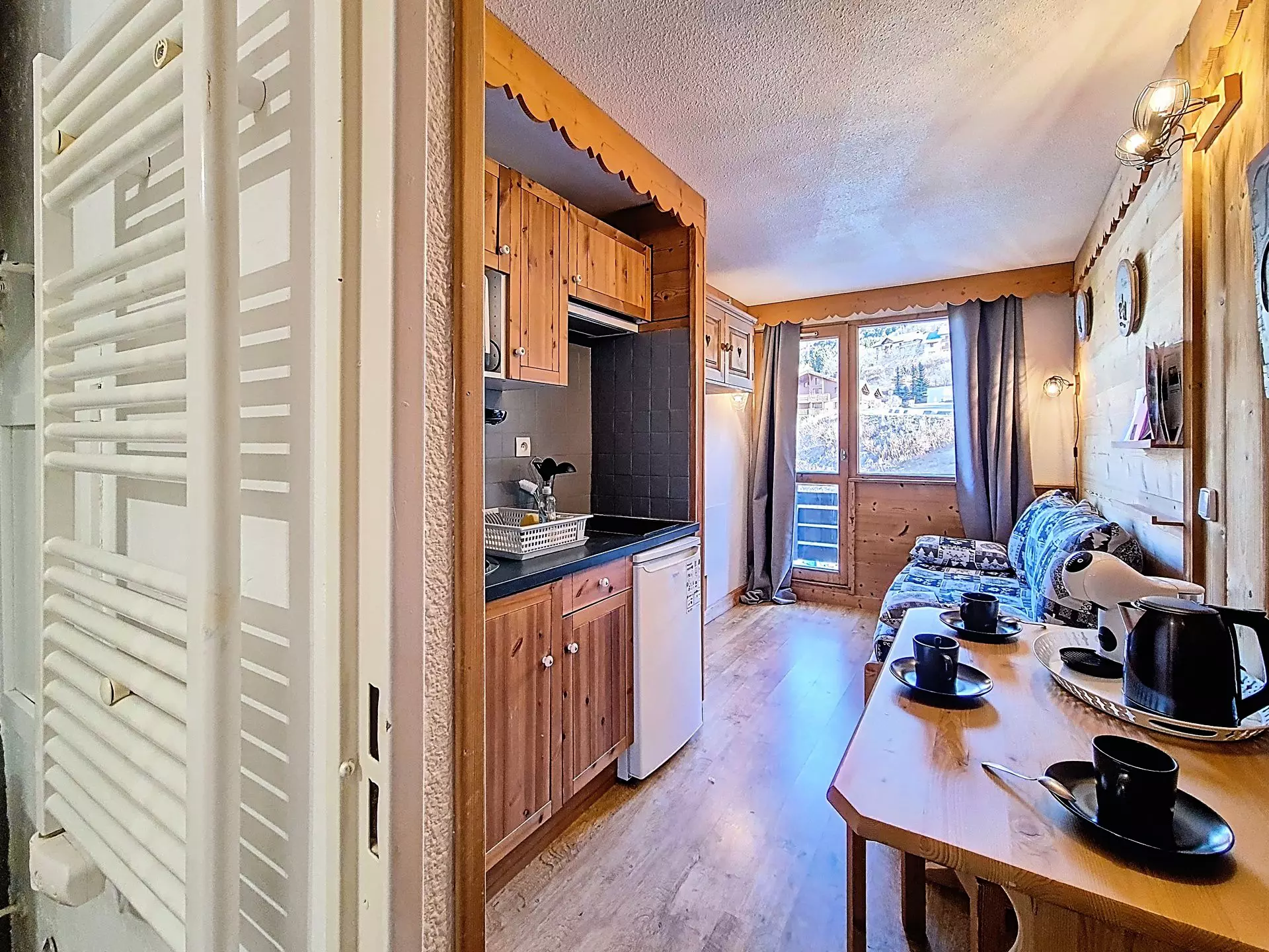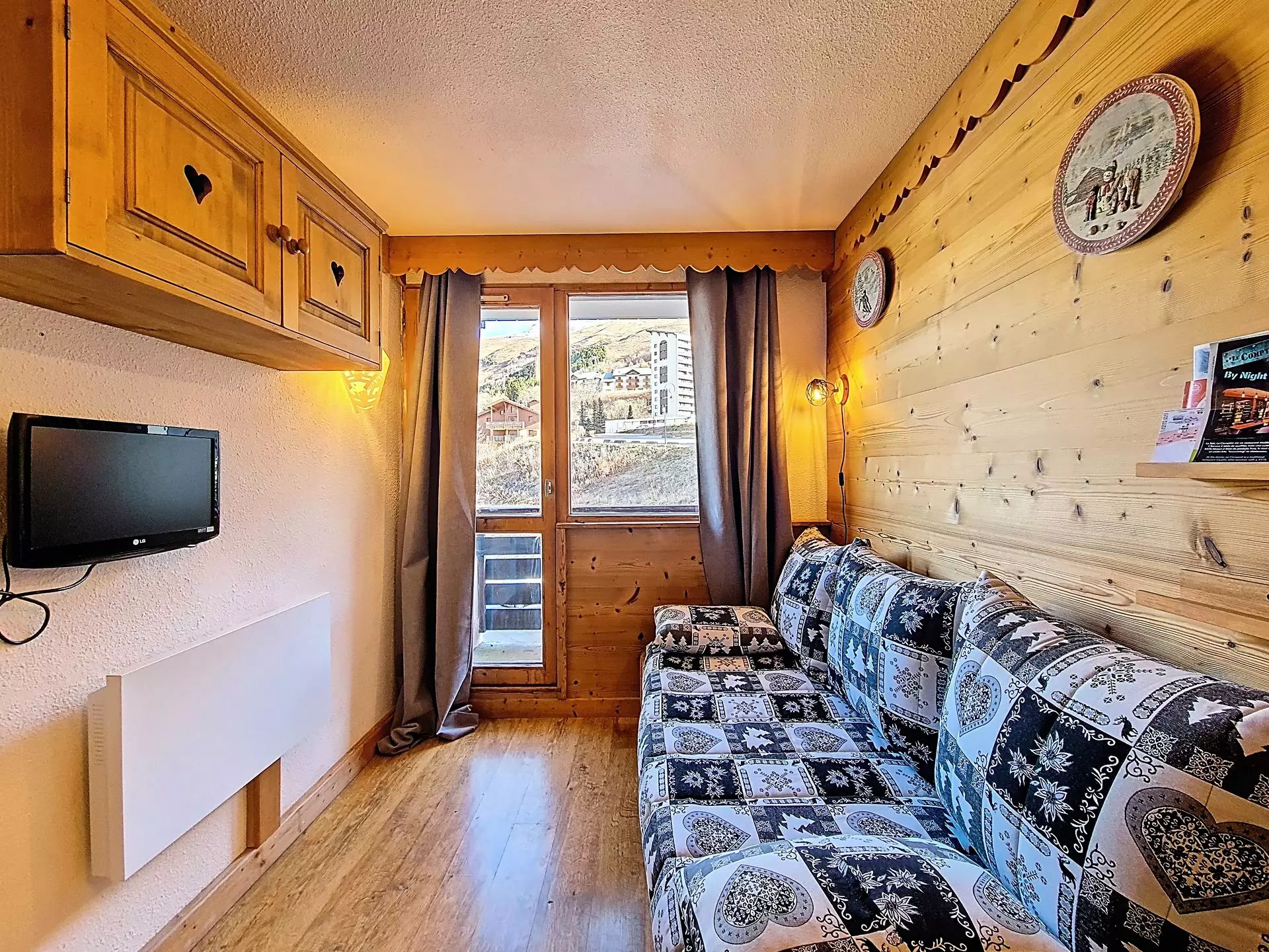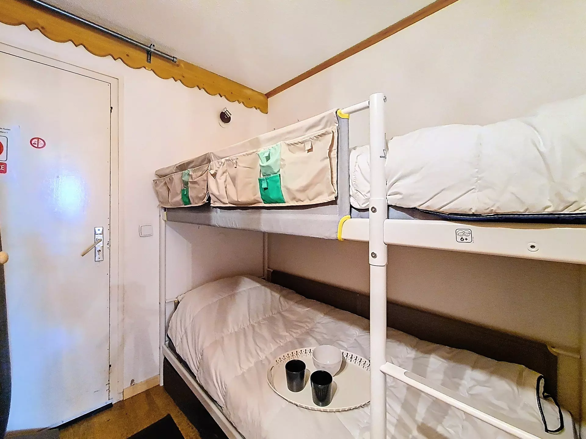 Studio apartment with a sleeping alcove, measuring 17 m², located on the 5th floor with elevator access. It features a southwest-facing balcony with magnificent views of the Masse mountain.