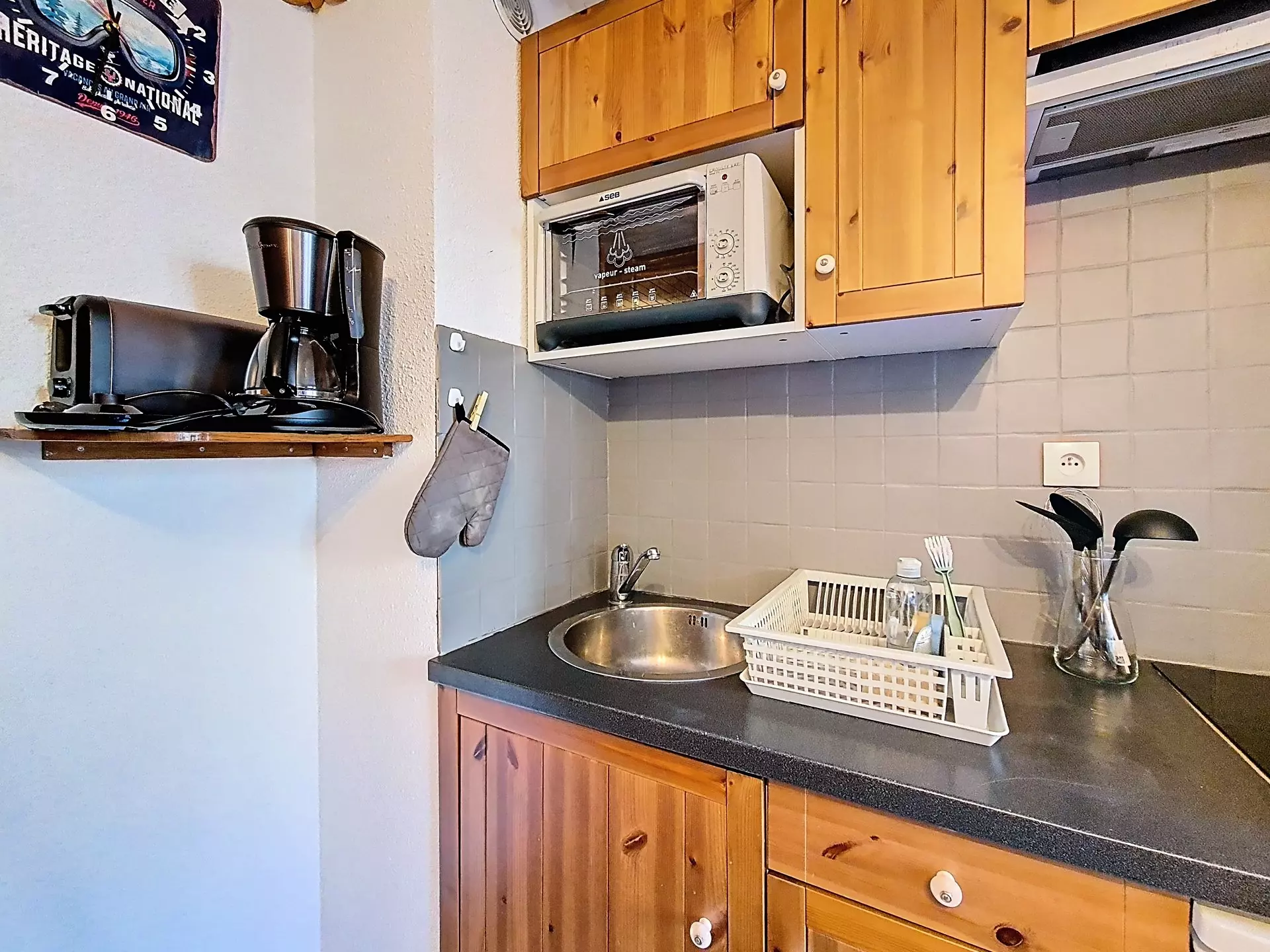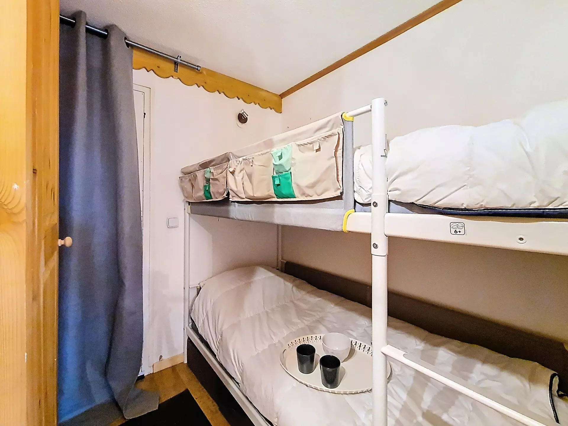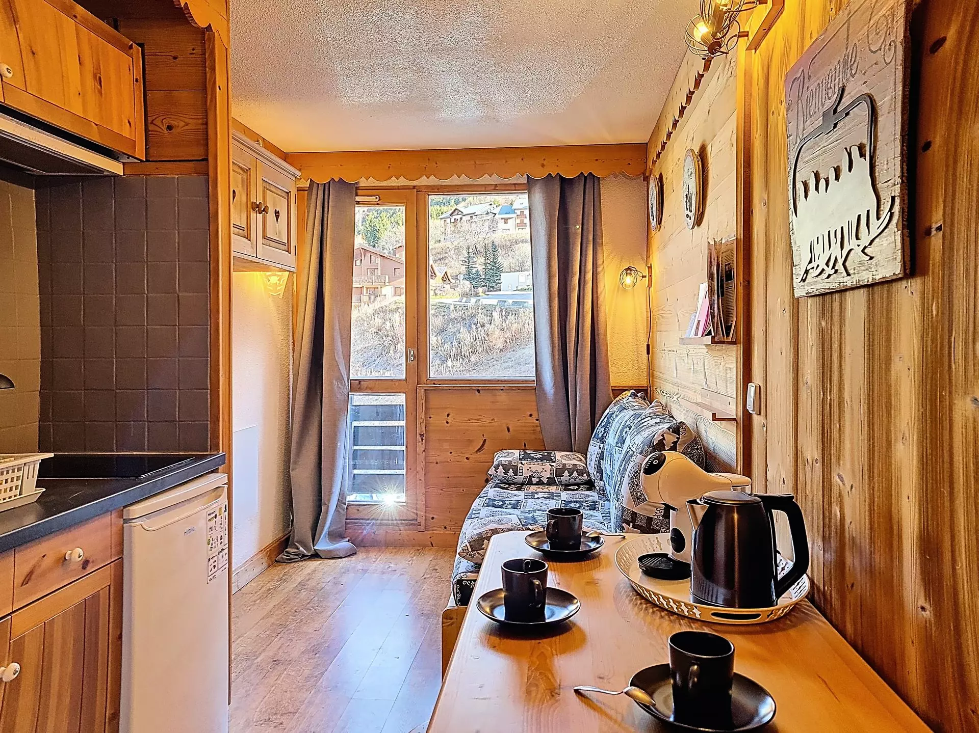 Studio apartment with a sleeping alcove, measuring 17 m², located on the 5th floor with elevator access. It features a southwest-facing balcony with magnificent views of the Masse mountain.