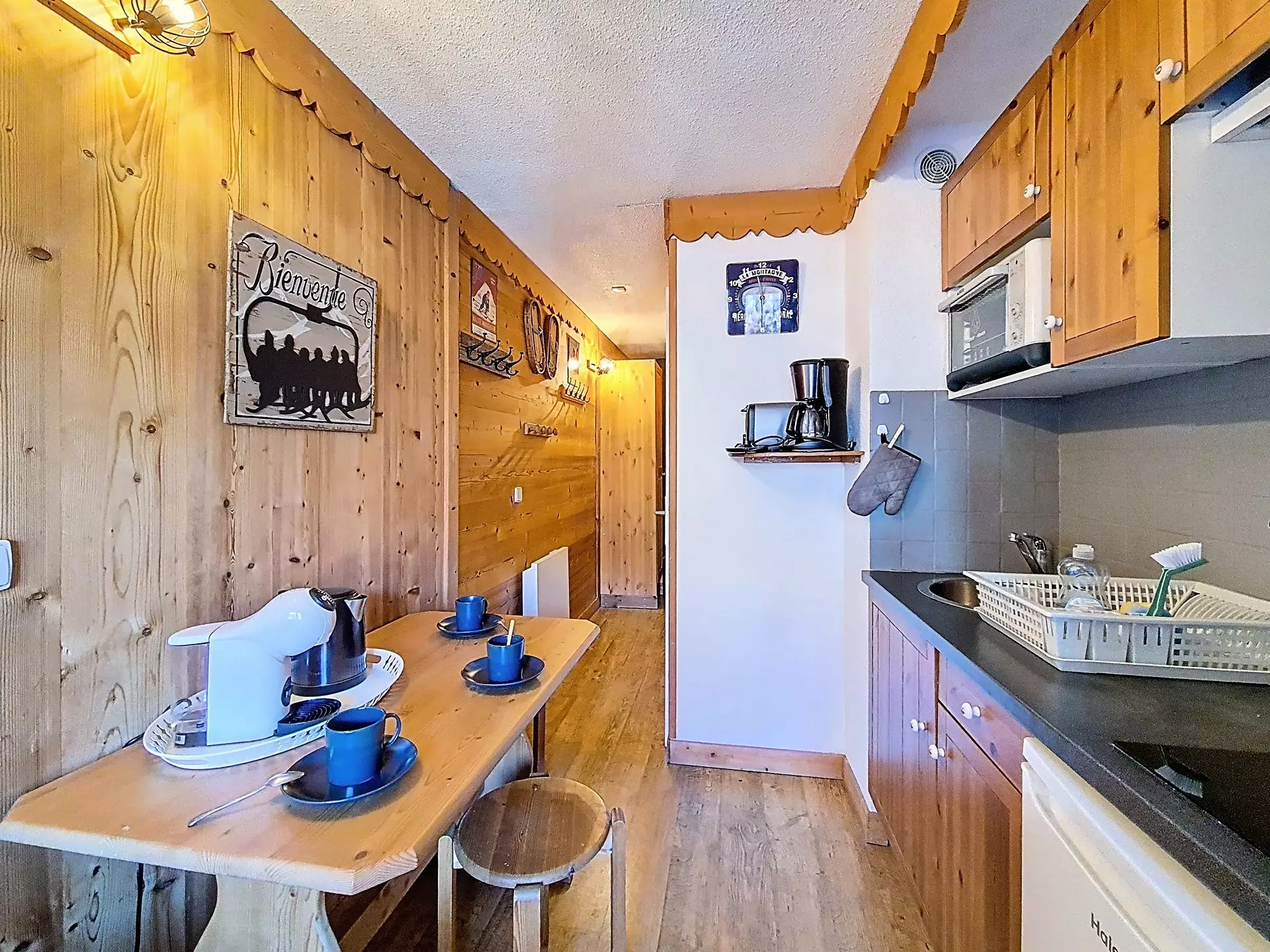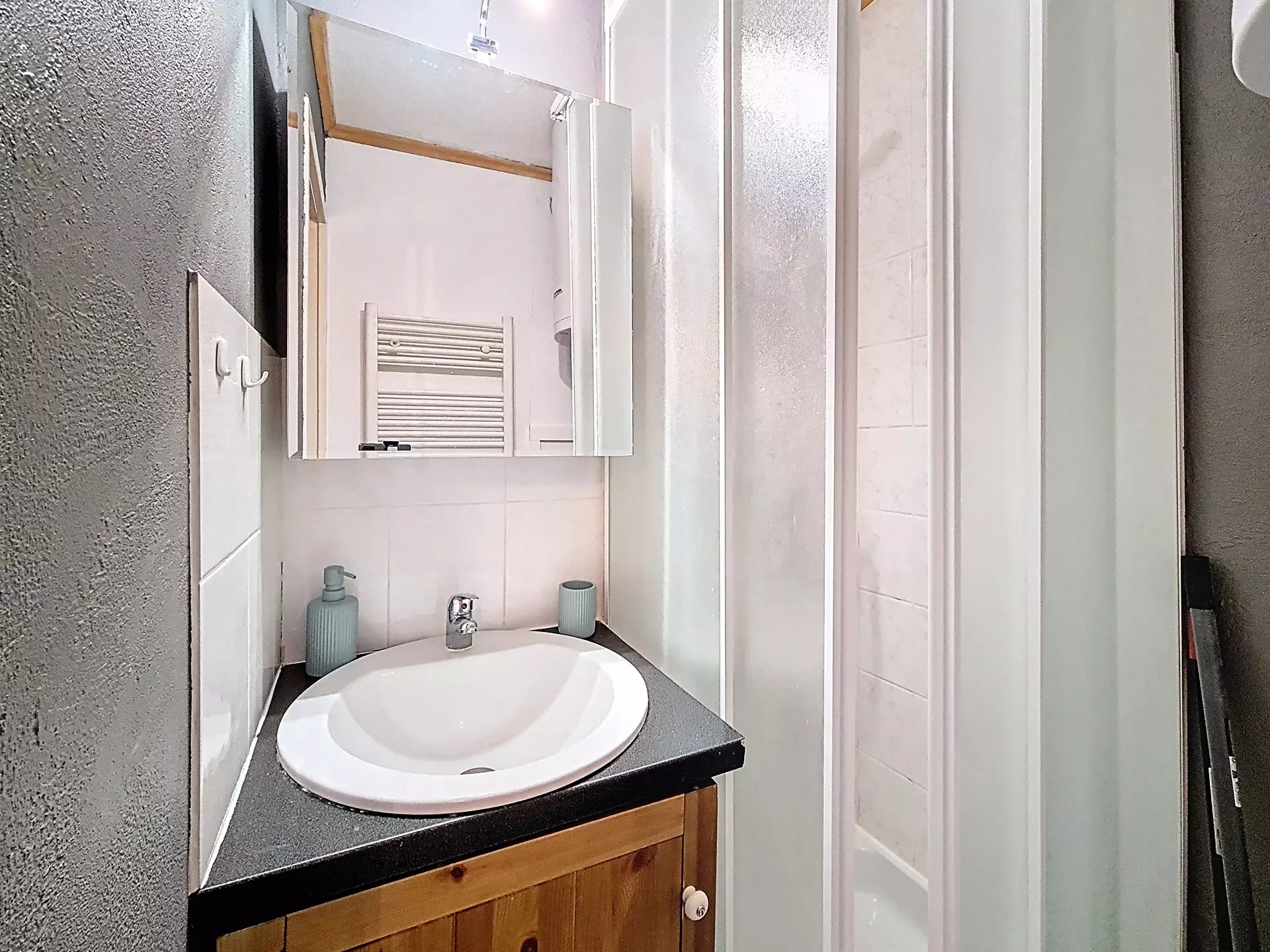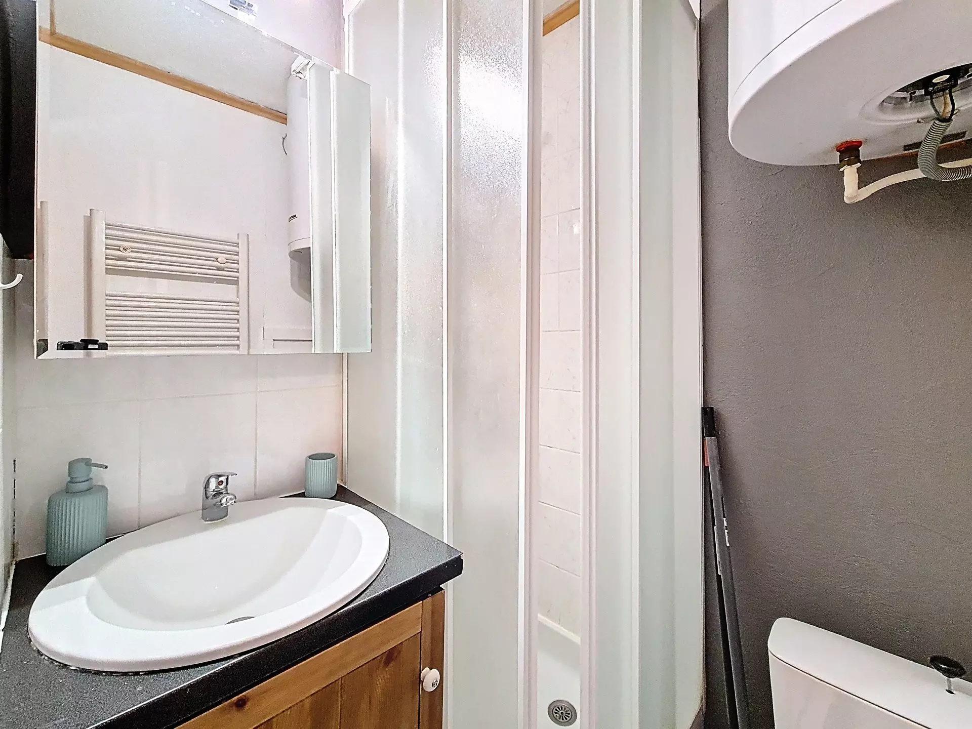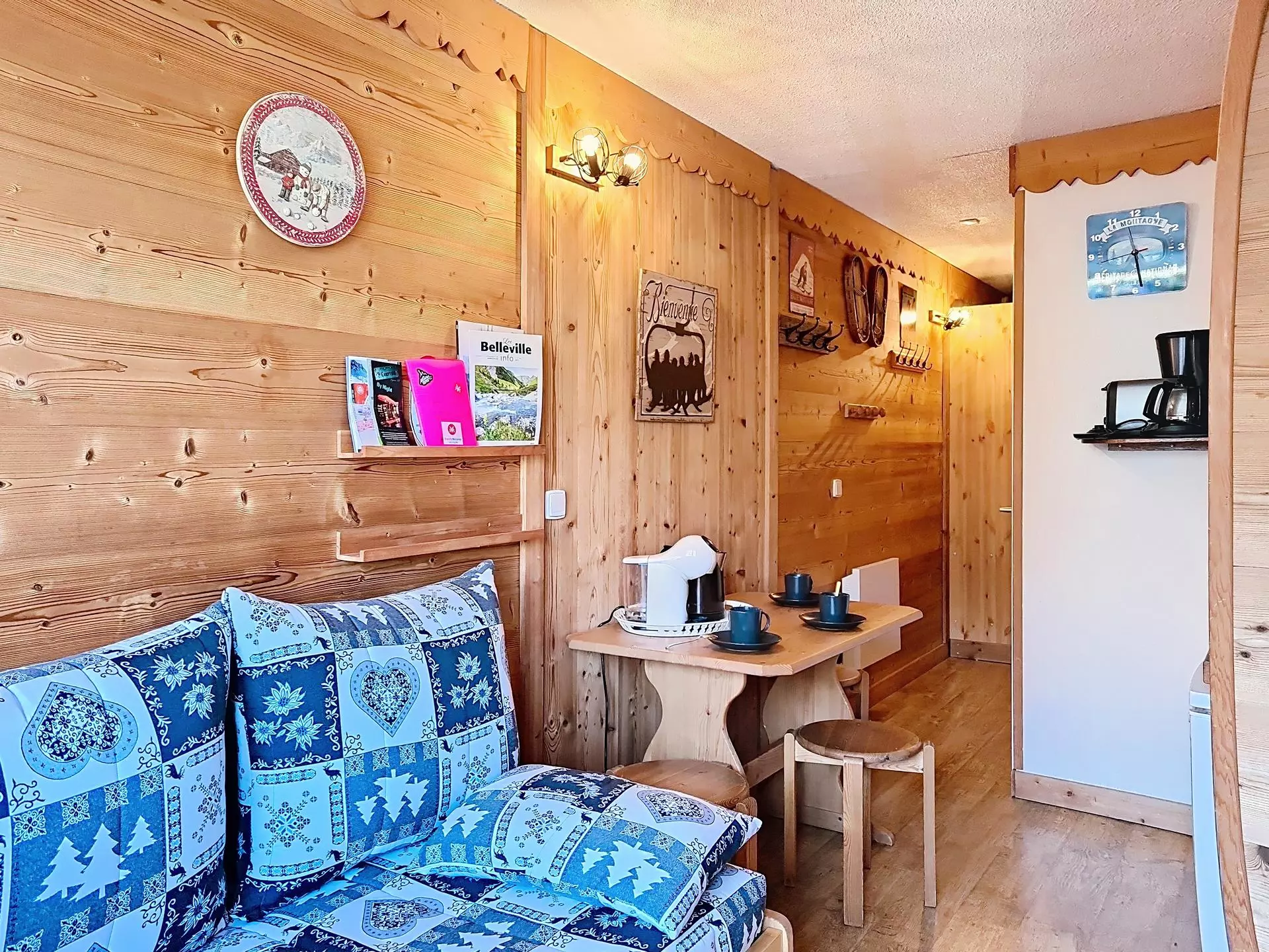 Studio apartment with a sleeping alcove, measuring 17 m², located on the 5th floor with elevator access. It features a southwest-facing balcony with magnificent views of the Masse mountain.