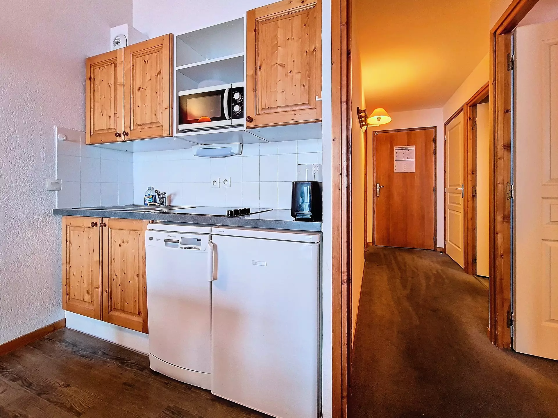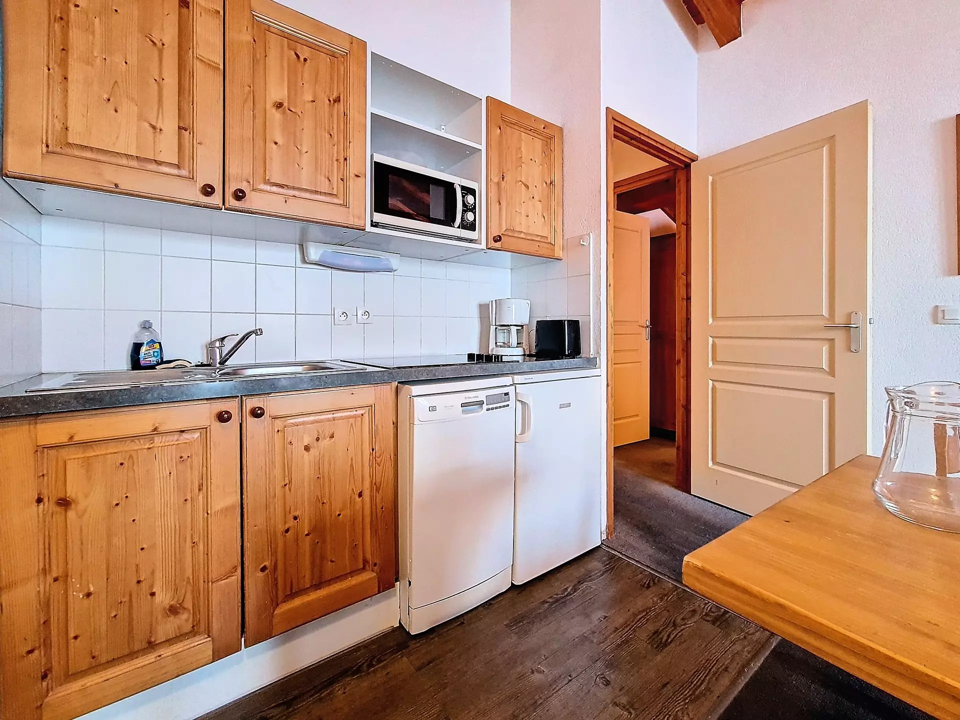 Kitchen equipped with 4 ceramic hobs, microwave, refrigerator, dishwasher, kettle, coffee maker and toaster.