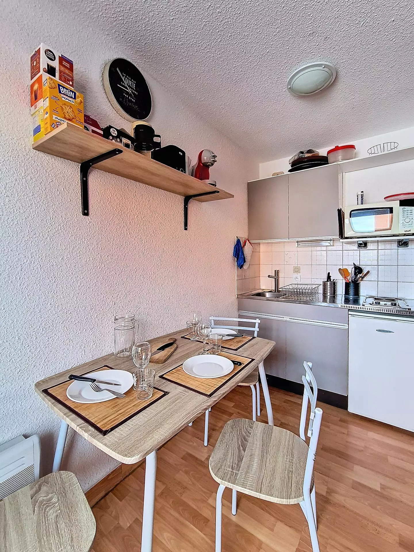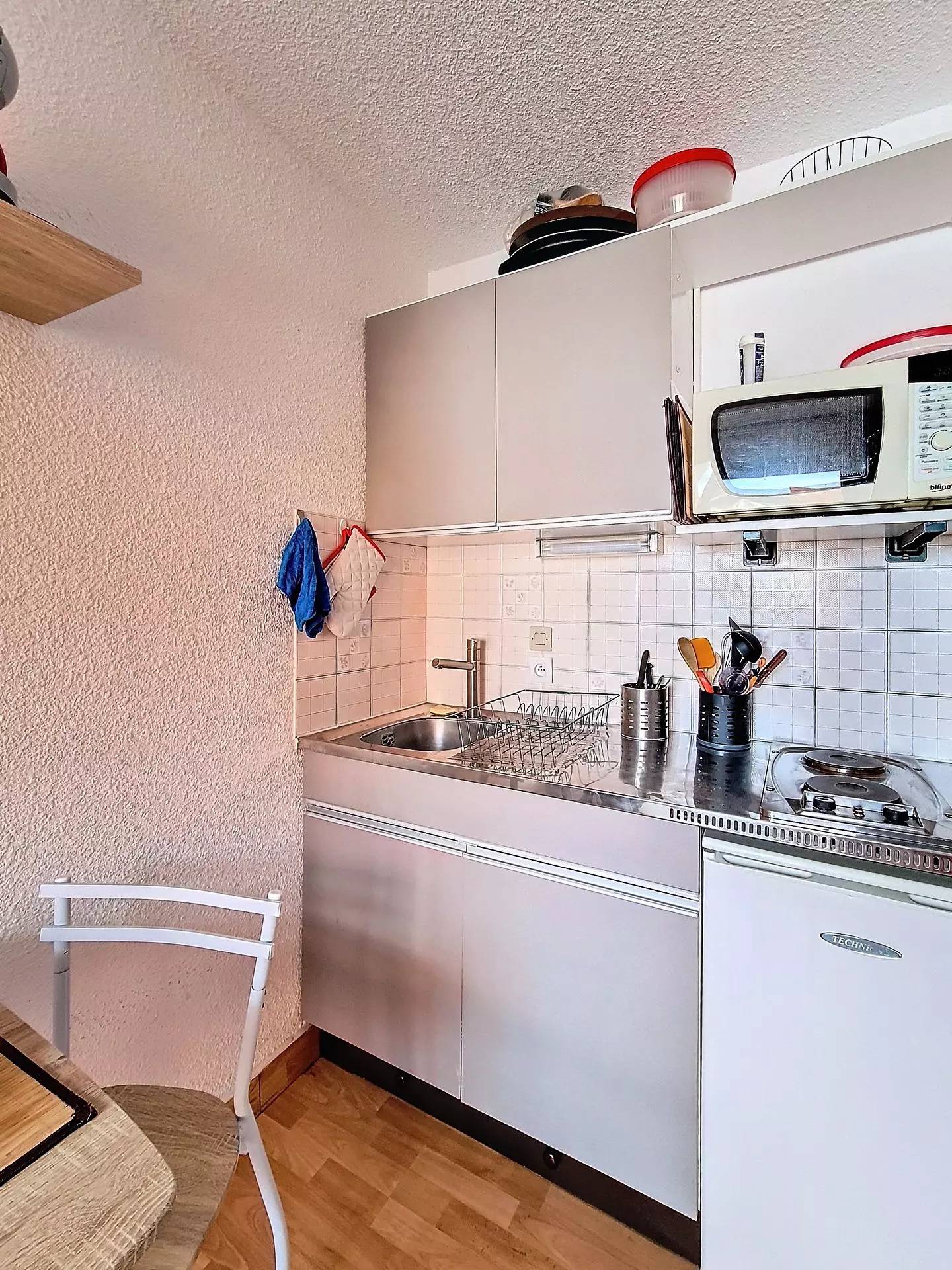 Kitchen equipped with 2 hobs, microwave, refrigerator, kettle, coffee maker and toaster.