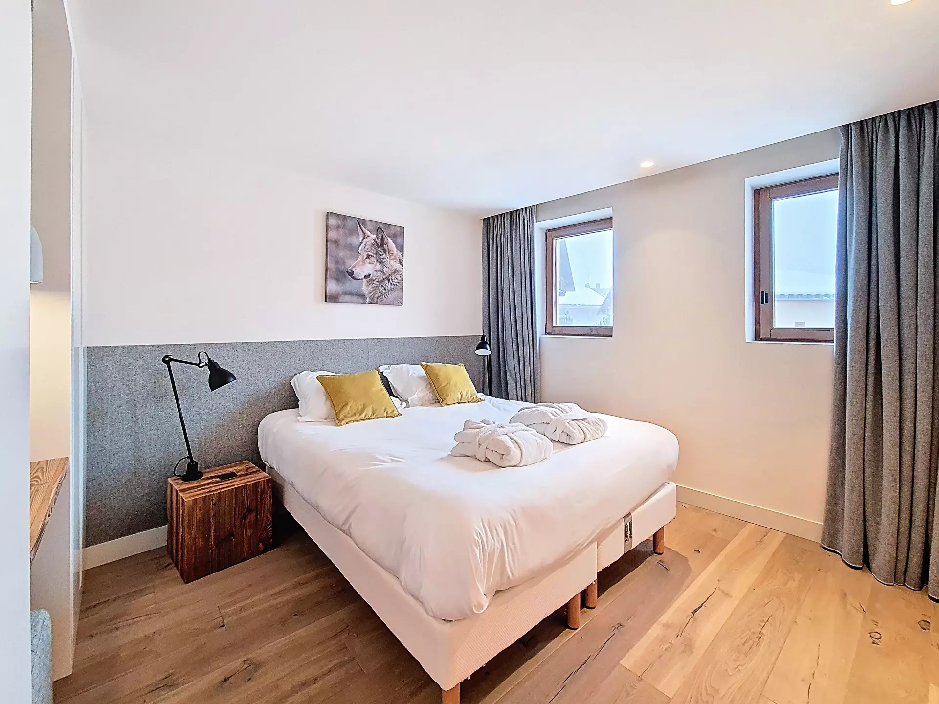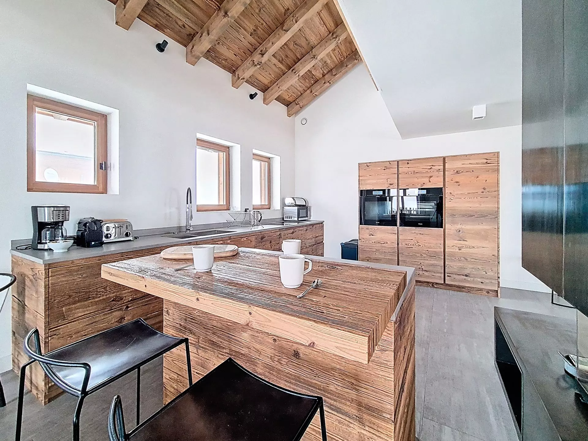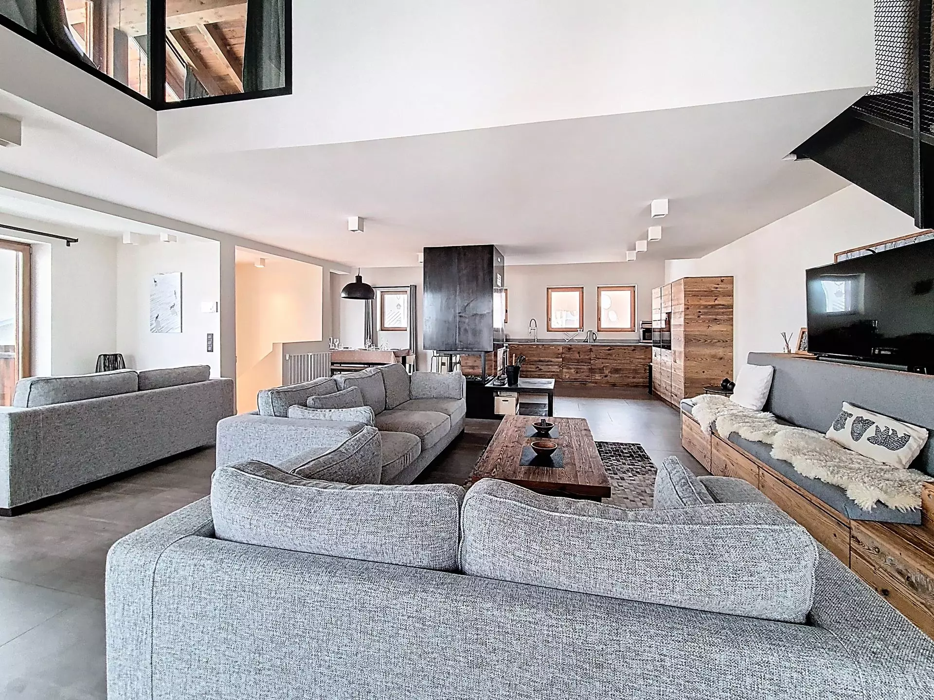 An open-plan living area with access to a living room and a fully equipped kitchen. Two balconies offer unobstructed mountain views.