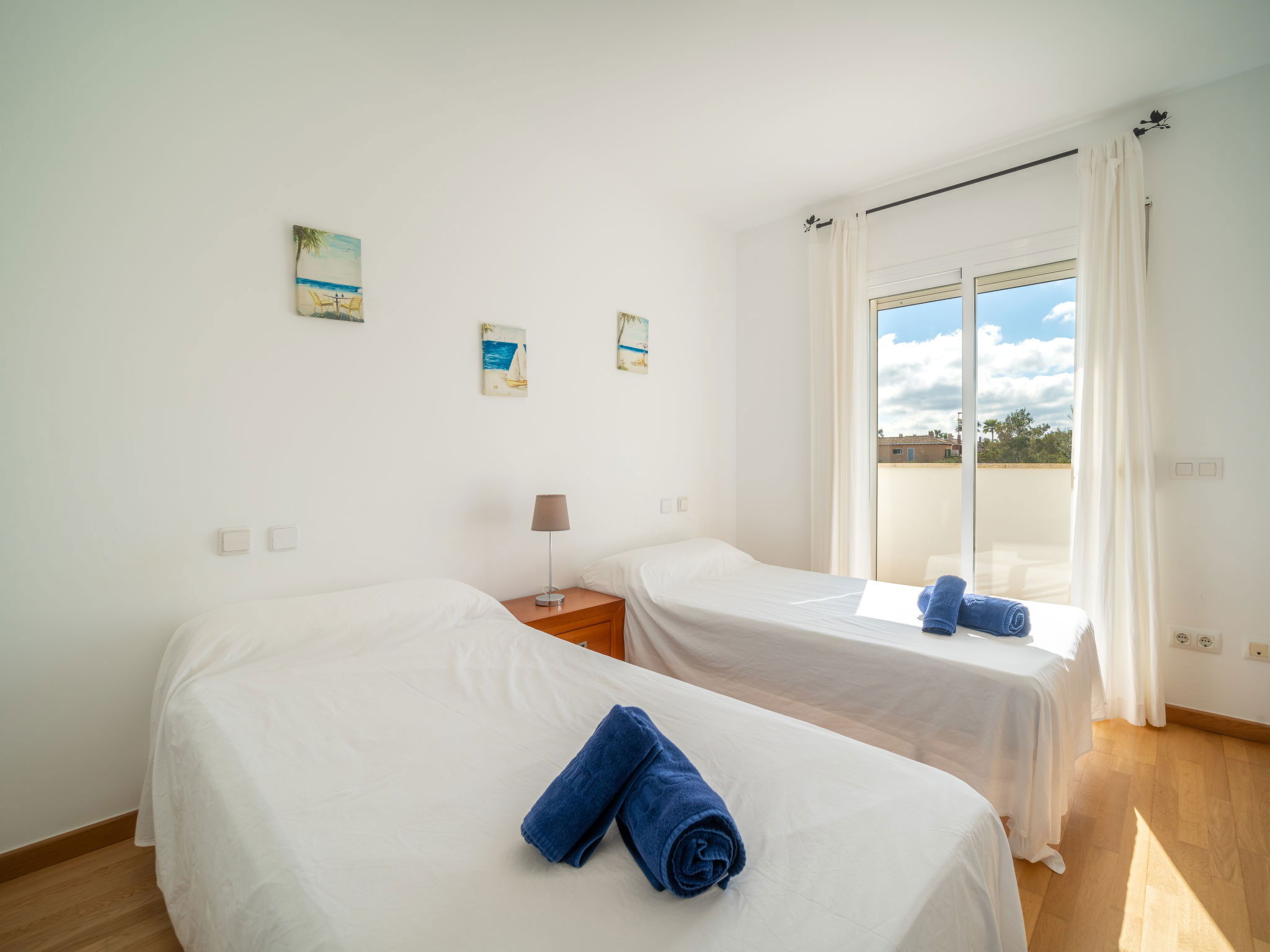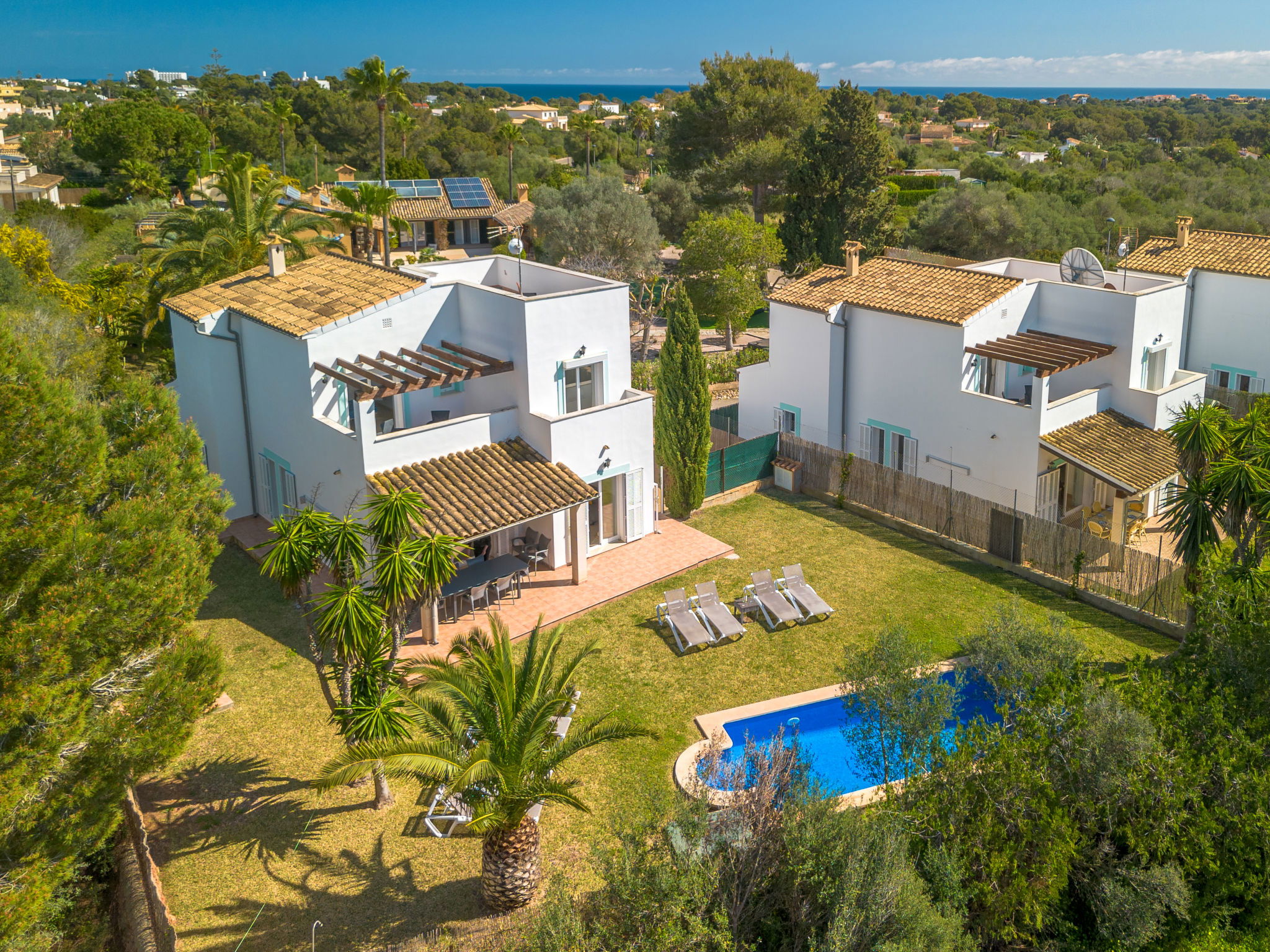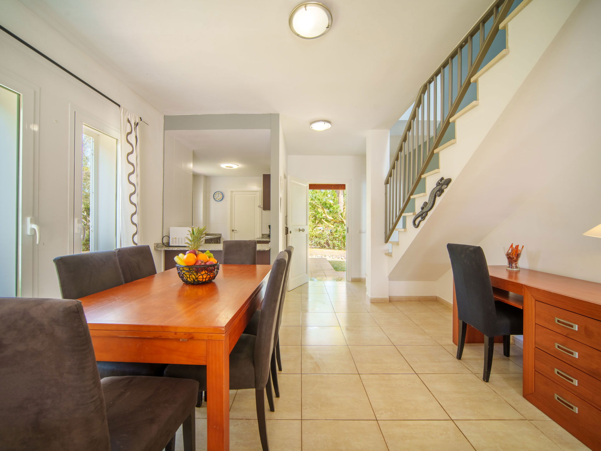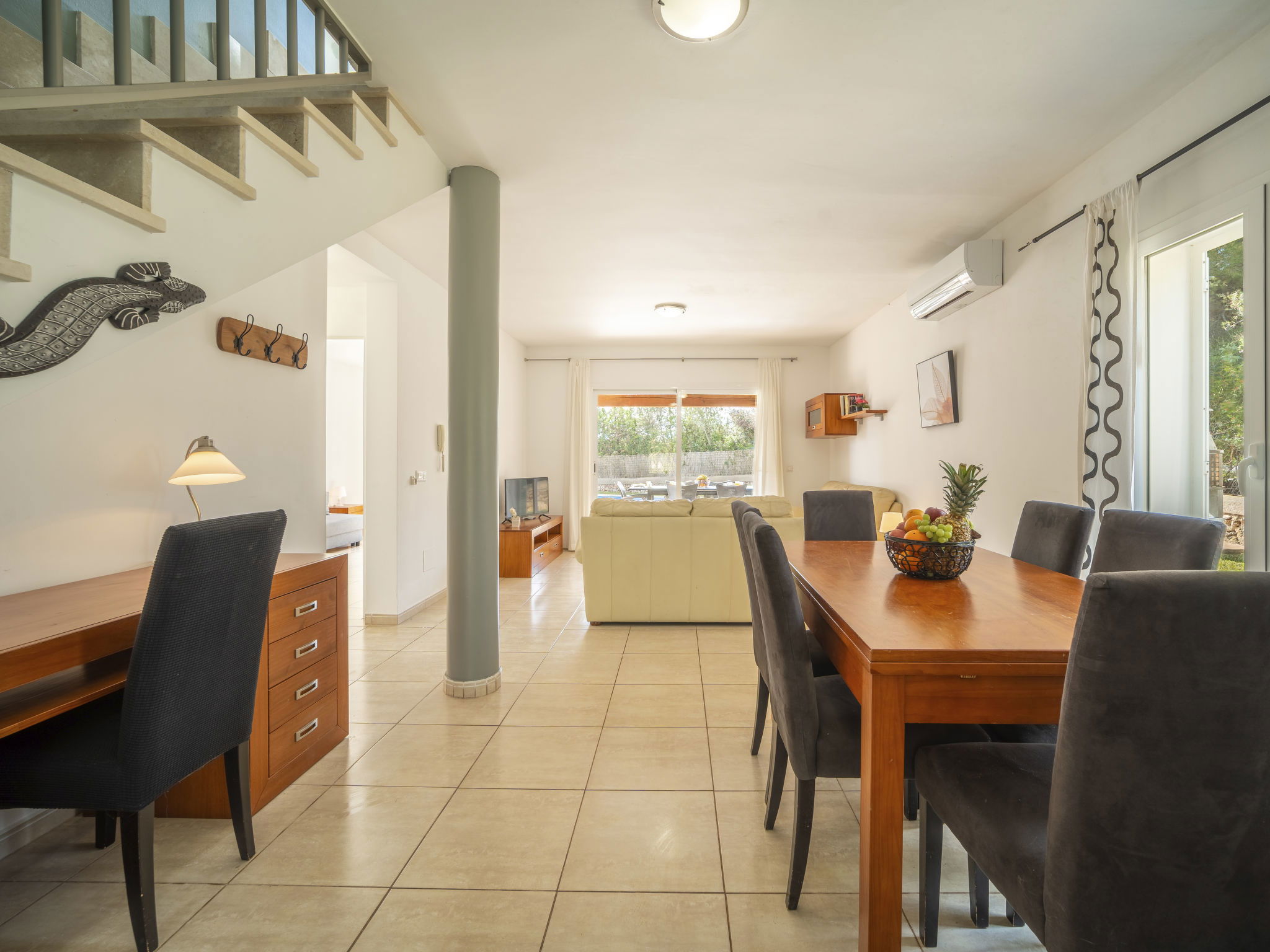 "Son Ganxo III", 4-room terraced house 166 m2. Object suitable for 6 adults. Practical and cosy furnishings: living/dining room with air conditioning and forced-air heating. Exit to the patio, to the swimming pool. 1 room with 2 beds (90 cm, length 190 cm), air conditioning and forced-air heating. Exit to the patio. 1 room with 1 double sofabed (1 x 150 cm, length 190 cm). Open kitchen (oven, dishwasher, 4 ceramic glass hob hotplates, toaster, kettle, microwave, electric coffee machine). Shower/WC. Upper floor: 1 double bedroom with 1 french bed (1 x 180 cm, length 190 cm), air conditioning and forced-air heating. Exit to the balcony. 1 double bedroom with 2 beds (90 cm, length 190 cm), air conditioning and forced-air heating. Exit to the balcony. 2 baths/WC. Air-conditioning, forced-air heating. Heating not available in all rooms. Natural stone floors. Patio, garden, lawn, porch. Terrace furniture, barbecue, deck chairs, covered balcony. View of the countryside. Facilities: washing machine, iron, children's high chair, baby cot for up to 2 year olds, hair dryer. Internet (WiFi, free). Parking at the house. Please note: suitable for families. Non-smoking house. The pool mentioned in the description is for private use. ETV/4520 // Reg. Nr.: ESFCTU00000702300130367600000000000000000000ETV/45209
