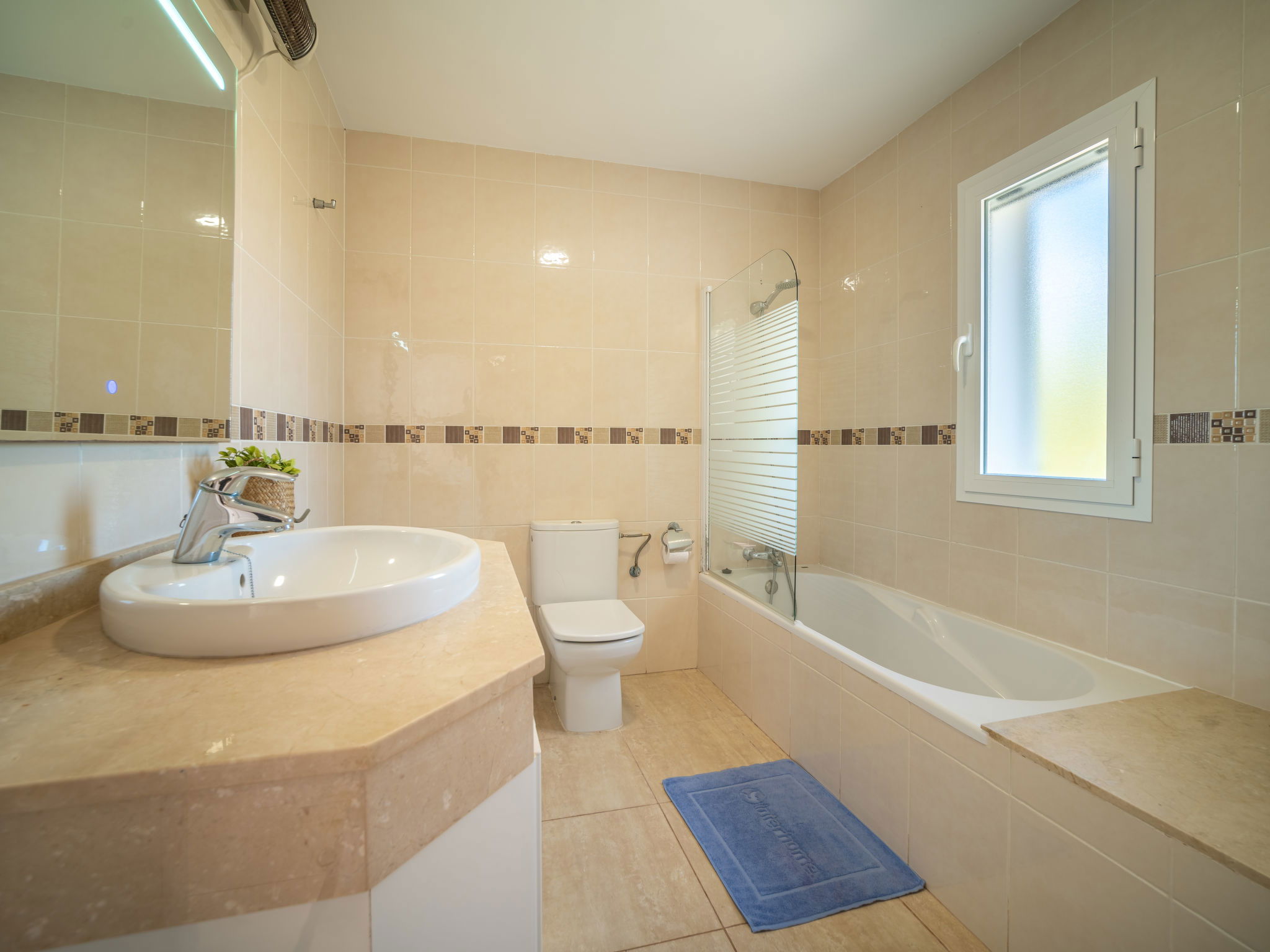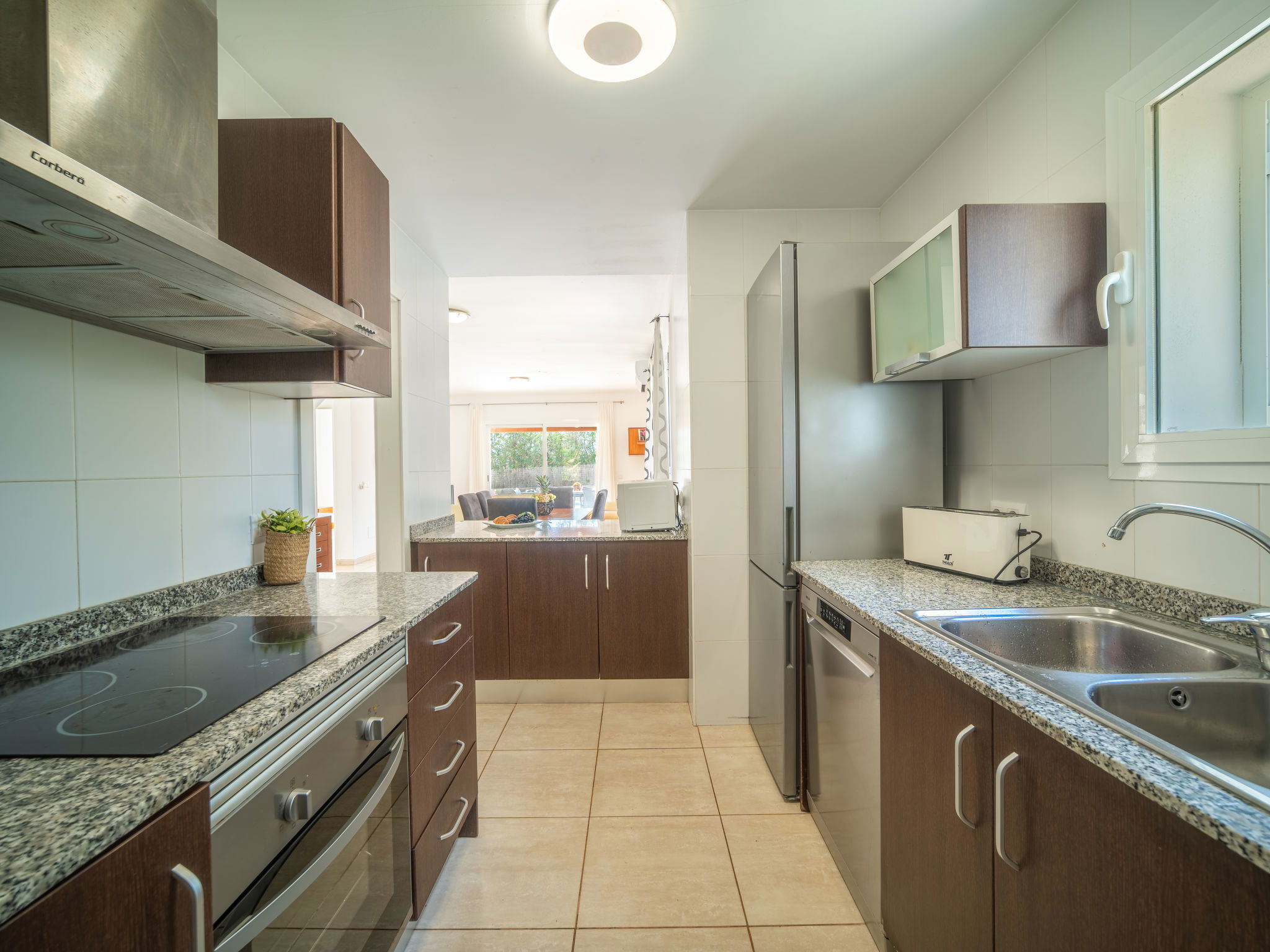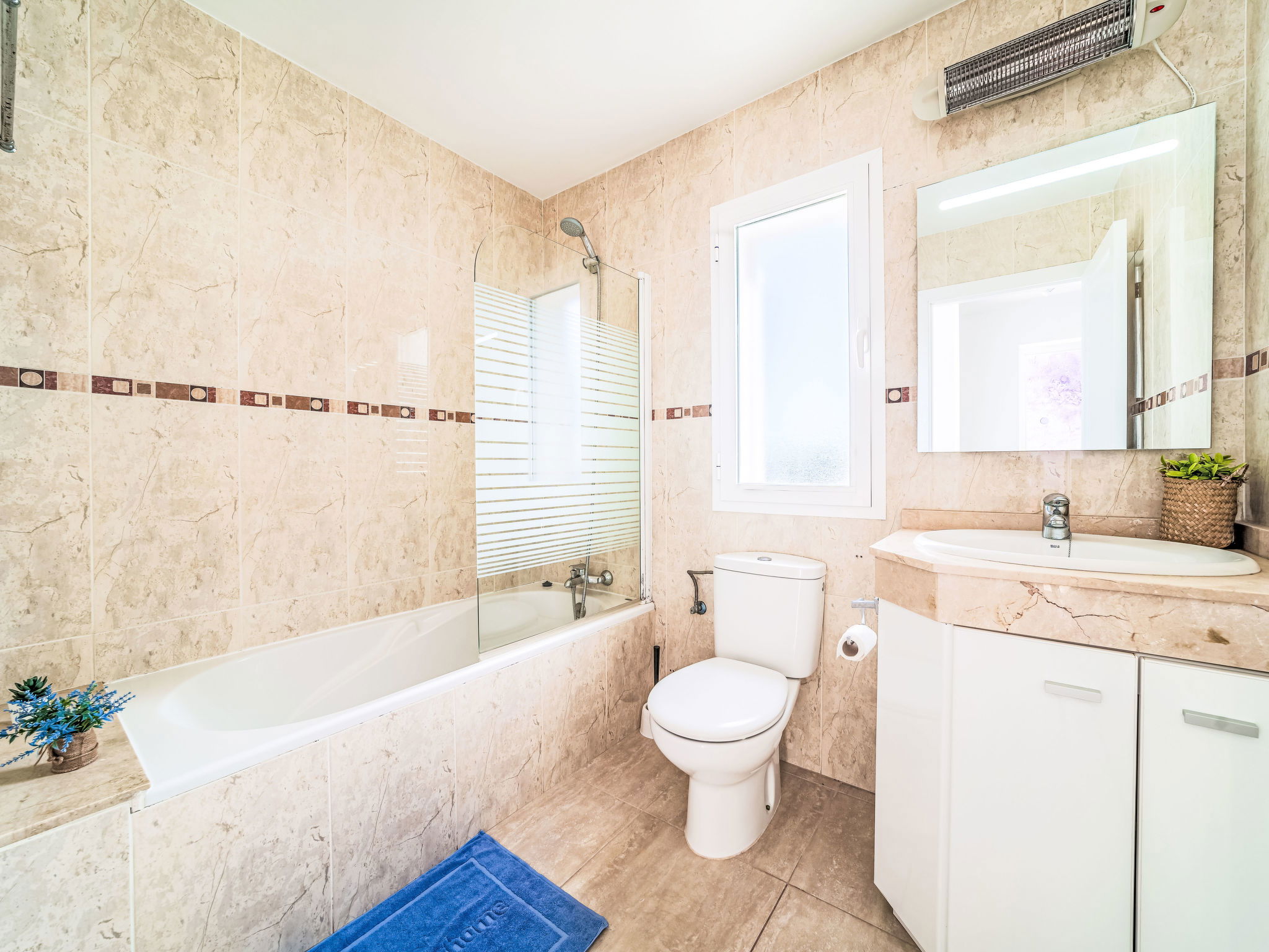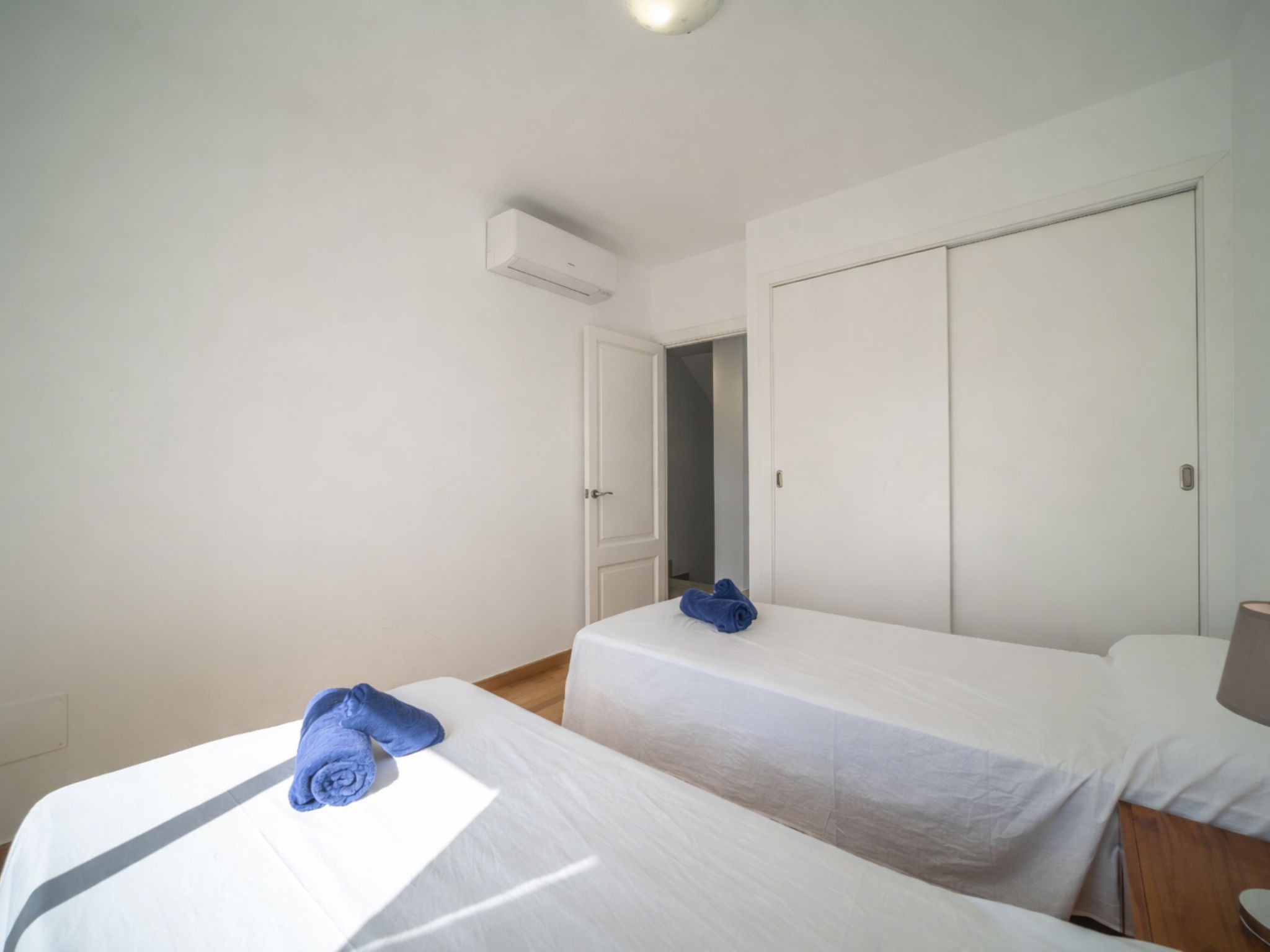 "Son Ganxo III", 4-room terraced house 166 m2. Object suitable for 6 adults. Practical and cosy furnishings: living/dining room with air conditioning and forced-air heating. Exit to the patio, to the swimming pool. 1 room with 2 beds (90 cm, length 190 cm), air conditioning and forced-air heating. Exit to the patio. 1 room with 1 double sofabed (1 x 150 cm, length 190 cm). Open kitchen (oven, dishwasher, 4 ceramic glass hob hotplates, toaster, kettle, microwave, electric coffee machine). Shower/WC. Upper floor: 1 double bedroom with 1 french bed (1 x 180 cm, length 190 cm), air conditioning and forced-air heating. Exit to the balcony. 1 double bedroom with 2 beds (90 cm, length 190 cm), air conditioning and forced-air heating. Exit to the balcony. 2 baths/WC. Air-conditioning, forced-air heating. Heating not available in all rooms. Natural stone floors. Patio, garden, lawn, porch. Terrace furniture, barbecue, deck chairs, covered balcony. View of the countryside. Facilities: washing machine, iron, children's high chair, baby cot for up to 2 year olds, hair dryer. Internet (WiFi, free). Parking at the house. Please note: suitable for families. Non-smoking house. The pool mentioned in the description is for private use. ETV/4520 // Reg. Nr.: ESFCTU00000702300130367600000000000000000000ETV/45209