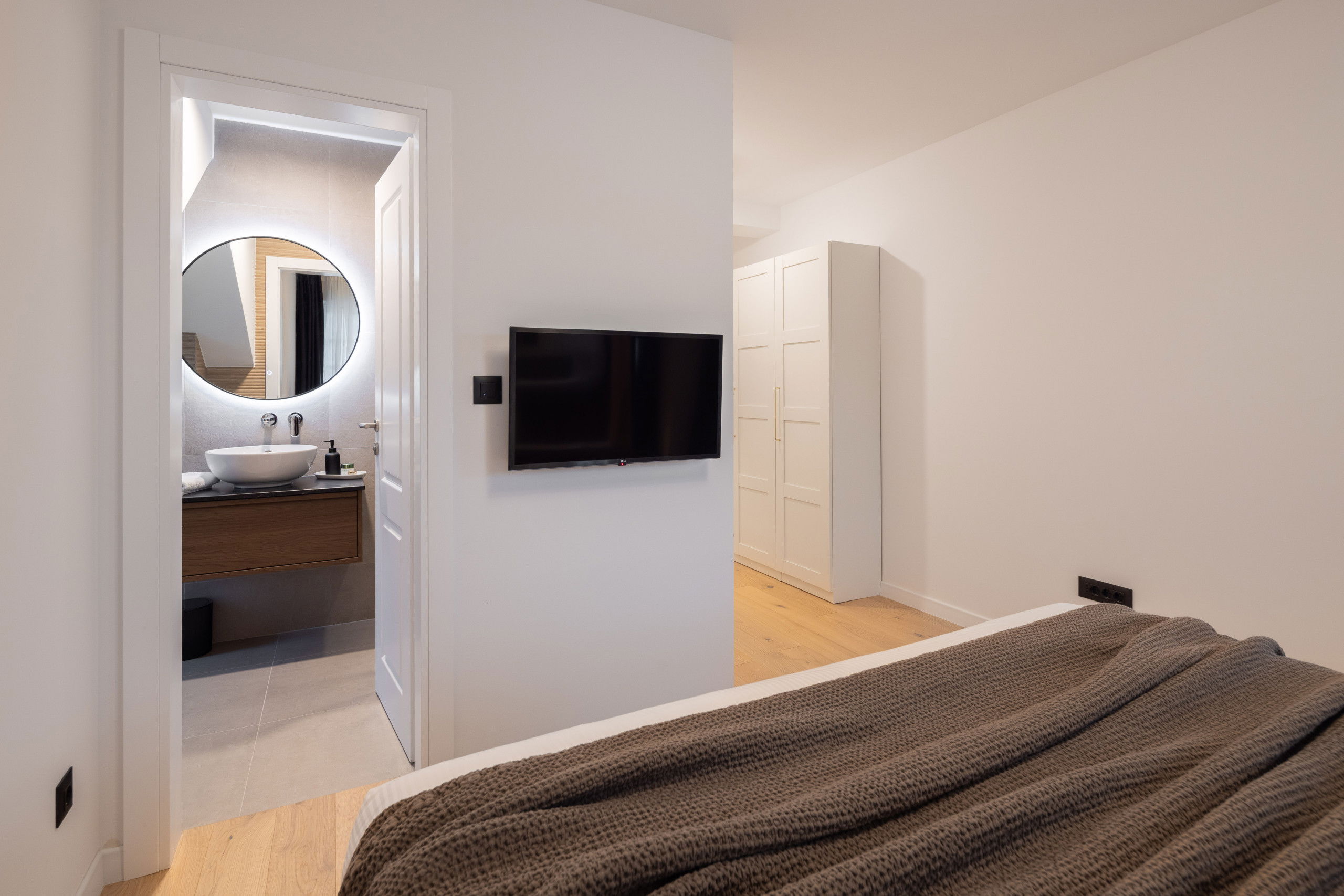 The outdoor area offers a special experience – a spacious terrace with sun loungers and umbrellas, a 20 m² heated saltwater pool with a hydromassage option, and a jacuzzi for complete relaxation and enjoyment. Guests also have access to various board games, table tennis, and a SUP board for active recreation.