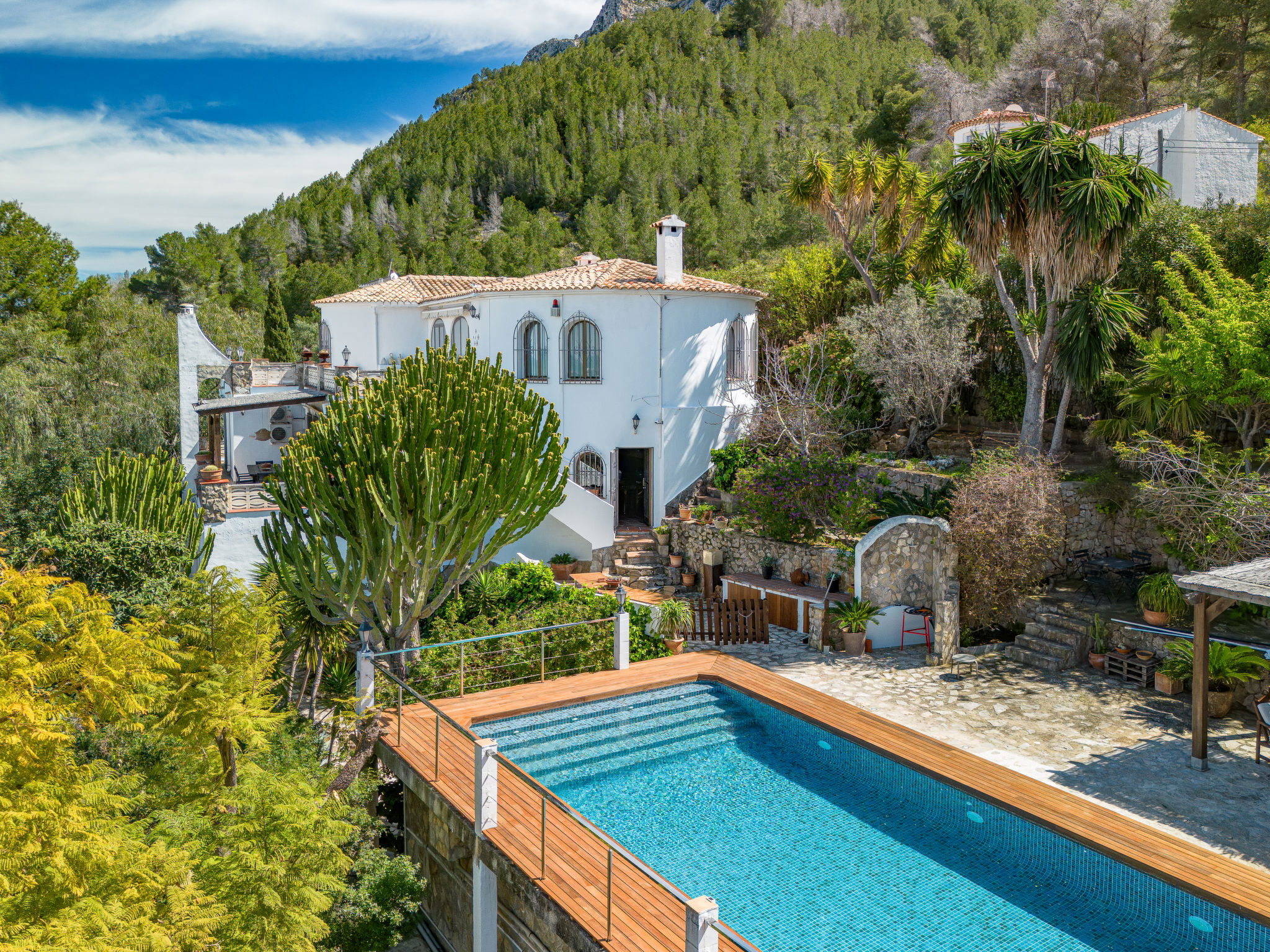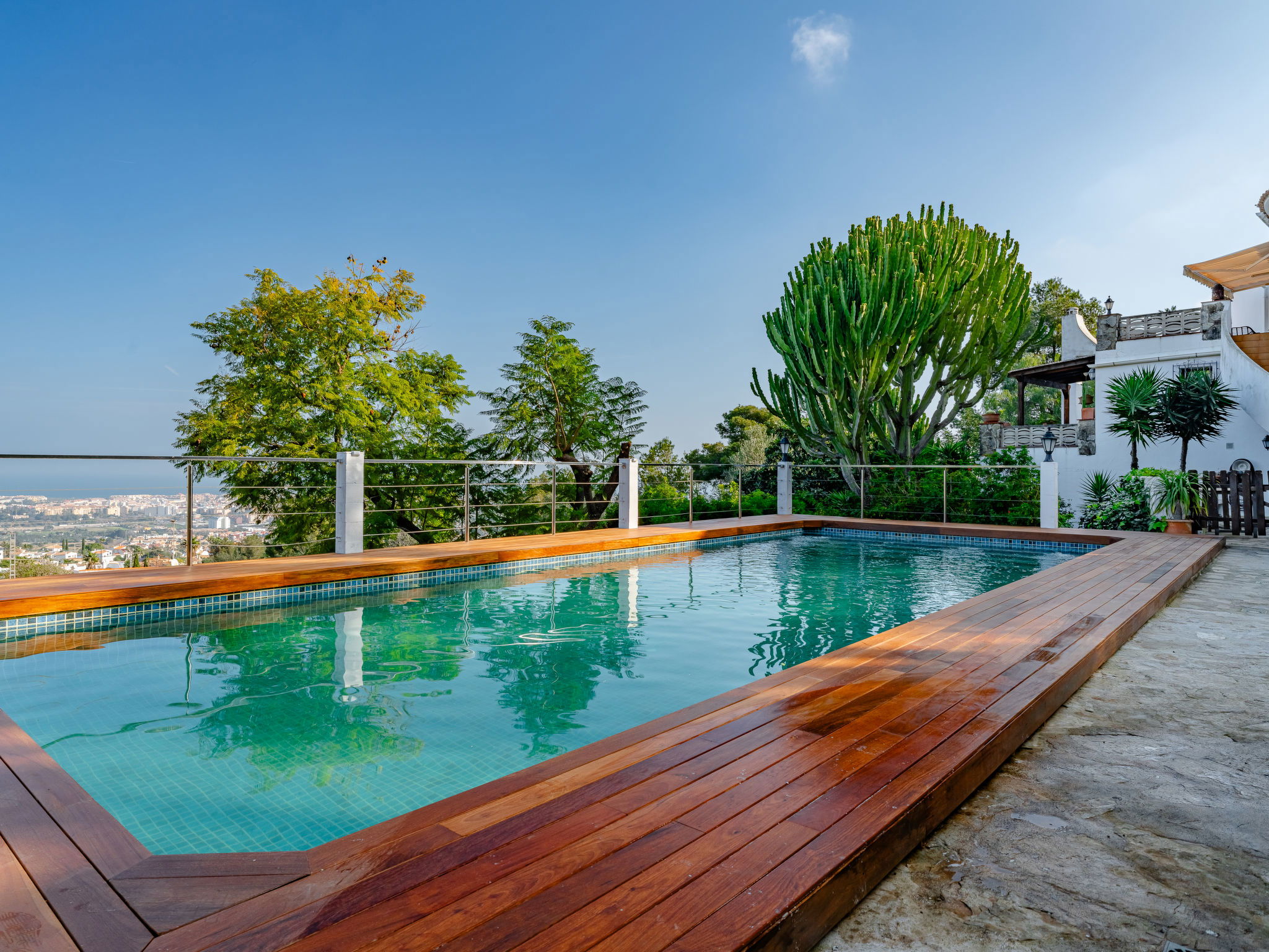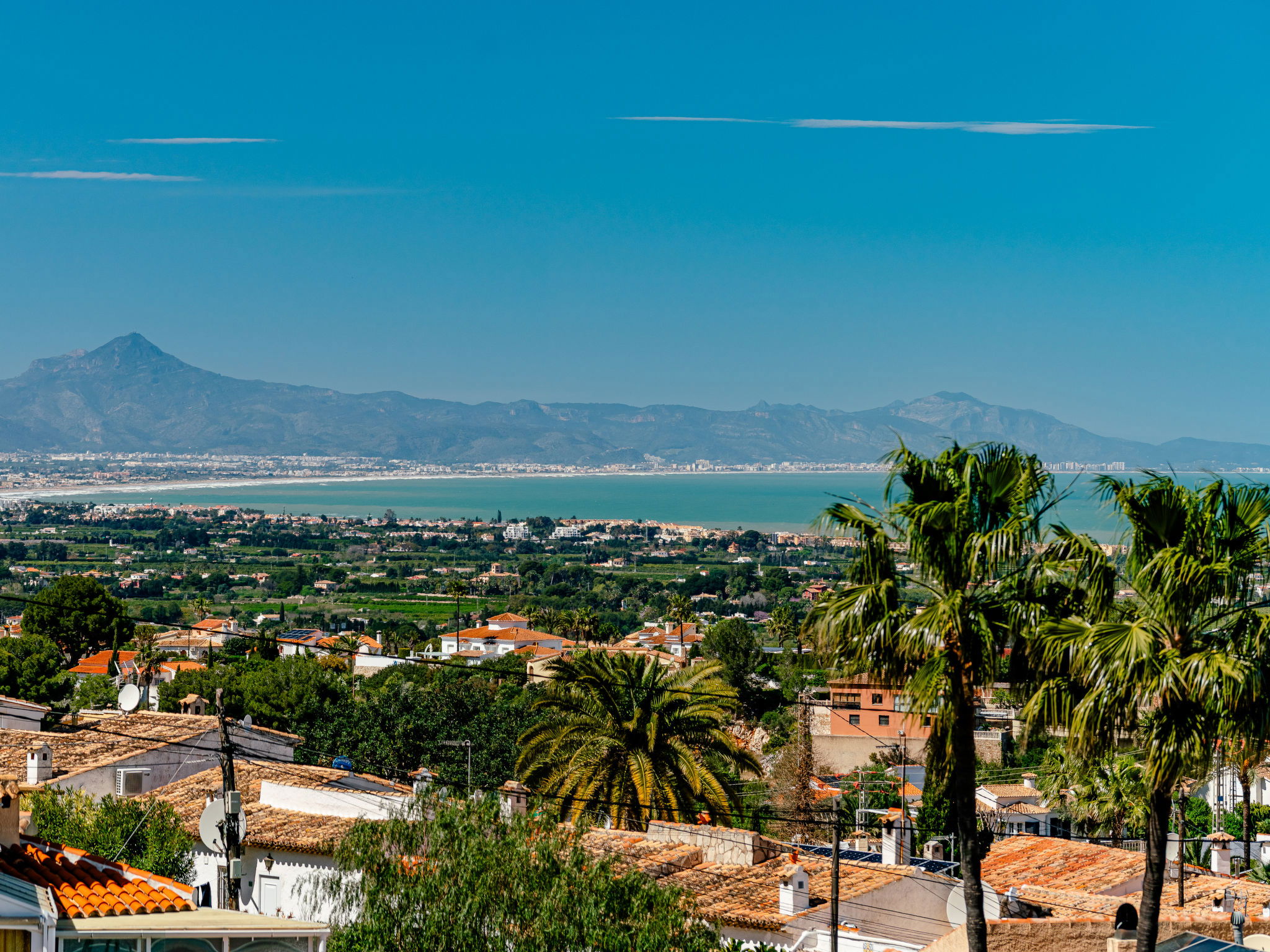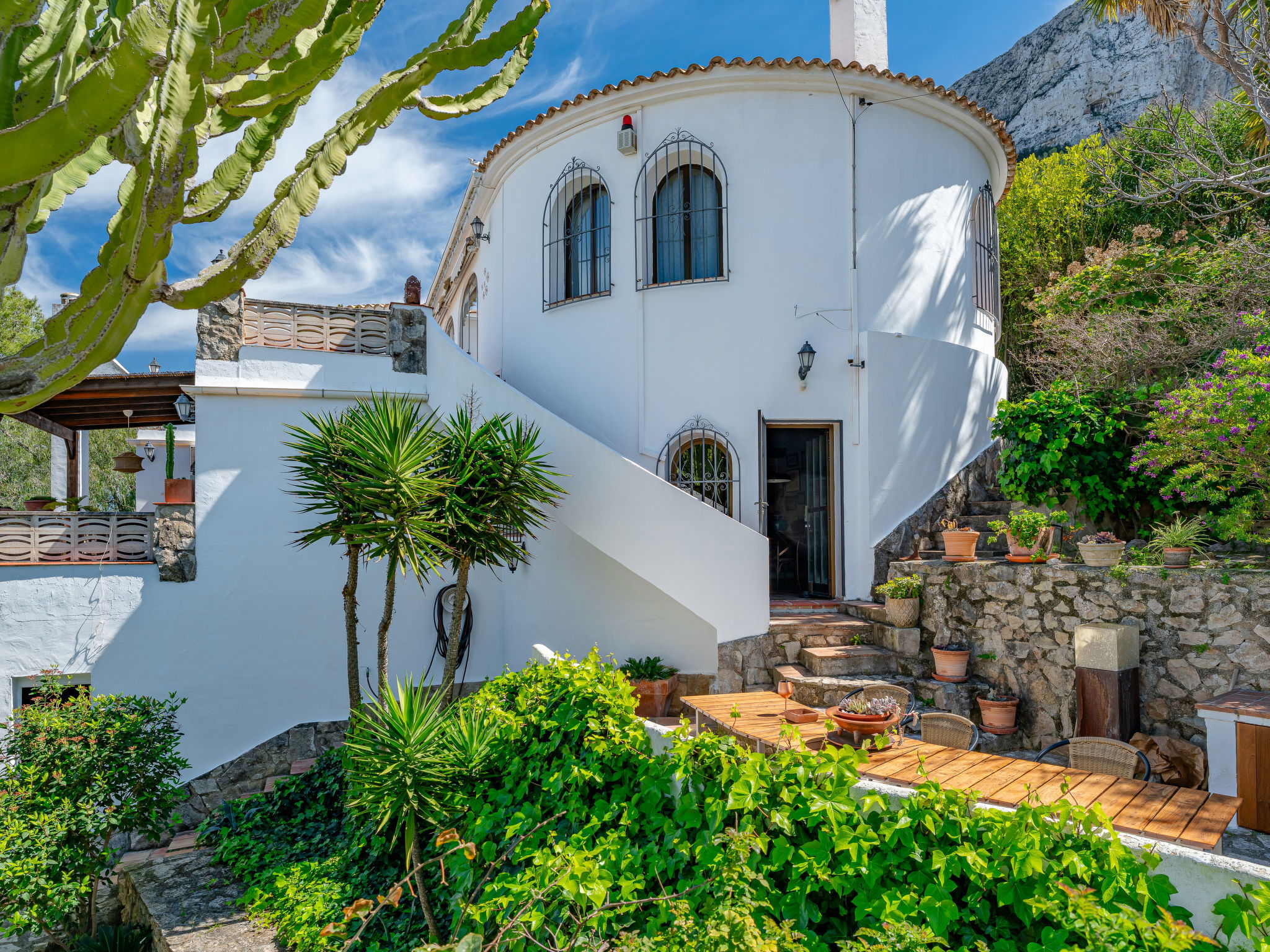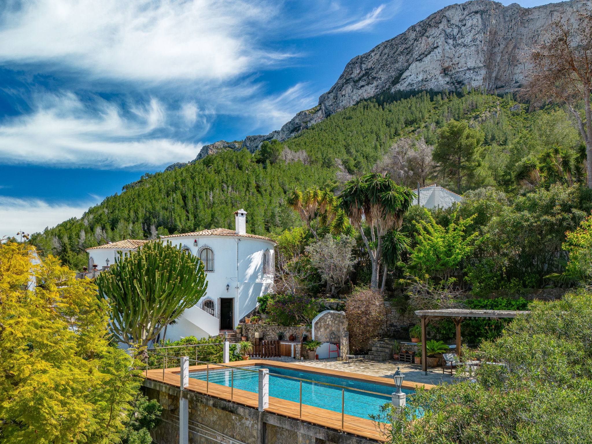 Very large, very beautiful, very comfortable villa "Horizonte", 2 storeys, surrounded by trees. In the district of Montgo Denia, in the resort 2.5 km from the centre of Denia, in a quiet, sunny position residential area (villas), 3.5 km from the sea, 3.8 km from the beach. Private: large, beautiful terraced garden, swimming pool angular (10 x 5 m, depth 40 - 220 cm, seasonal availability: 01.Jan. - 31.Dec.) with internal staircase. Outdoor shower, pergola, garden furniture. Supermarket 2.2 km, restaurant 1.4 km, café 1.4 km, bus stop 2.8 km, railway station 3.5 km, sandy beach "Marineta Cassiana" 3.8 km. Sports harbour 3.8 km, surf school 3.8 km, sailing school 3.8 km.