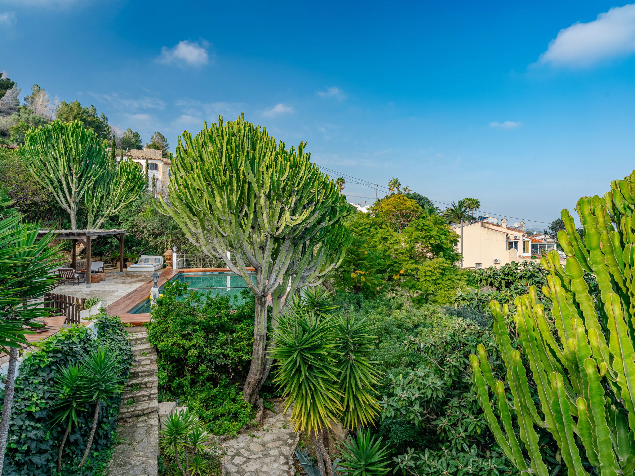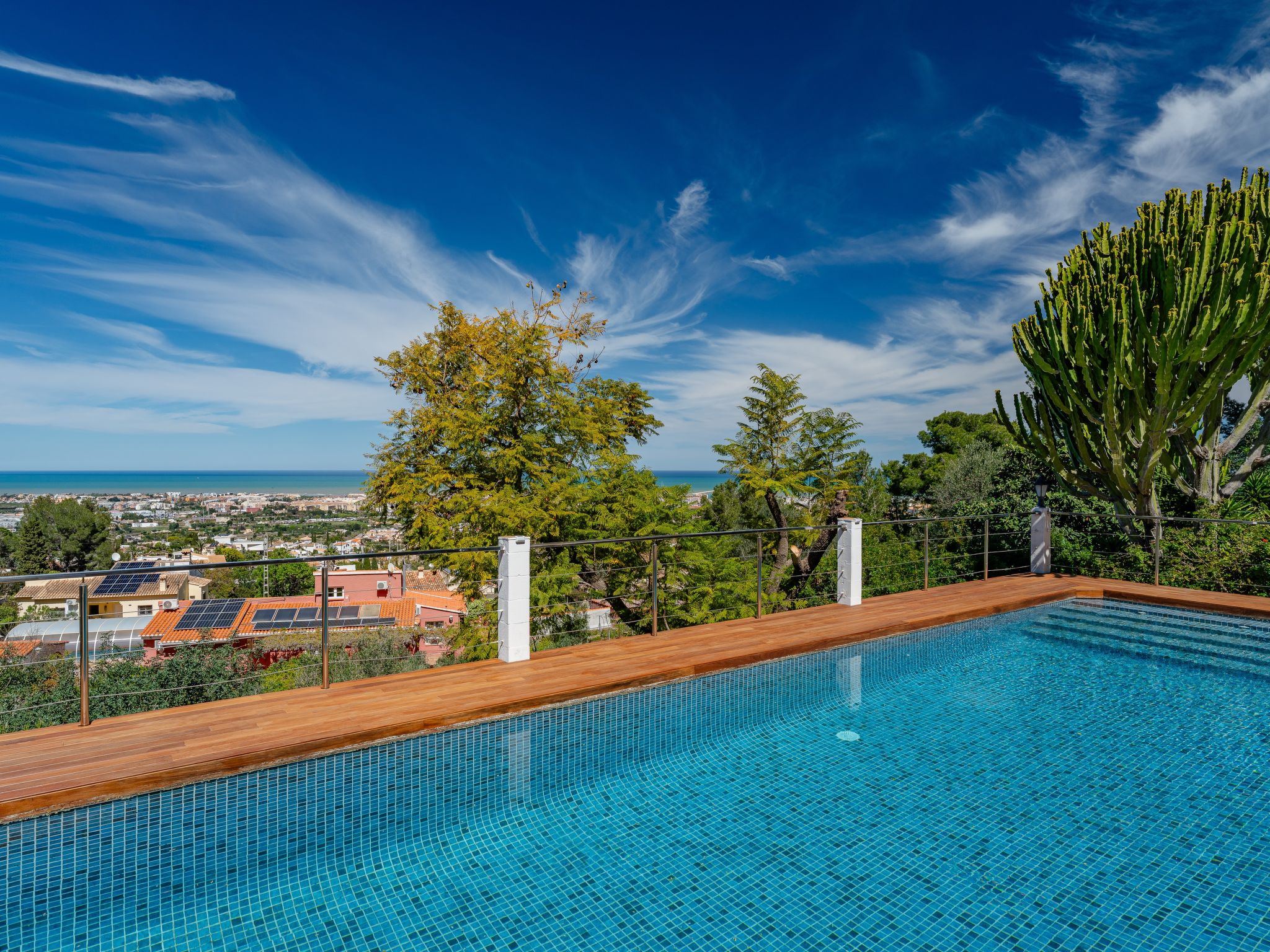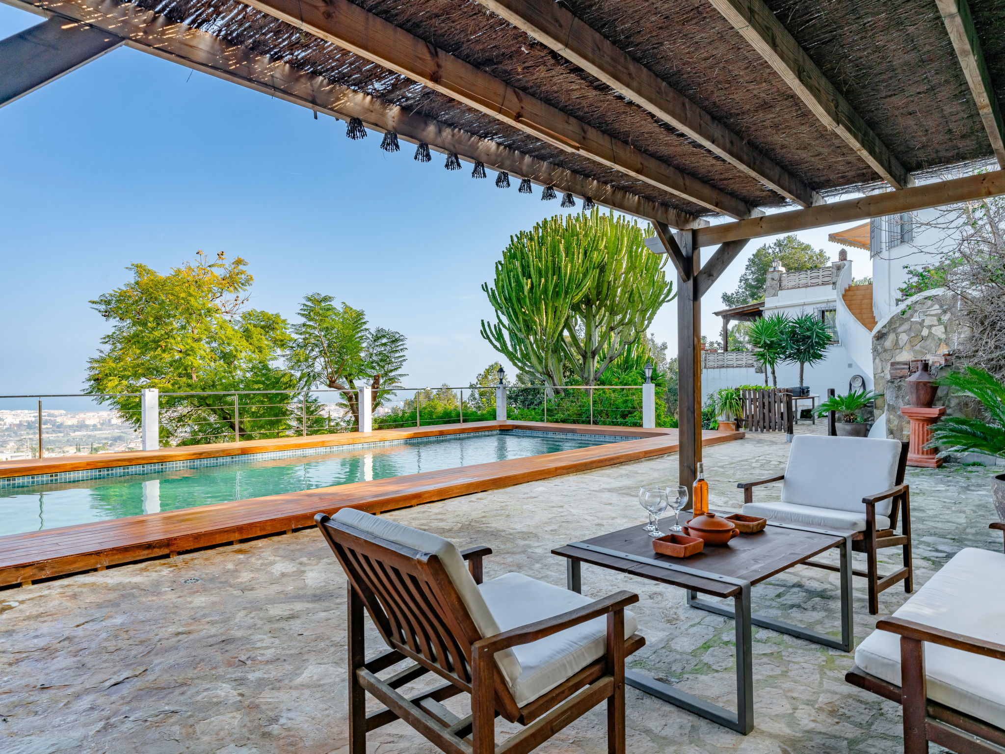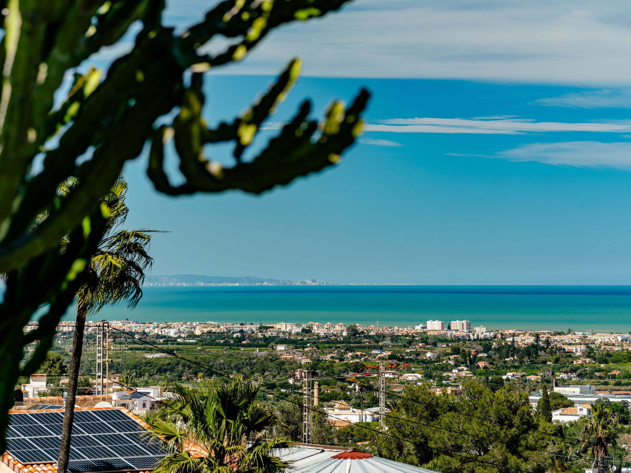 Very large, very beautiful, very comfortable villa "Horizonte", 2 storeys, surrounded by trees. In the district of Montgo Denia, in the resort 2.5 km from the centre of Denia, in a quiet, sunny position residential area (villas), 3.5 km from the sea, 3.8 km from the beach. Private: large, beautiful terraced garden, swimming pool angular (10 x 5 m, depth 40 - 220 cm, seasonal availability: 01.Jan. - 31.Dec.) with internal staircase. Outdoor shower, pergola, garden furniture. Supermarket 2.2 km, restaurant 1.4 km, café 1.4 km, bus stop 2.8 km, railway station 3.5 km, sandy beach "Marineta Cassiana" 3.8 km. Sports harbour 3.8 km, surf school 3.8 km, sailing school 3.8 km.