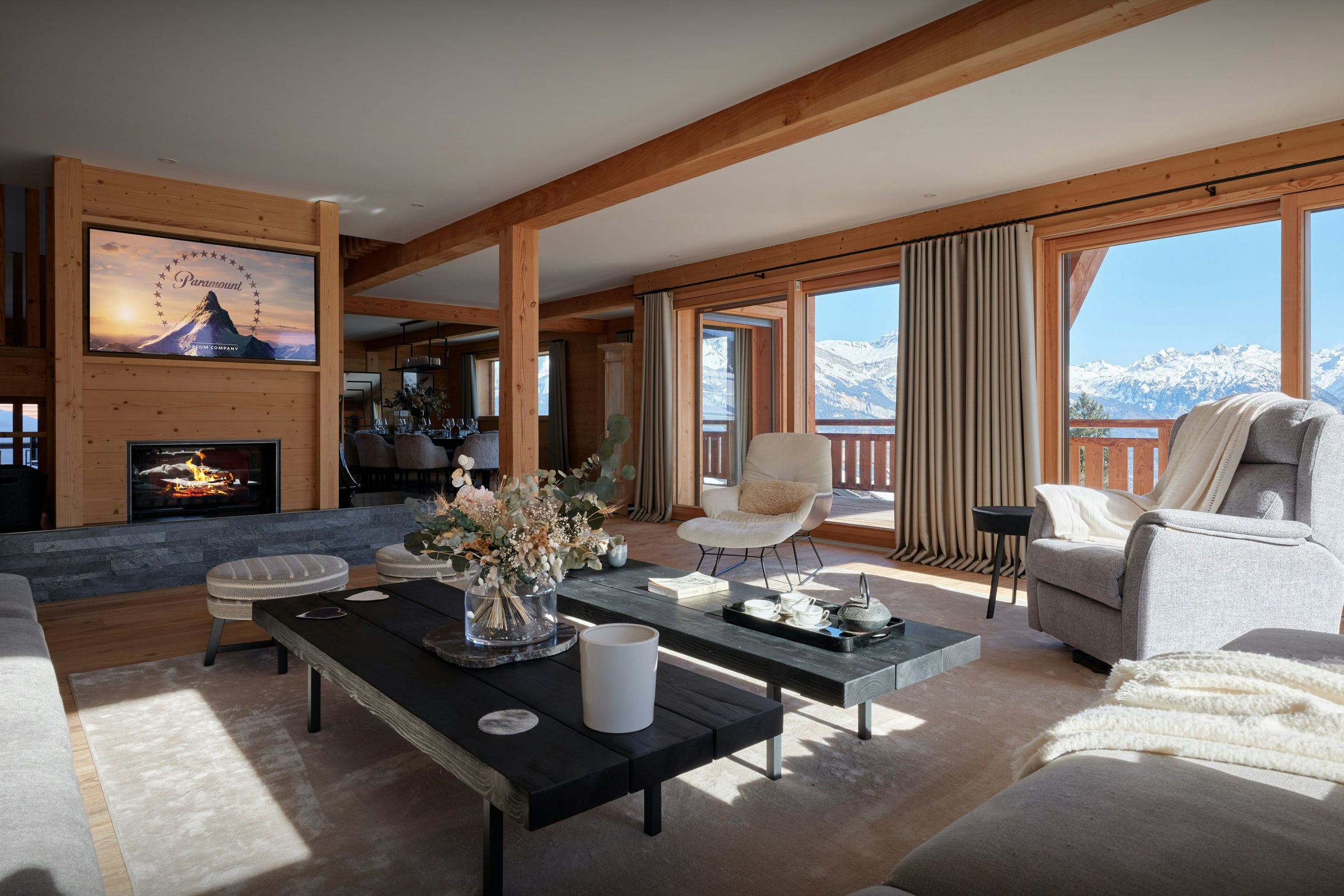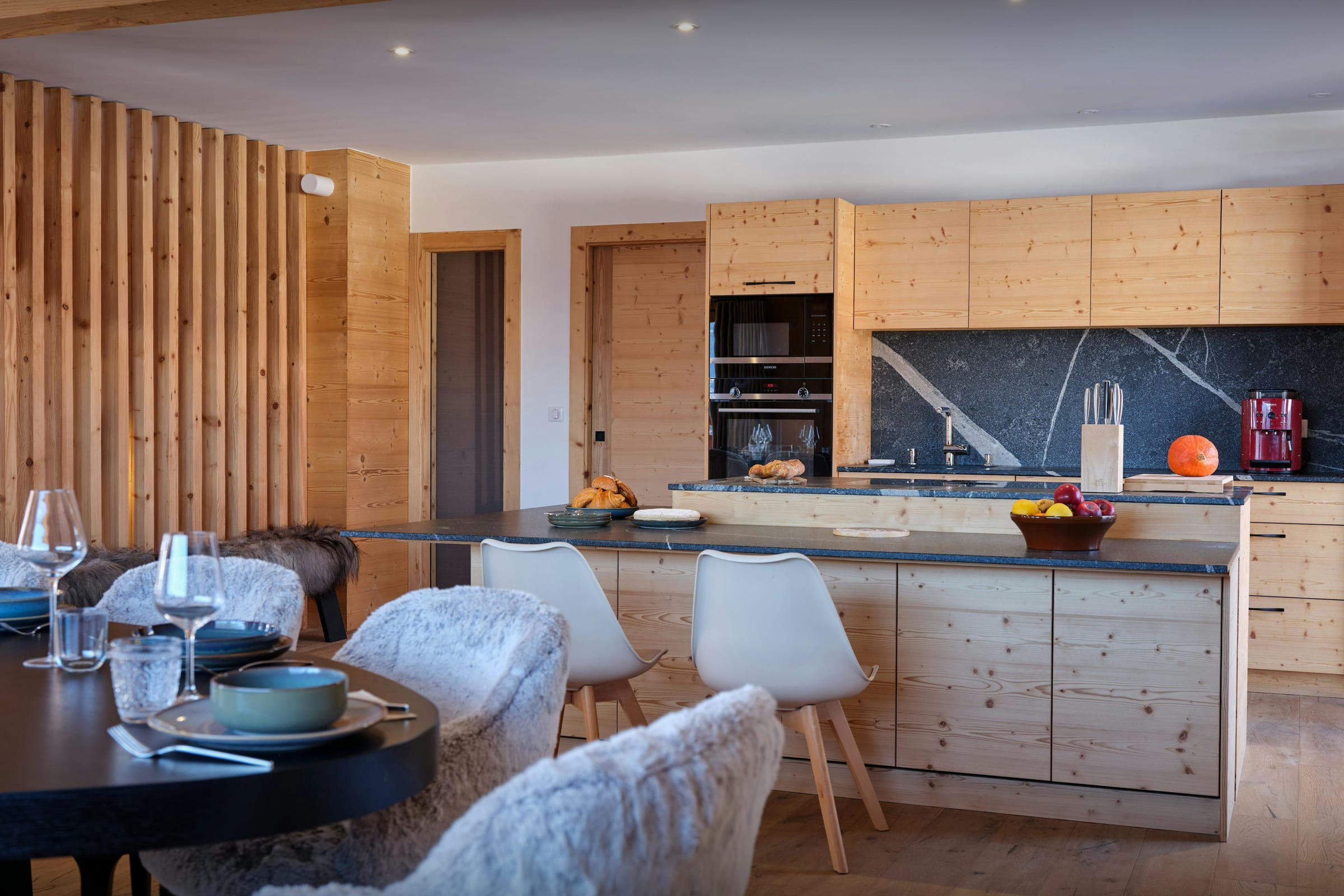 The large open-plan living room is the heart of the chalet. Looking out over the mountains, it enjoys beautiful light and balconies that invite you to step outside. Its central fireplace will make for cosy evenings in the two seating areas. There's a well-equipped kitchen and a dining table big enough for everyone to eat together.