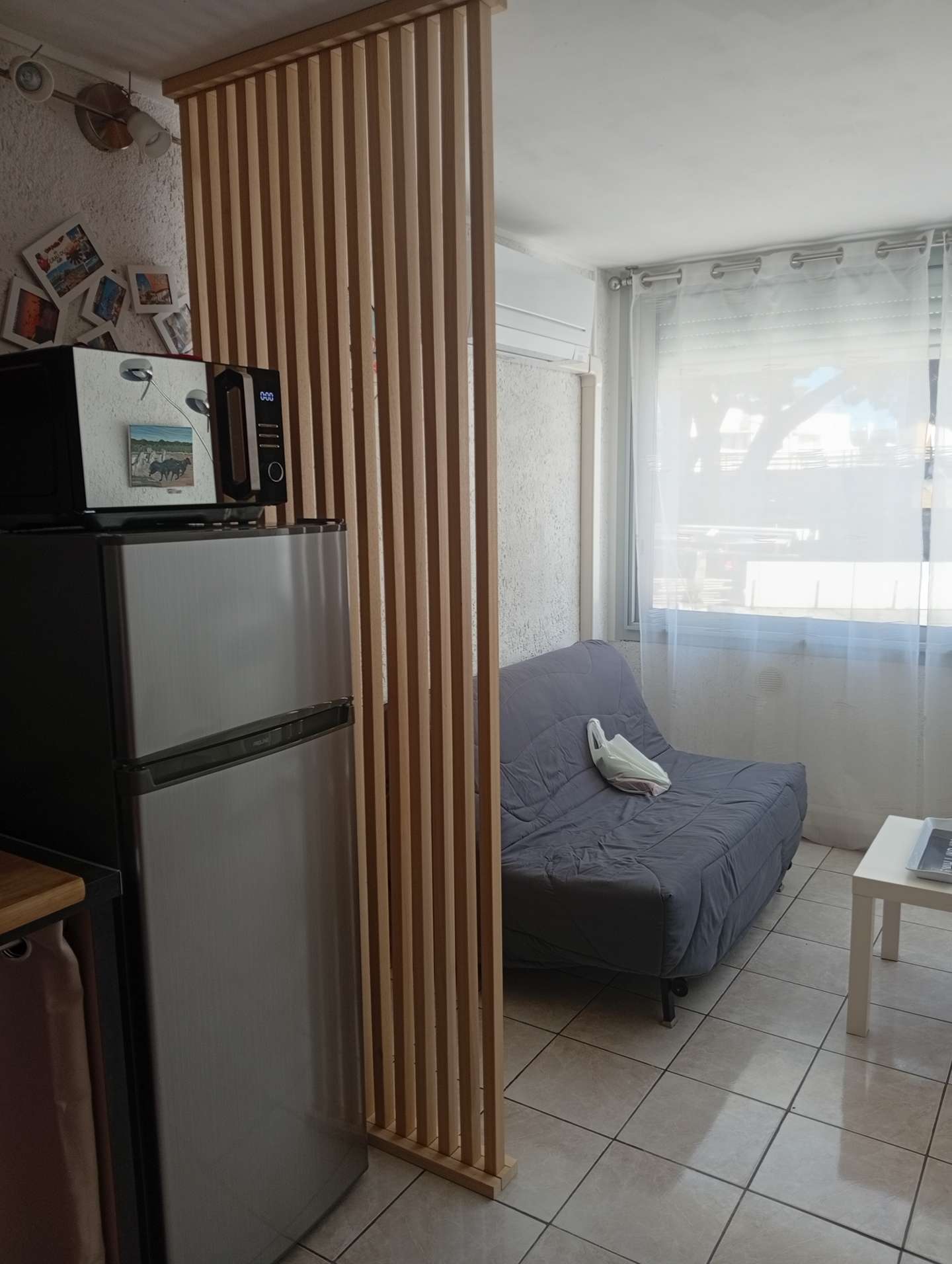 This accommodation is located on the 1st floor of the "Le Trimaran" residence, in the North beach area of Port Camargue. It comprises an entrance hall with storage cupboards; a living room with a 140cm Murphy bed and a single sofa bed; a kitchenette equipped with a fridge-freezer; a washing machine; and a bathroom with shower and toilet.
