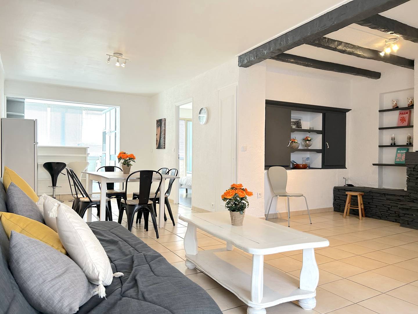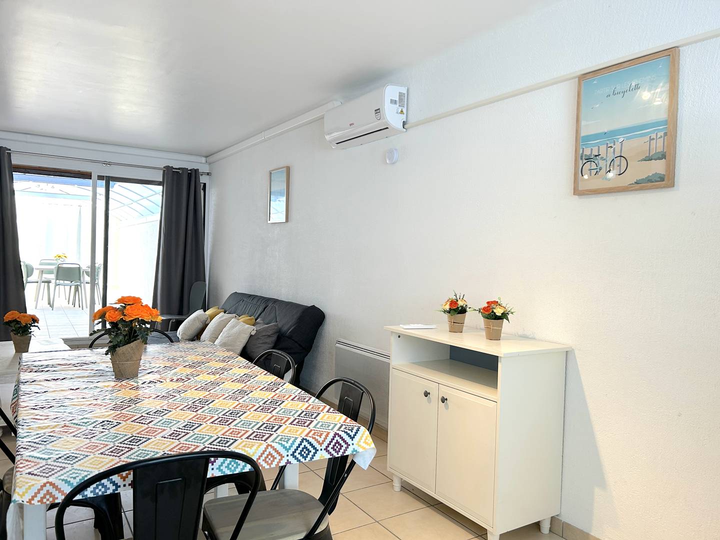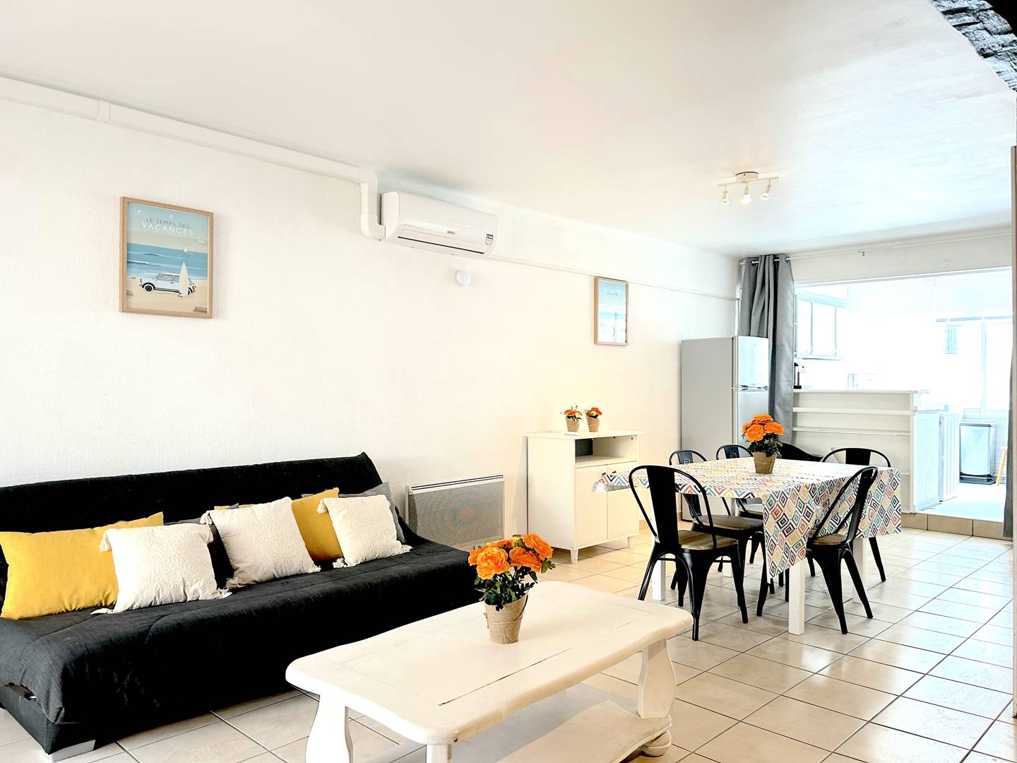 This air-conditioned cabin-style apartment of approximately 70 m² located on the floor of shops, with ground floor access, facing SOUTH, is equipped with a two-person sofa bed (140) in the living room, a bedroom with a 140 bed and its shower room, an equipped kitchen open to the living room and a separate toilet.