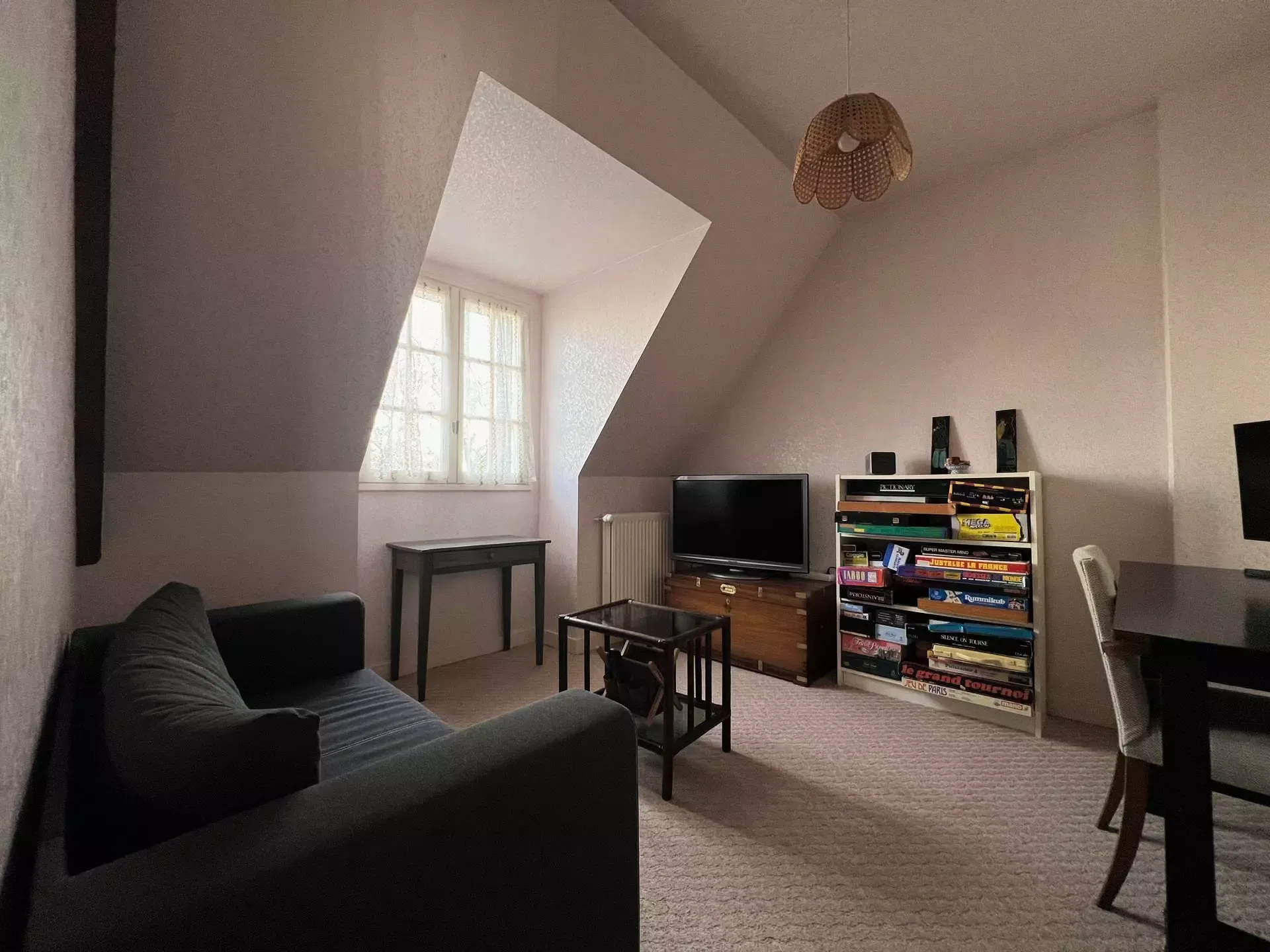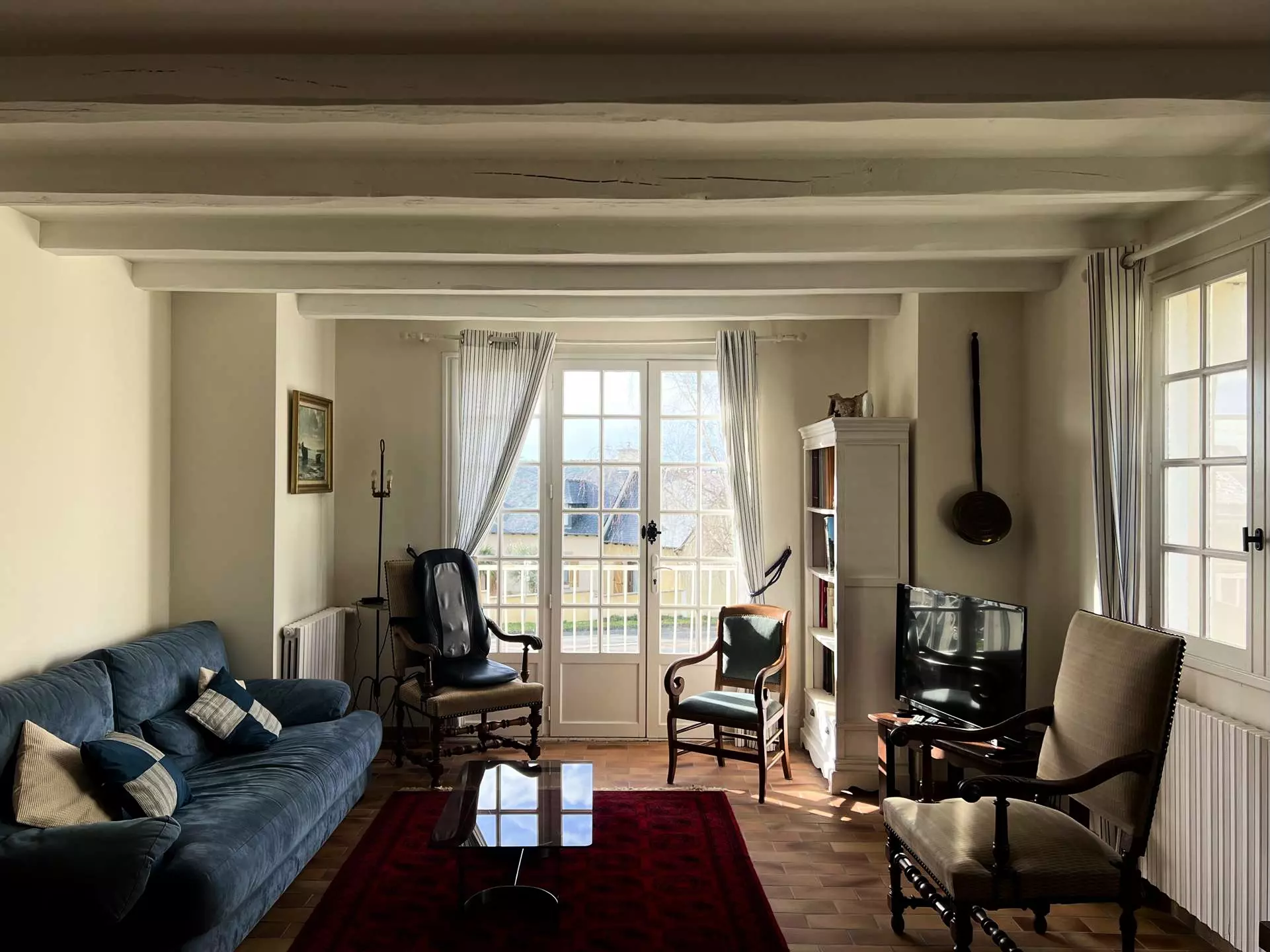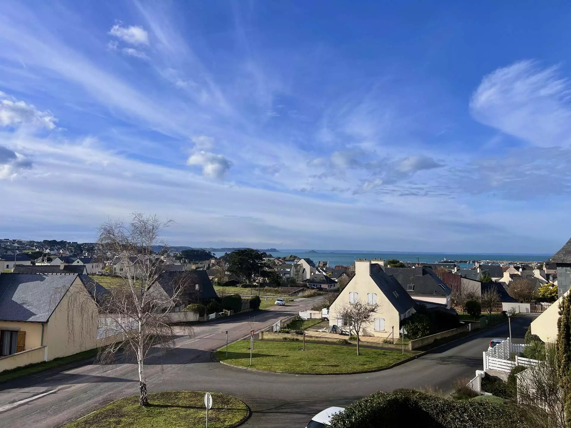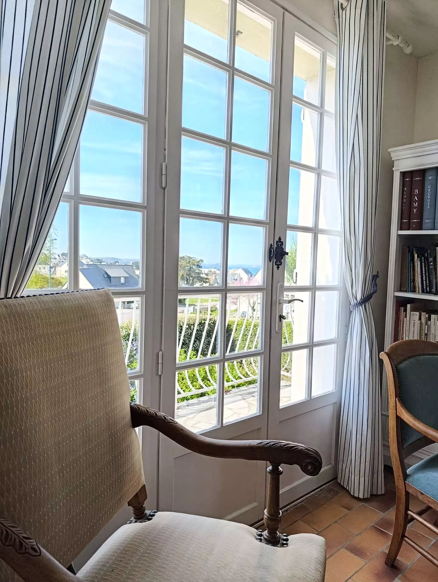 - A living room with a lounge area (TV, sofa, armchairs including one with a massage function) with a view of Erquy on the sea side; and a dining area with a table