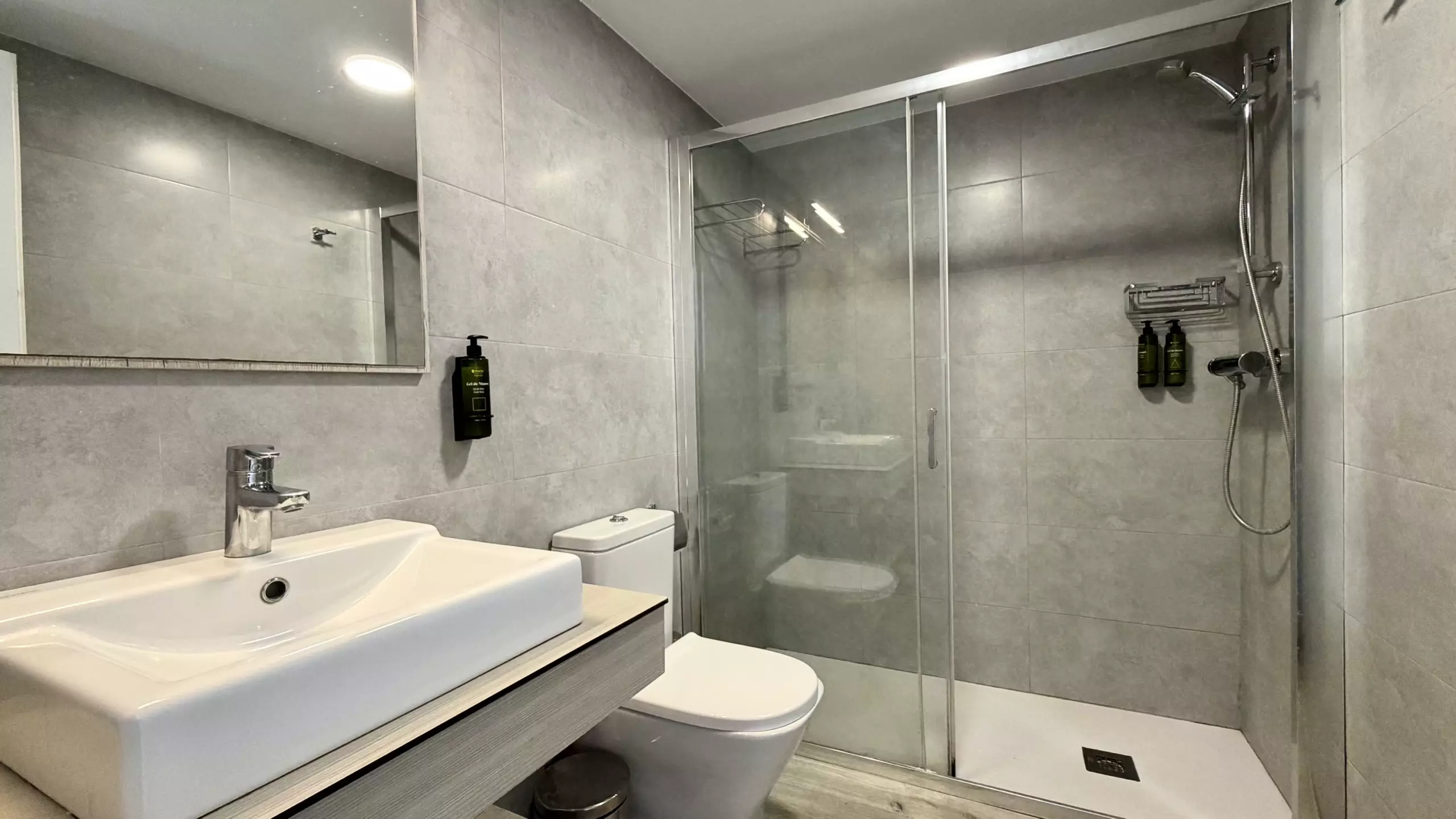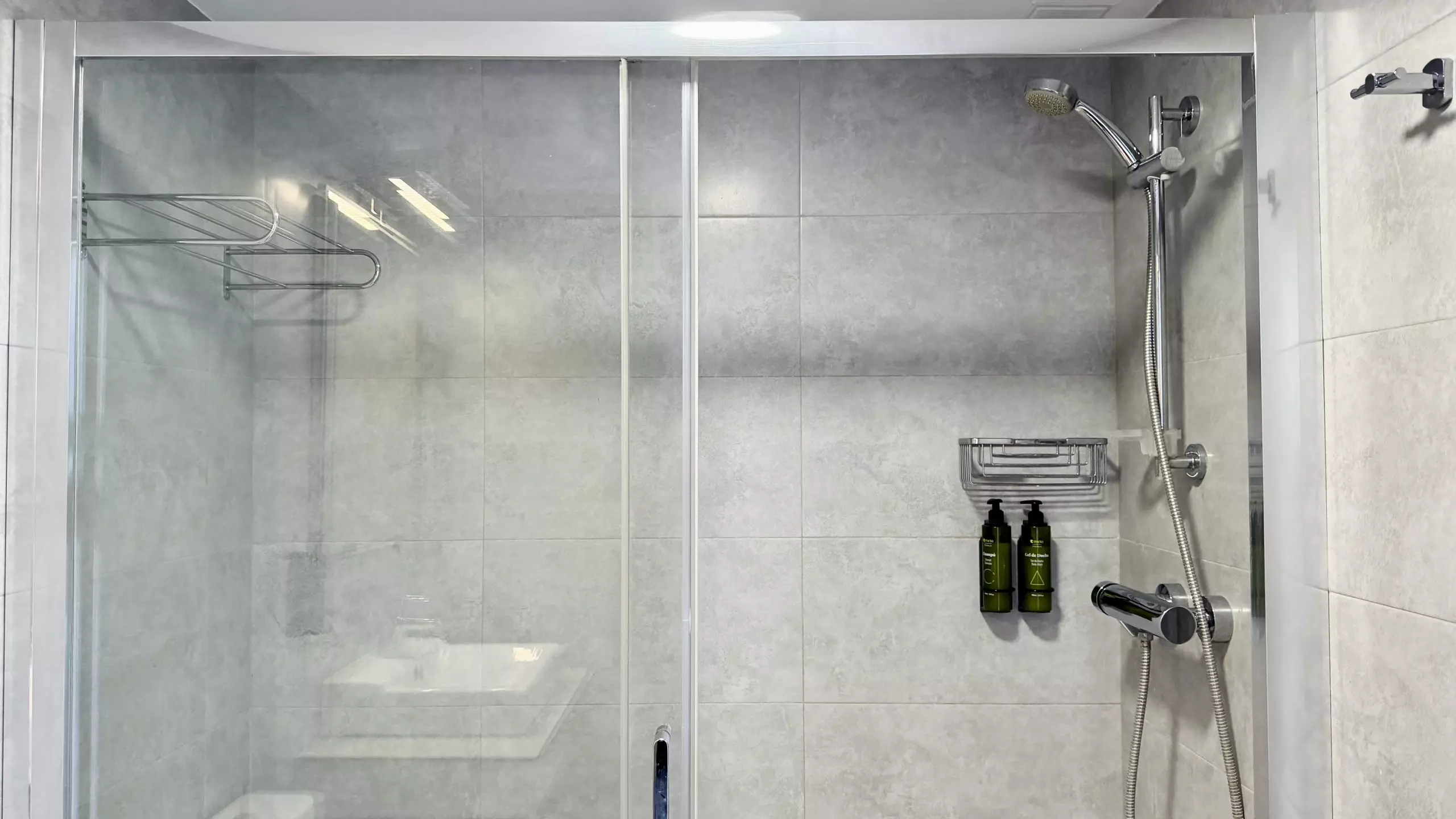 The room includes one double bed and two single beds, offering flexibility for different sleeping arrangements. The bathroom is equipped with a shower, meeting all the basic needs of guests.