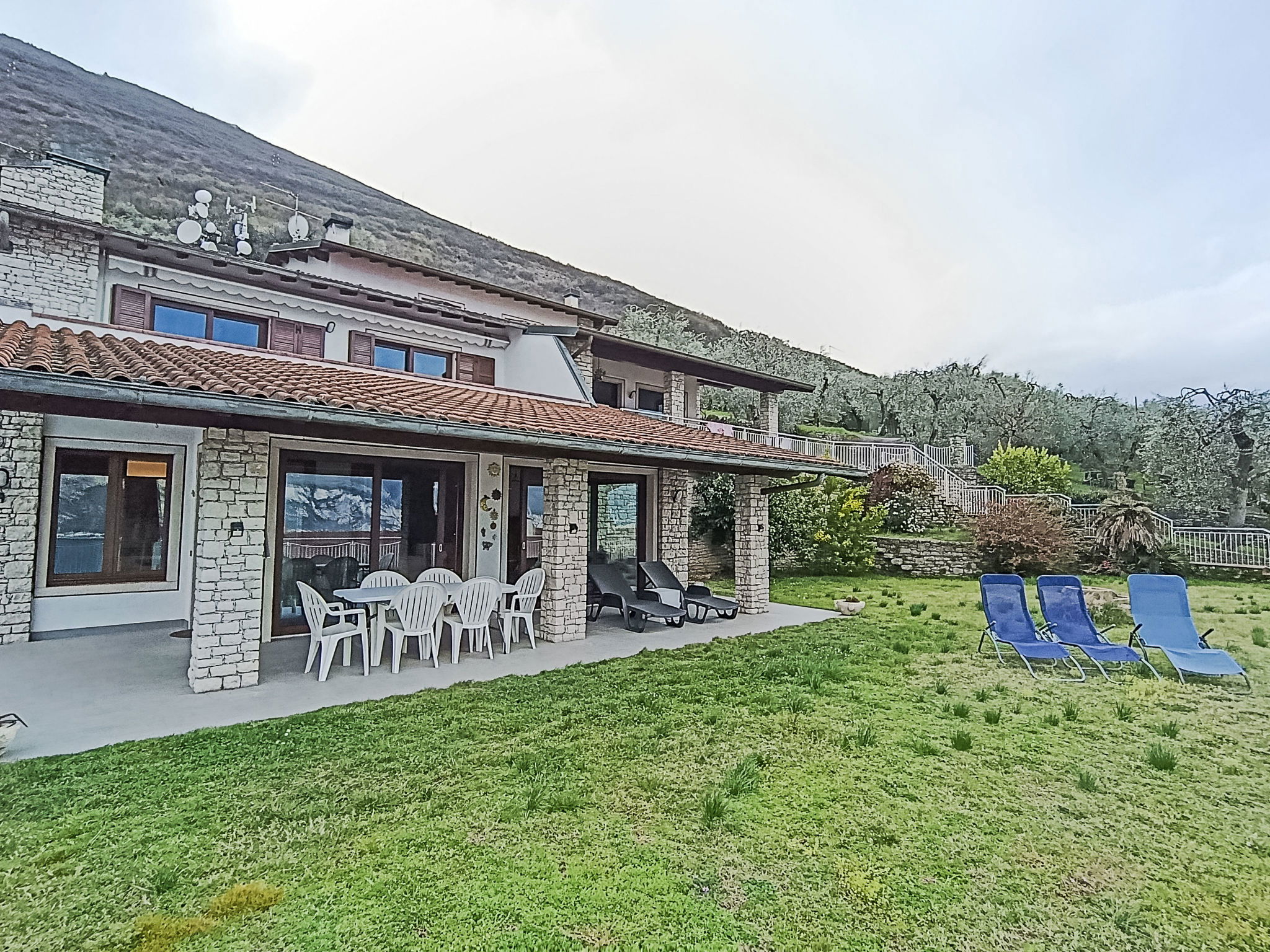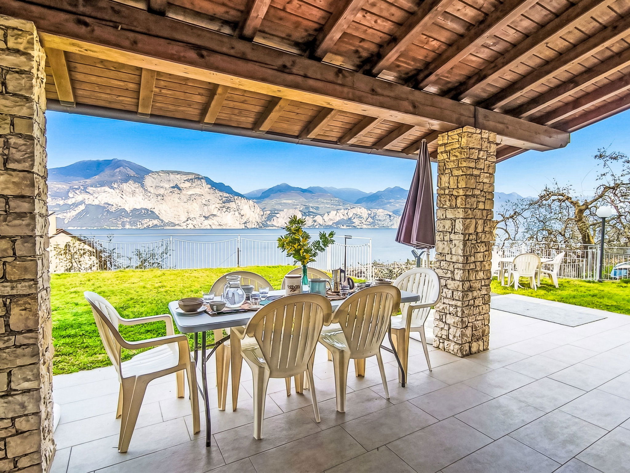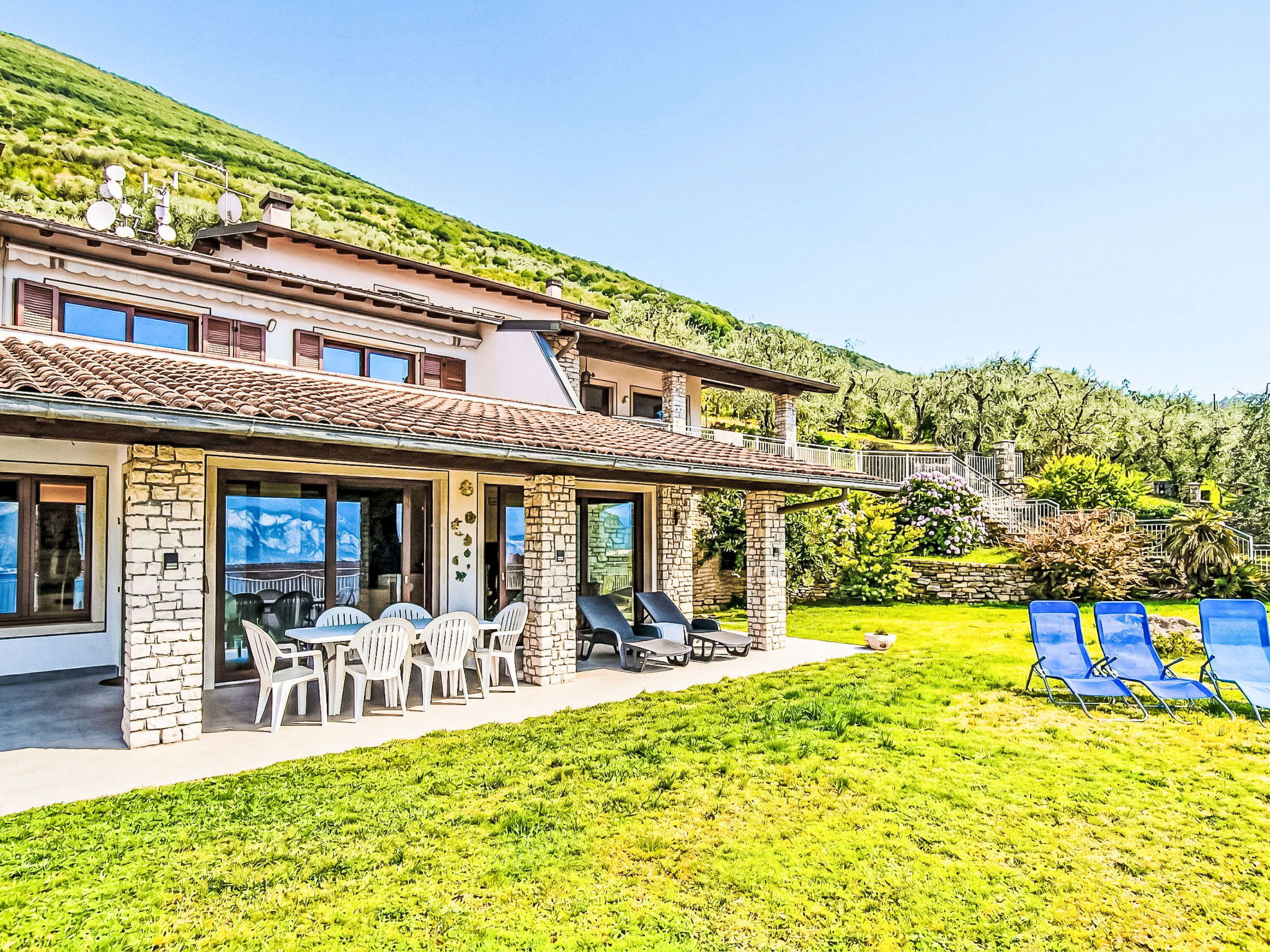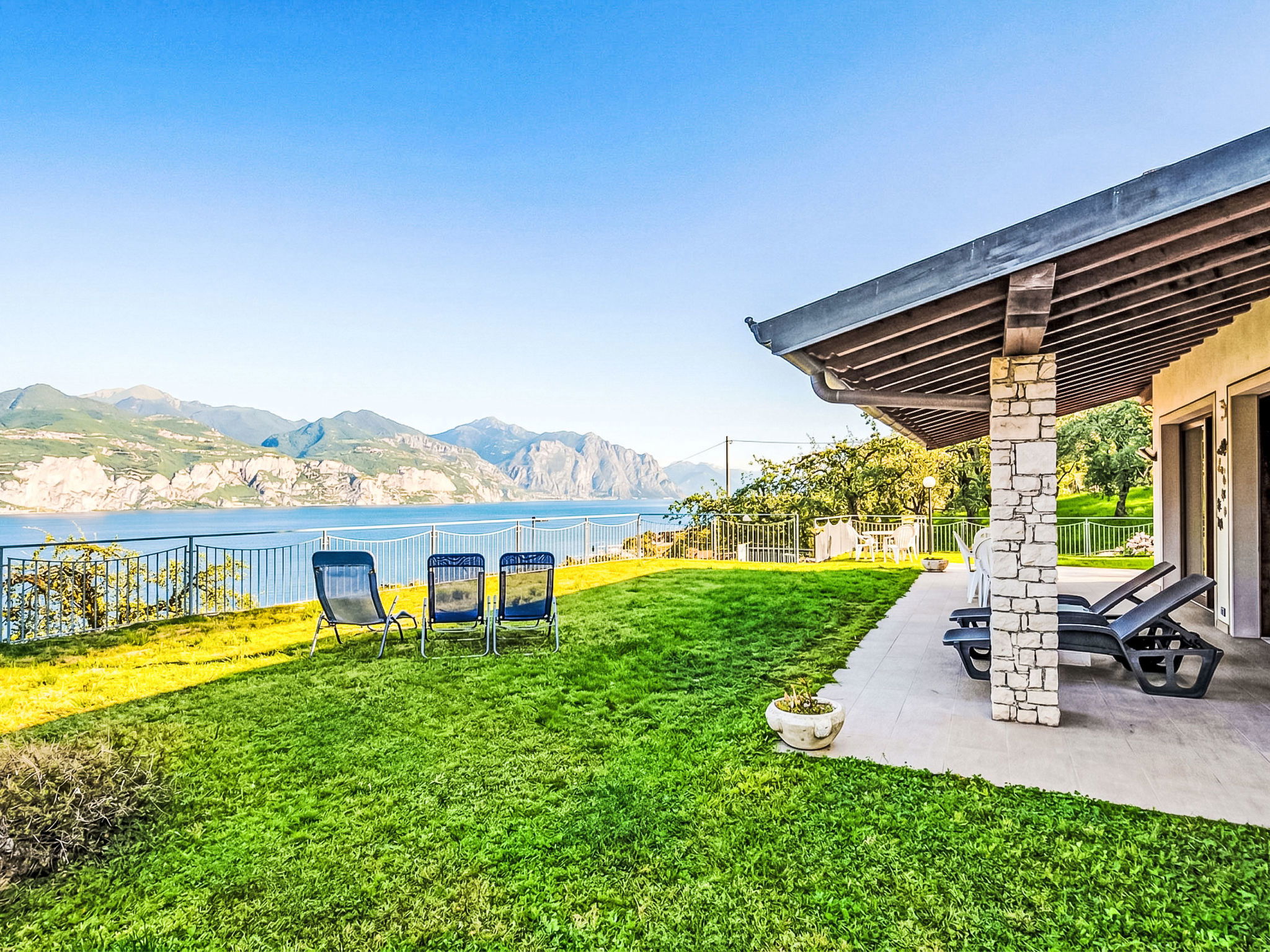 "Manuela", 4-room villa 200 m2 on 2 levels, on the ground floor, south-east facing position. Spacious and bright, comfortable and cosy furnishings: living room with Scandinavian wood stove (only for decoration), digital TV. Exit to the garden, to the patio, south facing position and east facing position. Alcove with 1 double sofabed. Exit to the garden, to the patio. Large kitchen (oven, dishwasher, Gas stove, 5 gas rings, kettle, microwave, freezer, electric coffee machine) with bar, dining table. Exit to the garden, to the patio. Shower/bidet/WC. Heating. Upper floor: 1 double bedroom with 1 bed and 1 double bed. Exit to the terrace. 1 double bedroom with 1 bed and 1 double bed. Exit to the terrace. Bath/shower/bidet/WC. Heating, air-conditioning. Wooden floors. Large terrace, roofed, large patio 60 m2, roofed, large garden 250 m2 and south-east facing position. Terrace furniture, barbecue, deck chairs (8), sitting area. Very beautiful panoramic view of the lake and the mountains. Facilities: washing machine, iron, hair dryer. Internet (WiFi, free). Parking (roofed, 1 car). Please note: maximum 1 pet/ dog allowed. Private entrance, smoke alarm, fire extinguisher, no lift. IT023014B4Q8LFUSS