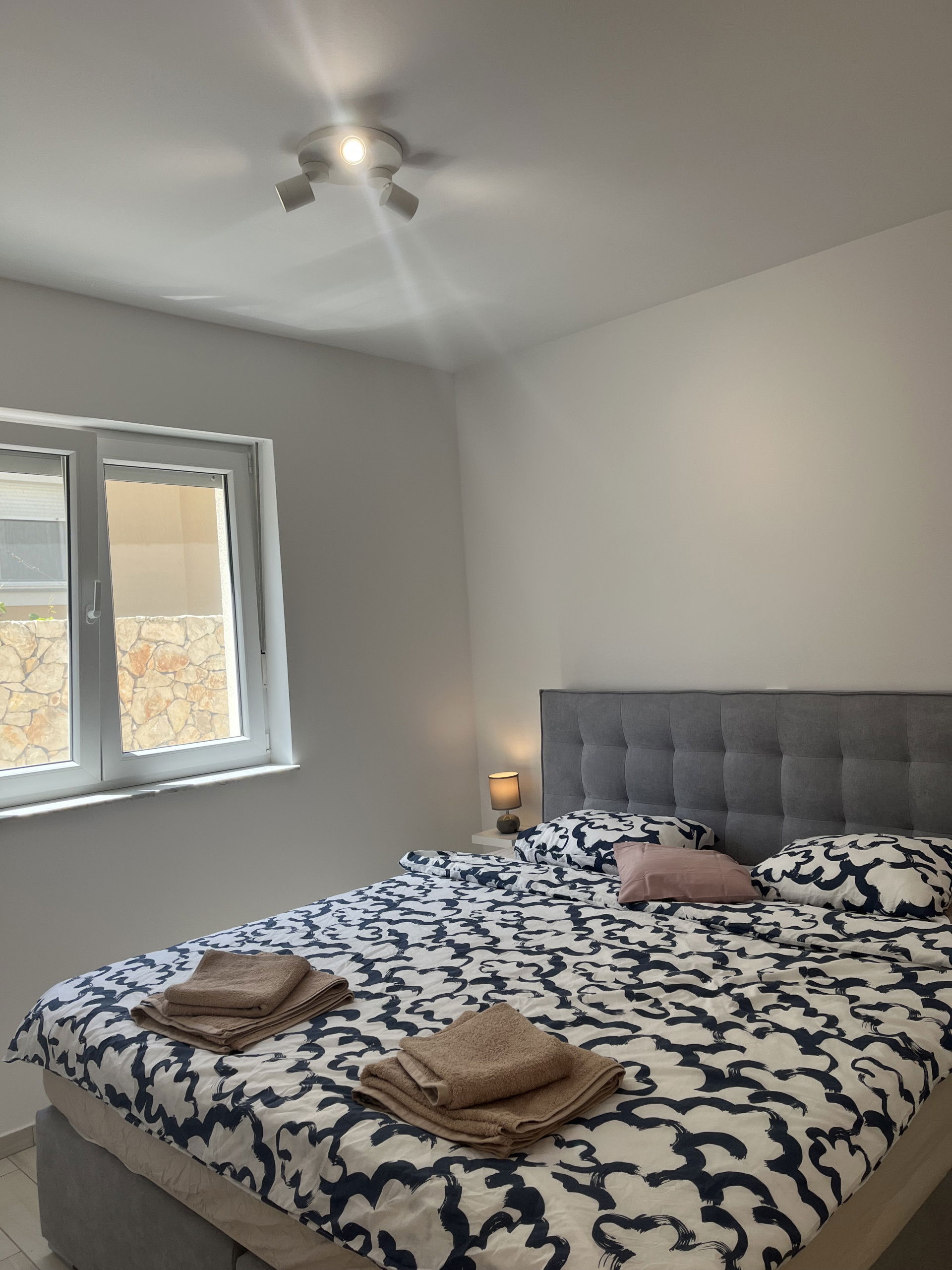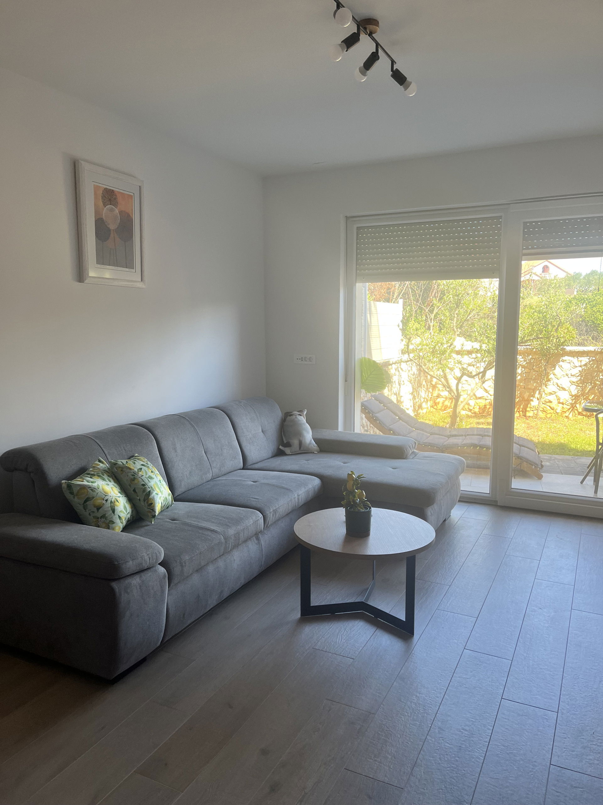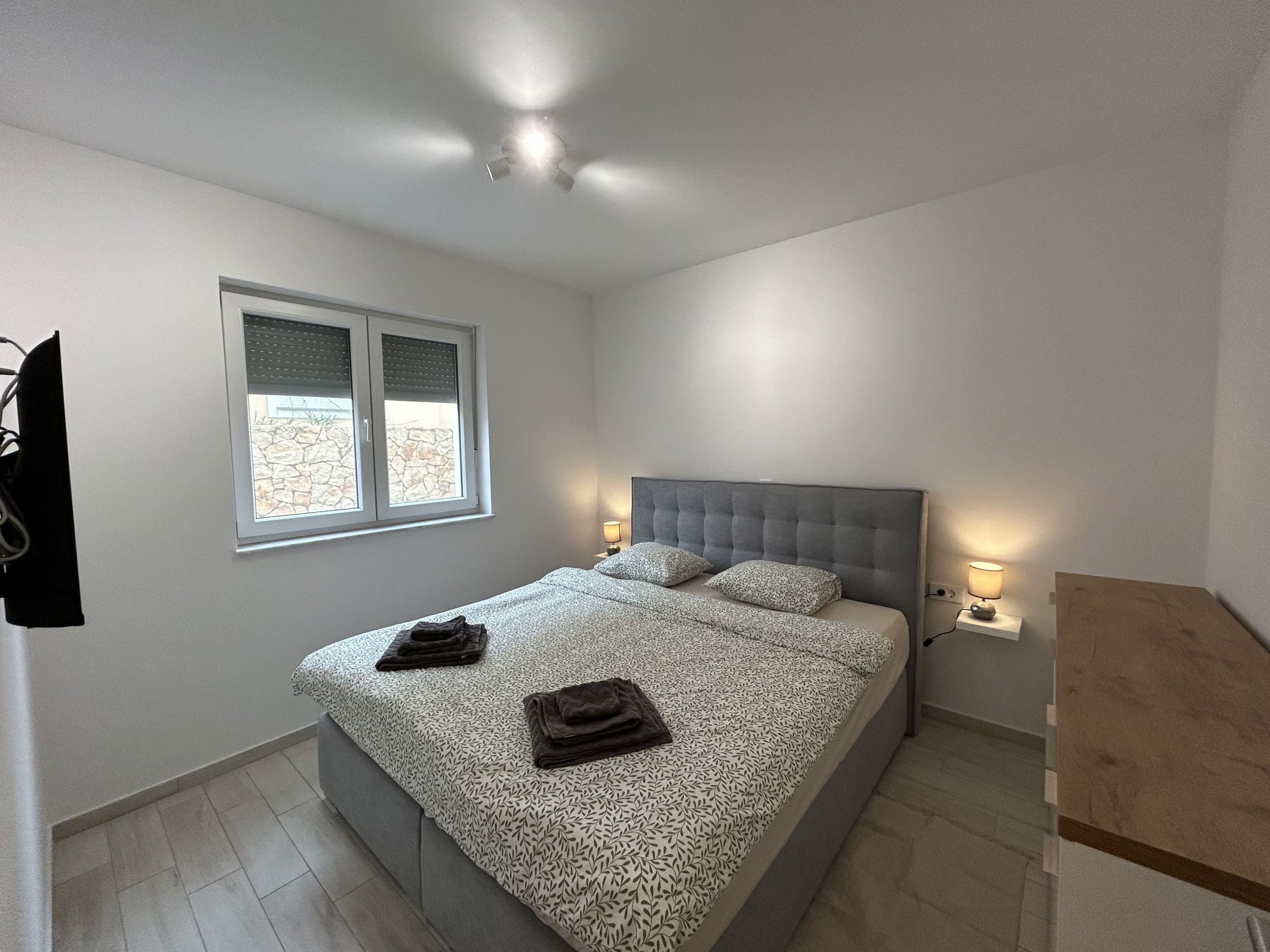 The modern, fully equipped kitchen includes everything needed to prepare traditional Dalmatian dishes, while those who enjoy outdoor cooking can make use of the barbecue. The spacious living room is furnished with a comfortable sofa and a TV, creating a perfect space to unwind after a day in the sun.