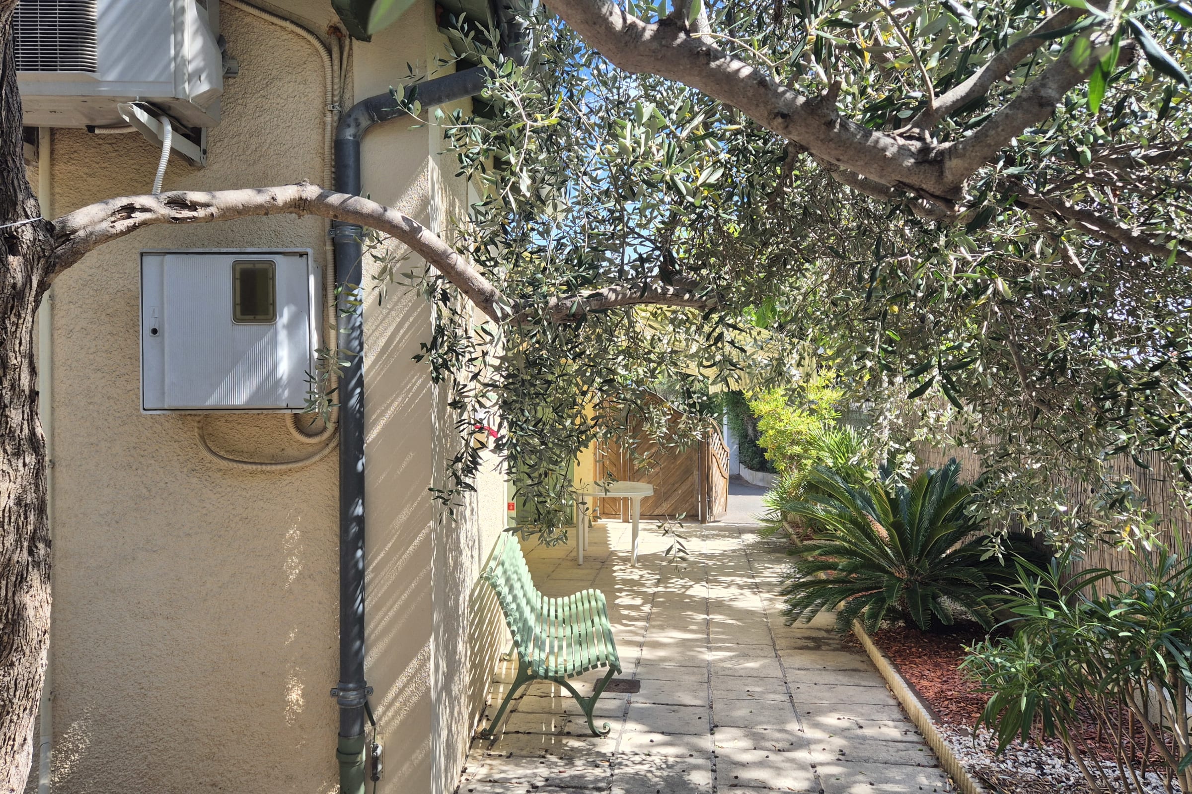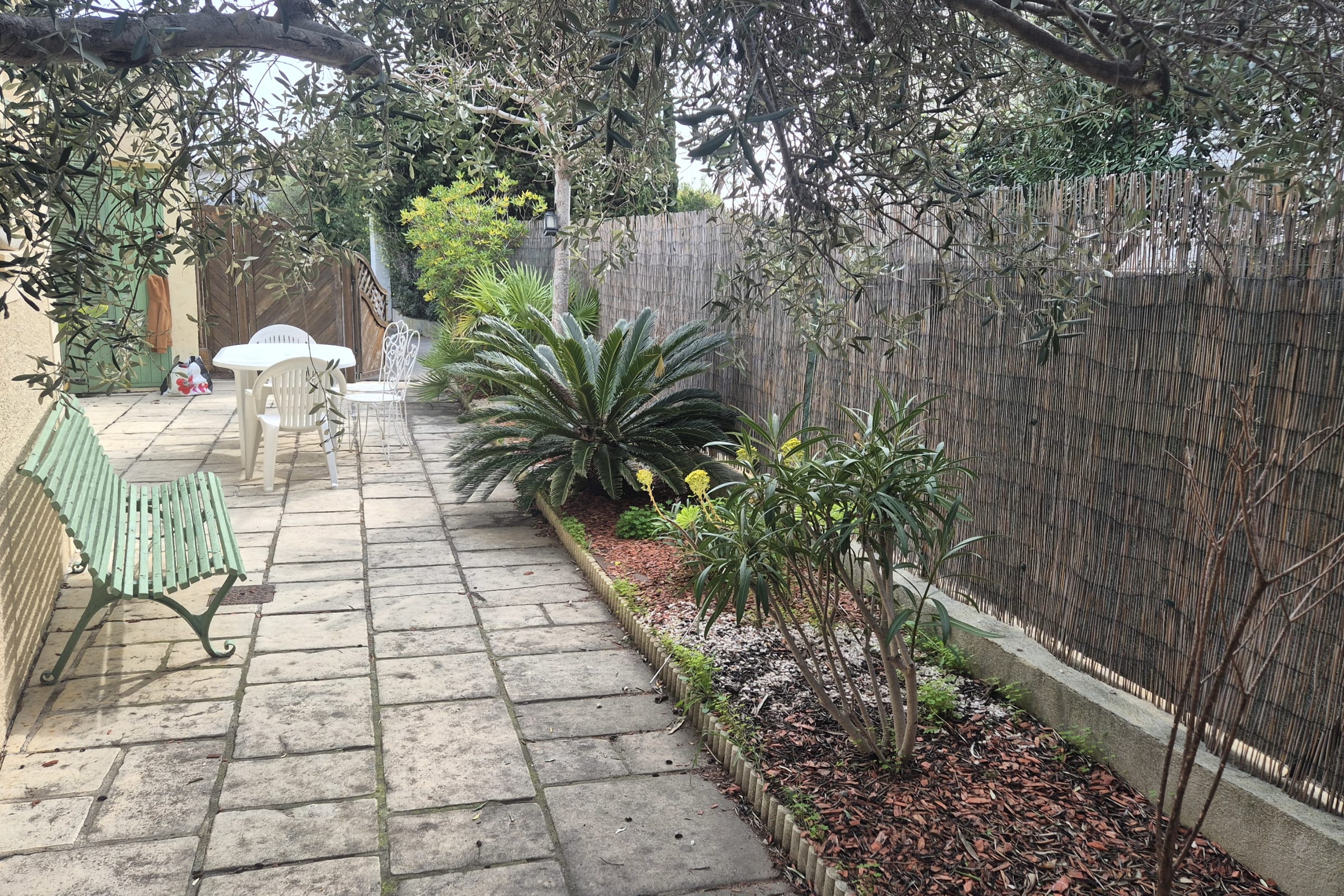 A l'extérieur vous trouverez un bel espace avec coin repas, un jardin méditerranéen et une place de parking privative pour la voiture.