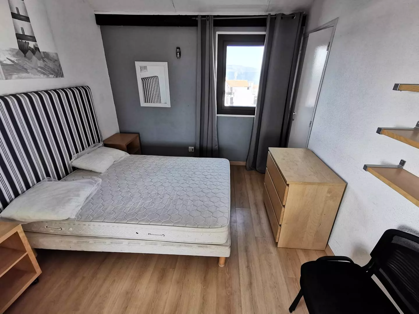 - An open-plan room with a double bed