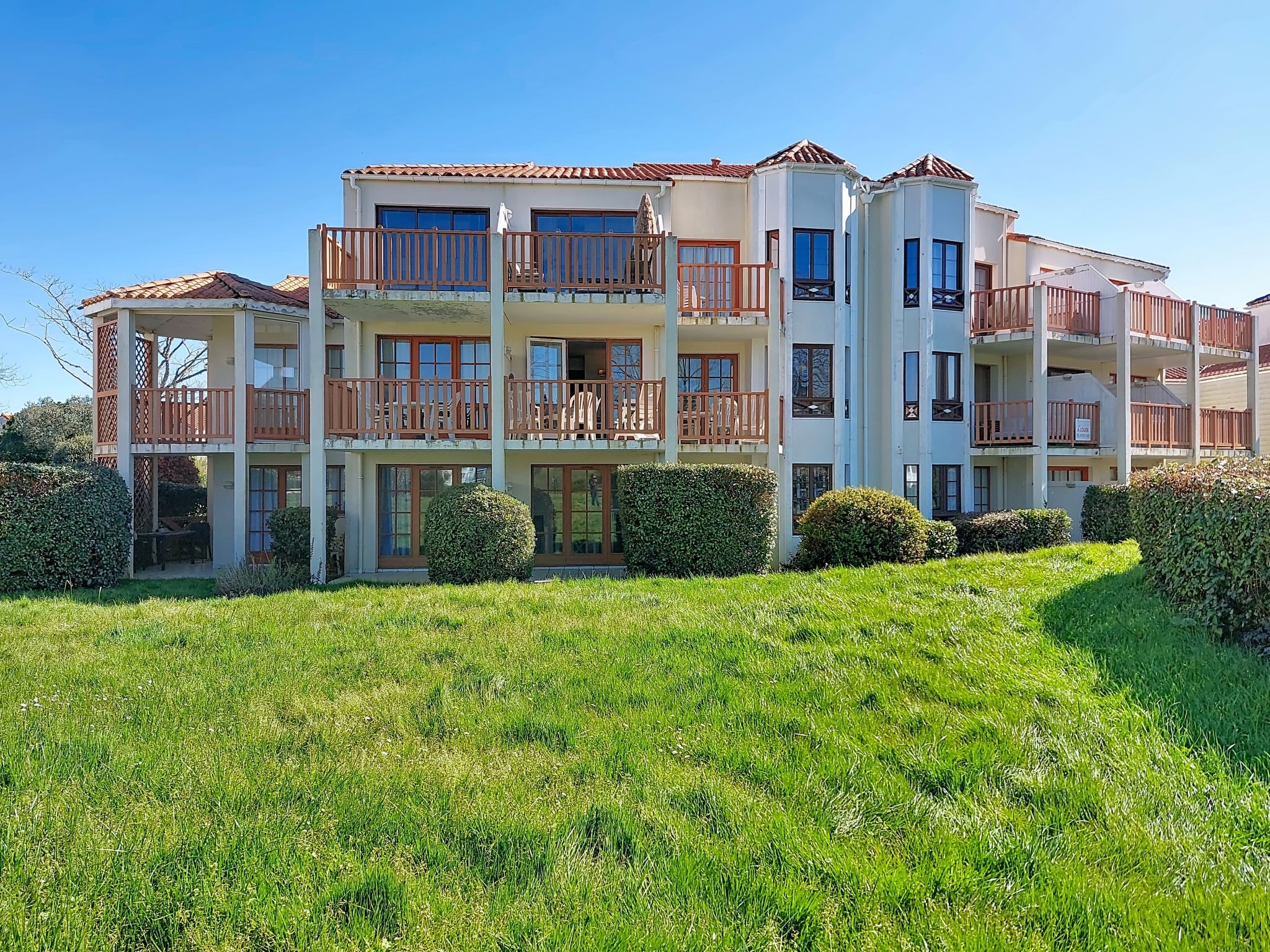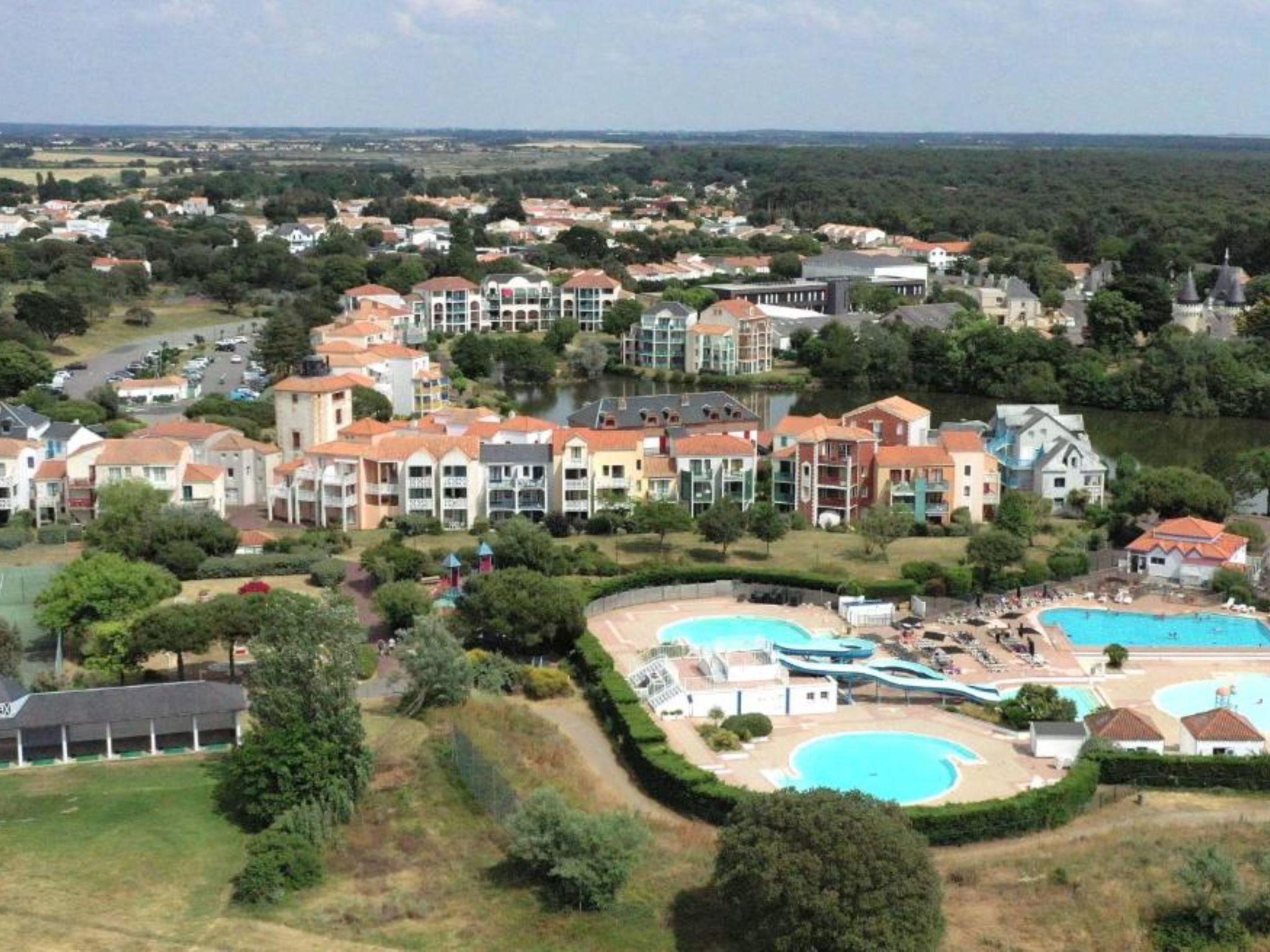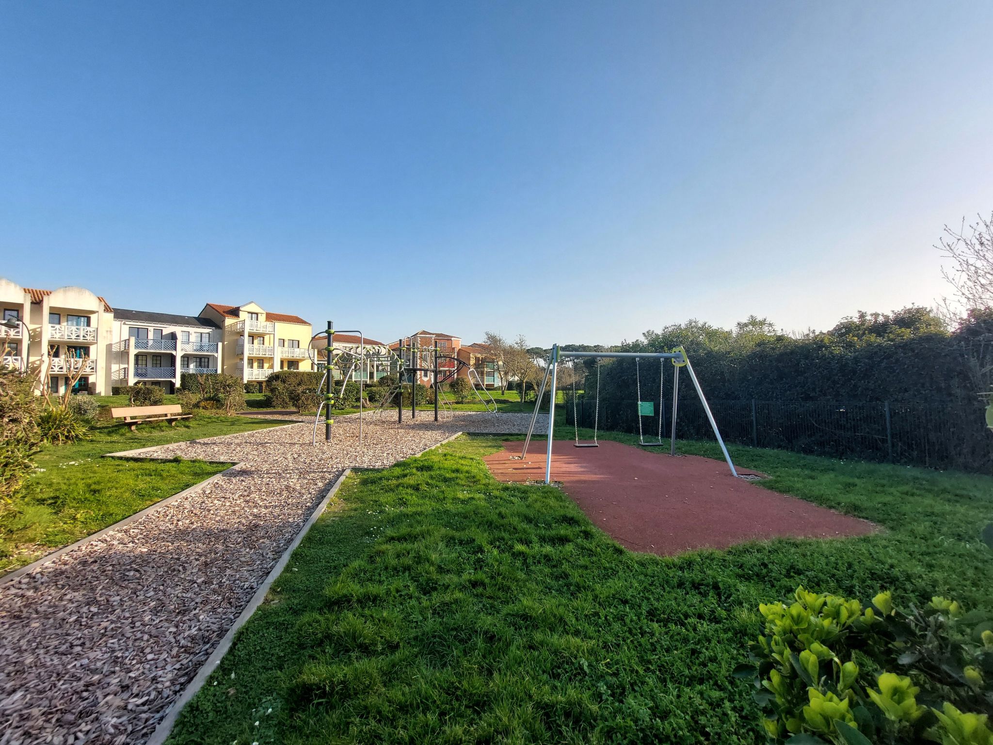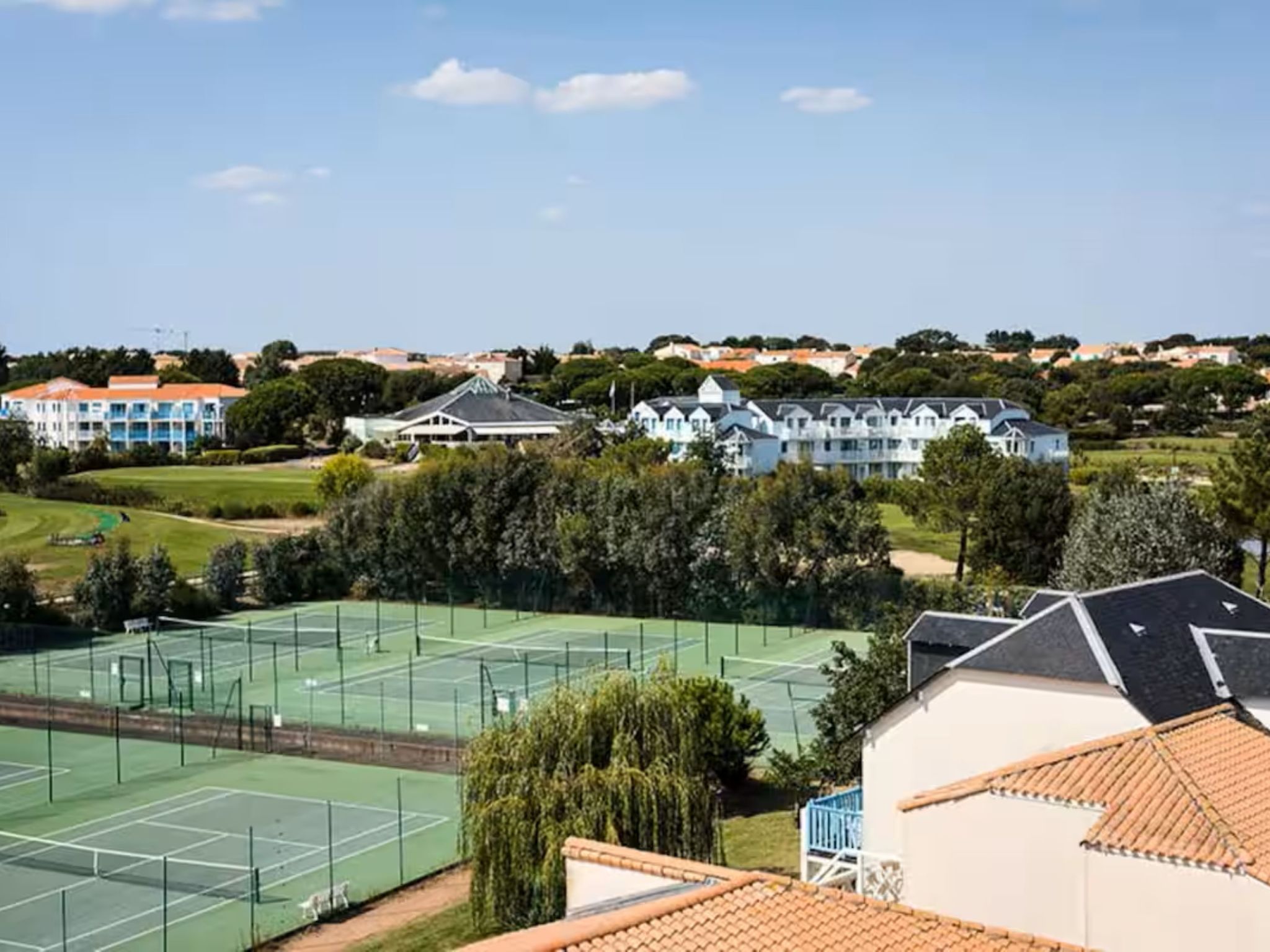 Resort "Les résidences de Port Bourgenay". In the district of Port Bourgenay 6 km from the centre of Talmont Saint Hilaire, excellent location: right in the centre but still quiet, 1.1 km from the sea, 2.6 km from the beach, in a cul-de-sac, in the countryside, on the golf course. For shared use: property 6 ha with lawn and plants, 2 swimming pools heated (seasonal availability: 25.Apr. - 13.Sep.). Shower/WC in the pool area, tennis, children's playground. In the complex: restaurant, bar. Parking. E-charging station. Shop, bicycle rental 900 m, bus stop 500 m, sandy beach "du Veillon" 2.6 km. Sports harbour 1.1 km, golf course (18 hole) 150 m, tennis, minigolf 500 m, walking paths from the house 10 m, cycle lane 100 m. Nearby attractions: Aquarium de Vendée 2 km, La Guittière (Zone naturelle protégée) 10 km, Les Sables d'Olonne 12 km, Zoo 12 km, Ile de Noirmoutier, Puy du Fou 85 km, La Rochelle-Ile de Ré 90 km. Hiking paths: GR8 (sentier côtier balisé) 1 km. Please note: suitable for families.